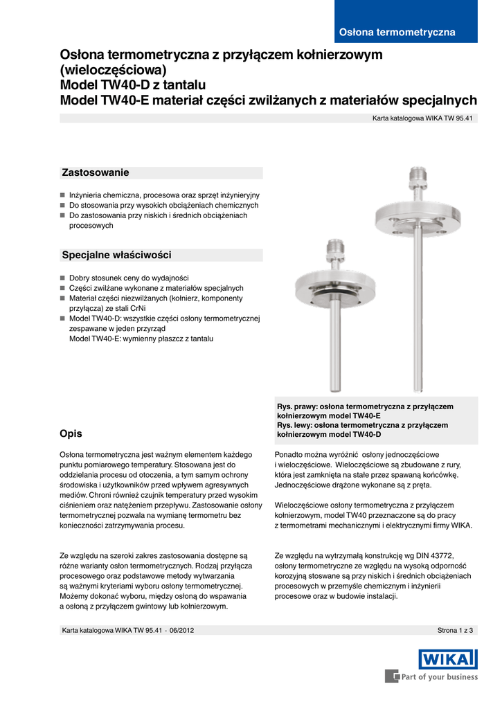 Osłona termometryczna Osłona termometryczna z przyłączem kołnierzowym (wieloczęściowa) Model TW40-D z tantalu Model TW40-E materiał części zwilżanych z materiałów specjalnych Karta katalogowa WIKA TW 95.41 Zastosowanie ■■ Inżynieria chemiczna, procesowa oraz sprzęt inżynieryjny ■■ Do stosowania przy wysokich obciążeniach chemicznych ■■ Do zastosowania przy niskich i średnich obciążeniach procesowych Specjalne właściwości ■■ Dobry stosunek ceny do wydajności ■■ Części zwilżane wykonane z materiałów specjalnych ■■ Materiał części niezwilżanych (kołnierz, komponenty przyłącza) ze stali CrNi ■■ Model TW40-D: wszystkie części osłony termometrycznej zespawane w jeden przyrząd Model TW40-E: wymienny płaszcz z tantalu Opis Rys. prawy: osłona termometryczna z przyłączem kołnierzowym model TW40-E Rys. lewy: osłona termometryczna z przyłączem kołnierzowym model TW40-D Osłona termometryczna jest ważnym elementem każdego punktu pomiarowego temperatury. Stosowana jest do oddzielania procesu od otoczenia, a tym samym ochrony środowiska i użytkowników przed wpływem agresywnych mediów. Chroni również czujnik temperatury przed wysokim ciśnieniem oraz natężeniem przepływu. Zastosowanie osłony termometrycznej pozwala na wymianę termometru bez konieczności zatrzymywania procesu. Ponadto można wyróżnić osłony jednoczęściowe i wieloczęściowe. Wieloczęściowe są zbudowane z rury, która jest zamknięta na stałe przez spawaną końcówkę. Jednoczęściowe drążone wykonane są z pręta. Ze względu na szeroki zakres zastosowania dostępne są różne warianty osłon termometrycznych. Rodzaj przyłącza procesowego oraz podstawowe metody wytwarzania są ważnymi kryteriami wyboru osłony termometrycznej. Możemy dokonać wyboru, między osłoną do wspawania a osłoną z przyłączem gwintowy lub kołnierzowym. Ze względu na wytrzymałą konstrukcję wg DIN 43772, osłony termometryczne ze względu na wysoką odporność korozyjną stoswane są przy niskich i średnich obciążeniach procesowych w przemyśle chemicznym i inżynierii procesowe oraz w budowie instalacji. Karta katalogowa WIKA TW 95.41 ∙ 06/2012 Wieloczęściowe osłony termometryczna z przyłączem kołnierzowym, model TW40 przeznaczone są do pracy z termometrami mechanicznymi i elektrycznymi firmy WIKA. Strona 1 z 3 Inne przyłącza procesowe Materiały części zwilżanych osłony temometrycznej Hastelloy C4 (2.4610), hastelloy C276 (2.4819), monel 400 (2.4360), tytan Grade 2 (3.7035) 1), tantal Podkładka kołnierza wg EN 1092-1 z przylgą forma B1 wg DIN 2527 z przylgą forma C wg DIN 2526 wg ASME B16.5 z przylgą forma RF (dla tantalu przylga gładka) Rozmiar nominalny wg EN 1092-1, DIN 2527: wg ASME: DN 25, DN 40, DN 50 1", 1 ½", 2" Klasa ciśnieniowa wg EN 1092-1, DIN 2527: wg ASME: PN 16 ... 40 150 lbs, 300 lbs, 600 lbs Przyłącze do termometru M24 x 1,5 ruchome lub gwinty wew. G ½, ½ NPT Rura Ø 13,7 x 2,2 mm Otwór Ø 9,3 mm Płaszcz z tantalu, otwór 12 x 0,4 mm dla otworu 7 mm 16 x 0,4 mm dla otworu 9 mm 13 x 0,4 mm dla otworu 6,1 mm Długość zanurzeniowa U1 Według specyfikacji klienta Długość całkowita L Długość zanurzeniowa U1 2) + 80 mm Maks. przyłącze procesowe, ciśnienie procesowe Zależne od ■■ Wersja osłony termometrycznej - Wymiary - Materiał - Ciśnienie kołnierza ■■ Warunki procesowe - szybkość przepływu - gęstość medium 1) W przypadku tytanu klasy 2 (3.7035) kołnierz wraz z jego komponentami nie jest przyspawany na stałe do rury 2) Dla wersji z pokryciem z tantalu, długość zanurzeniowa U1 będzie dłuższa o 3 mm Opcjonalnie ■■ Inne materiały i wymiary ■■ Gwint wewnętrzny ■■ Certyfikaty i świadectwa Więcej informacji na temat kalkulacji osłon termometrycznych znajduje się w informacji technicznej Wymiary w mm TW40-D IN 00.15. TW40-D-M5 TW40-E-M5 Rury Legenda: L długość całkowita N M długość szyjki przedłużeniowej (min. U1 Ø d1 60 mm) Strona 2 z 3 Przyłącze do termometru Długość zanurzeniowa Otwór Ø F1 Ø FT S S1 Zew. średnica osłony termometrycznej Zewnętrzna średnica płaszcza z tantalu Grubość ścianki Grubość końcówki Karta katalogowa WIKA TW 95.41 ∙ 06/2012 11319615.01 Opcjonlanie: gwinty wew. Model TW40-D Wymiary w mm N M24 x 1,5 G½ ½ NPT Ø F1 S 13,7 13,7 13,7 2,2 2,2 2,2 Waga w kg Kołnierz DN 25 M U1 = 100 mm 80 80 80 1,50 1,50 1,50 Dodatkowa waga innych kołnierzy PN 16 ... 40 DN 40 DN 50 1" 1" 1" 1 ½" 1 ½" 1 ½" U1 = 500 mm 1,90 1,90 1,90 PN 16 ... 40 PN 16 ... 40 150 lbs 300 lbs 600 lbs 150 lbs 300 lbs 600 lbs +0,76 kg +1,63 kg –0,46 kg +0,04 kg +0,22 kg +0,22 kg +1,34 kg +1,85 kg Model TW40-D-M5 (tantal) Wymiary w mm N M24 x 1,5 M24 x 1,5 M24 x 1,5 Ø FT 12 x 0,4 16 x 0,4 13 x 0,4 Ø d1 Ø F1 x S 7 9 6,1 S1 11 x 2 15 x 3 12 x 2,5 M 2,5 3,5 5 80 80 82 Odpowiednie długości zanurzeniowe termometru mechanicznego Forma budowy złącza S, 3, 4, 5 2 Długość zanurzeniowa czujnika l1 l1 = L - 10 mm lub l1 = U1 + M - 10 mm l1 = L - 30 mm lub l1 = U1 + M - 30 mm Chropowatość powierzchni uszczelnienia Norma kołnierza ASME B16.5 EN 1092-1 06/2016 PL based on 06/2012 D DIN 2527 Stock finish Smooth finish Forma B1 Forma B2 Forma C Forma E AARH w µcalach 125 ... 250 < 125 - Ra w µm 3,2 ... 6,3 < 3,2 3,2 ... 12,5 0,8 - 3,2 - Rz w µm 12,5 ... 50 3,2 ... 12,5 40 ... 160 < 16 Dane do zamówienia Model / forma osłony termometrycznej / wymiar rury / rozmiar nominalny DN / zakres ciśnienia PN / przylga / przyłącze do termometru / długość zanurzeniowa U1 / długość całkowita L / materiał osłony termometrycznej / montaż z termometrem / certyfikat / opcjonalnie © 2007 WIKA Alexander Wiegand SE & Co. KG, wszelkie prawa zastrzeżone Specyfikacje i wymiary podane w niniejszej karcie przedstawiają stan konstrukcyjny aktualny w momencie wydruku. Istnieje możliwość wprowadzenia modyfikacji i zmian specyfikacji mater