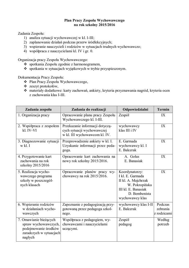 Plan Pracy Zespołu Wychowawczego