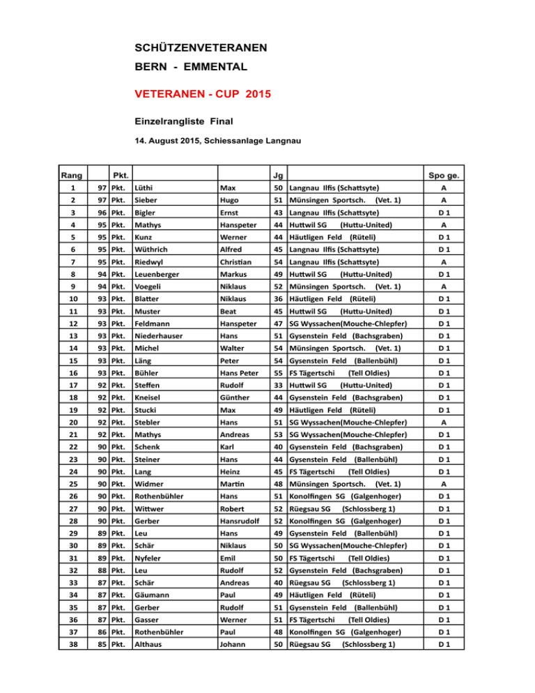 SCHÜTZENVETERANEN BERN - EMMENTAL VETERANEN - CUP 2015 Einzelrangliste Final 14. August 2015, Schiessanlage Langnau Rang Pkt. Jg Spo ge. 1 97 Pkt. Lüthi Max 50 Langnau Ilfis (Scha<syte) A 2 97 Pkt. Sieber Hugo 51 Münsingen Sportsch. (Vet. 1) A 3 96 Pkt. Bigler Ernst 43 Langnau Ilfis (Scha<syte) 4 95 Pkt. Mathys Hanspeter 44 Hu<wil SG (Hu<u-‐United) 5 95 Pkt. Kunz Werner 44 Häutligen Feld (Rüteli) D 1 6 95 Pkt. Wüthrich Alfred 45 Langnau Ilfis (Scha<syte) D 1 7 95 Pkt. Riedwyl Chris[an 54 Langnau Ilfis (Scha<syte) A 8 94 Pkt. Leuenberger Markus 49 Hu<wil SG (Hu<u-‐United) 9 94 Pkt. Voegeli Niklaus 52 Münsingen Sportsch. (Vet. 1) 10 93 Pkt. Bla<er Niklaus 36 Häutligen Feld (Rüteli) D 1 11 93 Pkt. Muster Beat 45 Hu<wil SG (Hu<u-‐United) D 1 12 93 Pkt. Feldmann Hanspeter 47 SG Wyssachen(Mouche-‐Chlepfer) D 1 13 93 Pkt. Niederhauser Hans 51 Gysenstein Feld (Bachsgraben) D 1 14 93 Pkt. Michel Walter 54 Münsingen Sportsch. (Vet. 1) D 1 15 93 Pkt. Läng Peter 54 Gysenstein Feld (Ballenbühl) D 1 16 93 Pkt. Bühler Hans Peter 55 FS Tägertschi (Tell Oldies) D 1 17 92 Pkt. Steffen Rudolf 33 Hu<wil SG (Hu<u-‐United) D 1 18 92 Pkt. Kneisel Günther 44 Gysenstein Feld (Bachsgraben) D 1 19 92 Pkt. Stucki Max 49 Häutligen Feld (Rüteli) D 1 20 92 Pkt. Stebler Hans 51 SG Wyssachen(Mouche-‐Chlepfer) A 21 92 Pkt. Mathys Andreas 53 SG Wyssachen(Mouche-‐Chlepfer) D 1 22 90 Pkt. Schenk Karl 40 Gysenstein Feld (Bachsgraben) D 1 23 90 Pkt. Steiner Hans 44 Gysenstein Feld (Ballenbühl) D 1 24 90 Pkt. Lang Heinz 45 FS Tägertschi (Tell Oldies) D 1 25 90 Pkt. Widmer Mar[n 48 Münsingen Sportsch. (Vet. 1) A 26 90 Pkt. Rothenbühler Hans 51 Konolfingen SG (Galgenhoger) D 1 27 90 Pkt. Wi<wer Robert 52 Rüegsau SG (Schlossberg 1) D 1 28 90 Pkt. Gerber Hansrudolf 52 Konolfingen SG (Galgenhoger) D 1 29 89 Pkt. Leu Hans 49 Gysenstein Feld (Ballenbühl) D 1 30 89 Pkt. Schär Niklaus 50 SG Wyssachen(Mouche-‐Chlepfer) D 1 31 89 Pkt. Nyfeler Emil 50 FS Tägertschi (Tell Oldies) D 1 32 88 Pkt. Leu Rudolf 52 Gysenstein Feld (Bachsgraben) D 1 33 87 Pkt. Schär Andreas 40 Rüegsau SG (Schlossberg 1) D 1 34 87 Pkt. Gäumann Paul 49 Häutligen Feld (Rüteli) D 1 35 87 Pkt. Gerber Rudolf 51 Gysenstein Feld (Ballenbühl) D 1 36 87 Pkt. Gasser Werner 51 FS Tägertschi (Tell Oldies) D 1 37 86 Pkt. Rothenbühler Paul 48 Konolfingen SG (Galgenhoger) D 1 38 85 Pkt. Althaus Johann 50 Rüegsau SG (Schlossberg 1) D 1 D 1 A D 1 A 39 85 Pkt. Rothenbühler Walter 52 Konolfingen SG (Galgenhoger) D 2 40 84 Pkt. Gerber Hans 47 Rüegsau SG (Schlossberg 1) D 1