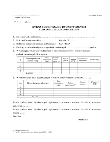 ……………………………… Zał. 5 do ZW 86/2016 (pieczęć Wydziału) W- / / / 20….. WYKAZ GODZIN ZAJĘĆ DYDAKTYCZNYCH ZLECONYCH DOKTORANTOWI 1. Imię i nazwisko doktoranta ……………………………………………………………….. 2. Rok studiów doktoranckich ……… Wydział W- …….. 3. Doktorant pobiera stypendium doktoranckie: TAK / NIE* 4. Ustalony wymiar obowiązkowych praktyk zawodowych ………………………… godzin. 5. Wykaz zajęć dydaktycznych zleconych w semestrach zimowym i letnim w ramach praktyk zawodowych i ich wymiar: Lp. Kursy (praktyka zawodowa) Data rozpoczęcia zajęć Rodzaj zajęć/ język ** Wymiar godzin Semestr Z/L Samodzielnie/ współudział Prowadzący 1. 2. 3. 4 RAZEM 6. Wymiar i wykaz zajęć dydaktycznych w ramach umowy zlecenia (semestr ……….) Lp. Kursy (umowa-zlecenie) Data rozpoczęcia zajęć Rodzaj zajęć/język** Liczba godzin Wrocław / ZOD 1 2 3 4 RAZEM Liczba godzin zajęć dydaktycznych wykonanych w ramach umowy zlecenia w semestrze zimowym……… Liczba godzin zajęć dydaktycznych wykonanych w ramach umowy zlecenia w semestrze letnim……… Wrocław, ……………. DZIEKAN * - niepotrzebne skreślić ** - język w jakim prowadzone są zajęcia (a-angielski; p-polski)