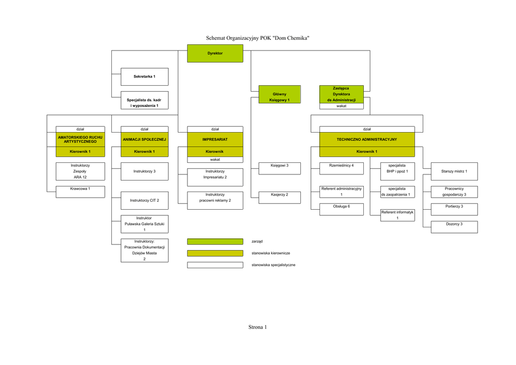 Schemat Organizacyjny POK "Dom Chemika" Dyrektor Sekretarka 1 Zastępca Specjalista ds. kadr Główny Dyrektora Księgowy 1 ds Administracji i wyposażenia 1 wakat dział dział dział dział AMATORSKIEGO RUCHU ARTYSTYCZNEGO ANIMACJI SPOŁECZNEJ IMPRESARIAT TECHNICZNO ADMINISTRACYJNY Kierownik 1 Kierownik 1 Kierownik Kierownik 1 wakat Instruktorzy Zespoły Księgowi 3 Instruktorzy 3 ARA 12 Rzemieślnicy 4 Instruktorzy specjalista BHP i ppoż 1 Starszy mistrz 1 Impresariatu 2 Krawcowa 1 Referent administracyjny Instruktorzy Instruktorzy CIT 2 Kasjerzy 2 1 specjalista ds zaopatrzenia 1 Pracownicy gospodarczy 3 pracowni reklamy 2 Obsługa 6 Portierzy 3 Referent informatyk Instruktor 1 Puławska Galeria Sztuki Dozorcy 3 1 Instruktorzy: zarząd Pracownia Dokumentacji Dziejów Miasta stanowiska kierownicze 2 stanowiska specjalistyczne Strona 1