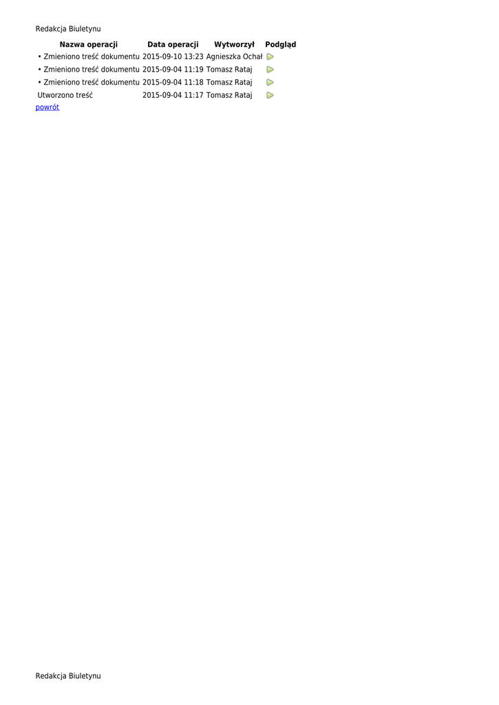 Redakcja Biuletynu Nazwa operacji Data operacji Wytworzył • Zmieniono treść dokumentu 2015-09-10 13:23 Agnieszka Ochał • Zmieniono treść dokumentu 2015-09-04 11:19 Tomasz Rataj • Zmieniono treść dokumentu 2015-09-04 11:18 Tomasz Rataj Utworzono treść powrót Redakcja Biuletynu 2015-09-04 11:17 Tomasz Rataj Podgląd