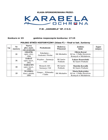 KLASA SPONSOROWANA PRZEZ: P.W. „KARABELA” SP. Z O.O. Konkurs nr 23 godzina rozpoczęcia konkursu: 17:15 POLSKI STRÓJ HISTORYCZNY (klasa F) – finał w kat. Juniorzy Lp Nr startowy 21 31 32 33 Nazwa płeć, maść, rok urodzenia GRAFIK ogier, siwy, 1996 SABAT ogier, kaszt., 2002 SARACEN ogier, kaszt., 1999 WANDEA klacz, gniada, 2000 Pochodzenie Hodowca Właściciel Jeździec Klub Eukaliptus – Gaskonia / Probat SK Michałów Oliwia Kowal KJ im. 1 Pułku Strzelców Konnych w Michałowie Wojsław – Sarmacja / Gil SK Janów Podlaski Łukasz Kuzawiński KJ Janów Podlaski Monarch AH – Sarmacja / Gil SK Janów Podlaski Matylda Kowalik KJ Janów Podlaski Ganges – Wilnianka / Tallin SK Michałów Marta Kulczyńska KJ im. 1 Pułku Strzelców Konnych w Michałowie Zajęte miejsce KLASA SPONSOROWANA PRZEZ: P.W. „KARABELA” SP. Z O.O. Konkurs nr 24 godzina rozpoczęcia konkursu: 18:00 POLSKI STRÓJ HISTORYCZNY (klasa F) – finał w kat. Seniorzy Lp Nr startowy 1 3 2 14 3 15 Nazwa płeć, maść, rok urodzenia ALMANZOR ogier, siwy, 2009 ECHO ORFEUSZ ogier, siwy, 2011 EFOROS wałach, siwy, 2011 Pochodzenie Hodowca Właściciel Jeździec Klub El Nabila B – Alantina / Emigrant SK Janów Podlaski Natalia Ciman KJ Janów Podlaski Psytadel – Echo Kaliope / Piaff Krzysztof Poszepczyński Danuta Konończuk KJ Damadana Balon – Efuzja / Emigrant SK Janów Podlaski Jagoda Kowalska Jagoda Kowalska KJ „Sokół” Świniary 4 17 EL OMARI ogier, kaszt., 2008 5 22 KABSZTAD ogier, siwy, 2006 Poganin – Kwestura / Monogramm SK Michałów 29 PEDAGOG ogier, gniady, 2001 Pilot – Pętla / Visbaden SK Janów Podlaski Dorota Kałuba & Bogdan Strójwąs 6 Enzo – Embra / Monogramm SK Michałów Krzysztof Cyra KJ im. 1 Pułku Strzelców Konnych w Michałowie Maria Szyper KJ im. 1 Pułku Strzelców Konnych w Michałowie Aleksandra Sójka WKJ Lublin SJ For Pleasure Zajęte miejsce