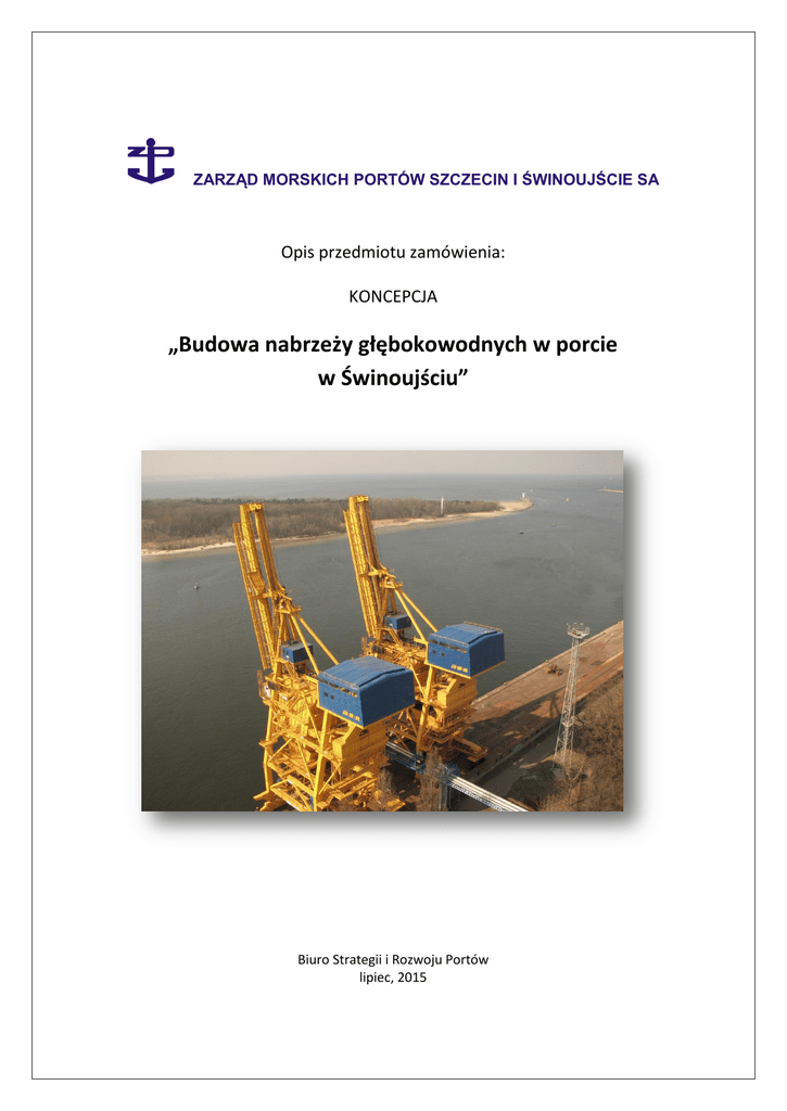 ZARZĄD MORSKICH PORTÓW SZCZECIN I ŚWINOUJŚCIE SA Opis przedmiotu zamówienia: KONCEPCJA „Budowa nabrzeży głębokowodnych w porcie w Świnoujściu” Biuro Strategii i Rozwoju Portów lipiec, 2015 „Budowa nabrzeży głębokowodnych w porcie w Świnoujściu” Spis treści 1. Wstęp .............................................................................................................................................. 3 2. Przedmiot i zakres opracowania ..................................................................................................... 3 3. Uwarunkowania planistyczne.......................................................................................................... 7 4. Zakres inwestycji ............................................................................................................................. 7 2 „Budowa nabrzeży głębokowodnych w porcie w Świnoujściu” 1. Wstęp W związku z planowanymi przez Urząd Morski w Szczecinie inwestycjami związanymi z poszerzeniem i pogłębieniem do 14,5 m toru w porcie w Świnoujściu do wysokości nabrzeża Portowców, ZMPSiŚ S.A. rozpoczął działania zmierzające do przystosowania infrastruktury portowej do nowych parametrów na torach wodnych. W wyniku realizacji inwestycji do portu wewnętrznego w Świnoujściu będą mogły wchodzić statki o długości do 300 m, szerokości 50 m i zanurzeniu 13,5 m. Obsługa tej wielkości statków przy nabrzeżach będzie wymagała dodatkowo pogłębienia akwatorium przy nabrzeżach portowych. Zakres projektu: Projekt obejmuje pogłębienie nabrzeży portowych w Świnoujściu do głębokości technicznej 14,5m: od nabrzeża Chemików do nabrzeża Portowców oraz przebudowę nabrzeża Górników - Barkowe i budowę nabrzeża Armatorskiego (konieczny zakup tego nabrzeża). Obecnie w Świnoujściu mogą być obsługiwane statki typu handycapesize (o nośności około 120 tys. DWT), przy czym ze względu na dopuszczalne zanurzenie w porcie (13,2 m) muszą być odlichtowane do poziomu około 100 tys. ton. Inwestycja przewiduje również zalądowienie basenu Trymerskiego, co skutkować będzie przedłużeniem nabrzeża Hutników. W efekcie zalądowienia Basenu Trymerskiego powstanie obszar o powierzchni 1,2 ha, na którym będą mogły powstać place składowe. Zasypanie basenu Trymerskiego i połączenie nabrzeży Hutników z nabrzeżem Chemików pozwoli dodatkowo na swobodny przejazd sprzętu zmechanizowanego pomiędzy nabrzeżami. Inwestycja umożliwi: zwiększenie dopuszczalnego zanurzenia statków o 30 cm w Świnoujściu, co pozwoli na zwiększenie masy ładunku na statku jednoczesną obsługę dwóch statków na nb. Hutników, w tym jednego statku typu Panamax (o dł. do 250 m) zwiększenie terytorium portowego o 1,2 ha, na którym będą mogły powstać place składowe powiązane z nabrzeżami Hutników i Chemików. 2. Przedmiot i zakres opracowania Przedmiotem opracowania jest koncepcja lokalizacyjno-programowa: „Budowa nabrzeży głębokowodnych w porcie w Świnoujściu”. Zadaniem koncepcji lokalizacyjno-programowej jest określenie lokalizacji, możliwości wariantowania inwestycji, zakresu robót oraz szacunkowych kosztów inwestycji, będących podstawą dla wykonania raportów środowiskowych, dokumentacji technicznej i studium wykonalności. 3 „Budowa nabrzeży głębokowodnych w porcie w Świnoujściu” Zakres opracowania obejmuje: 1. Opis stanu istniejącego, obejmujący inwentaryzację obszaru objętego realizacją zadania. 2. Informację dot. inwestycji UMS, polegającej na modernizacji toru podejściowego do portu w Świnoujściu wraz z podaniem parametrów jednostek, jakie będą mogły zawijać do Portu wewnętrznego w Świnoujściu po zakończeniu tej inwestycji. 3. Prognozy i perspektywy rozwoju działalności przeładunkowo-składowej dla nabrzeży w porcie wewnętrznym w Świnoujściu. Analiza powinna obejmować prognozę dla portu w Świnoujściu z podziałem na poszczególne nabrzeża portu wewnętrznego i obejmować okres 20 lat od zakończenia inwestycji. 4. Analizę floty używanej obecnie i planowanej w przyszłości do obsługi przewozów intermodalnych, zboża i drobnicy klasycznej, uwzględniającą obecny stan floty, jej wiek oraz zamówienia złożone w stoczniach. 5. Analizę zakresu modernizacji istniejących nabrzeży, celem ich przystosowania do parametrów odpowiadających parametrom zmodernizowanego toru podejściowego do portu w Świnoujściu. 6. W oparciu o dokonane analizy i prognozy (patrz pkt 2, 3 i 4) określenie/uzasadnienie (w wyniku analizy wielokryterialnej) celowości modernizacji, przebudowy i budowy nabrzeży w porcie wewnętrznym w Świnoujściu. 7. Wykonanie badań geologiczno - inżynierskich w zakresie niezbędnym do prawidłowego określenia konstrukcji oraz oszacowania kosztów modernizacji /budowy nabrzeży. 8. Określenie zakresu prac ziemnych i pogłębiarskich dla zakresu objętego inwestycją. 9. Przeanalizowanie potrzeby budowy, rozbudowy i modernizacji istniejącej infrastruktury (kolej, drogi, place postojowo-manewrowe) dla zapewnienia sprawnej obsługi prognozowanej ilości ładunków, indywidualnie dla każdego projektowanego nabrzeża. 10. Przedstawienie wariantowania konstrukcyjnego i/lub technologicznego dla budowanych i modernizowanych nabrzeży przeładunkowych, z podaniem kosztów (w rozbiciu na zakresy robót) dla wariantu wybranego i wariantu odrzuconego w wyniku przeprowadzenia analizy wielokryterialnej. W przypadku braku możliwości wariantowania należy to uzasadnić. 11. Inwentaryzacja zieleni, jeżeli taka występuje, kolidującej z budową planowanego przedsięwzięcia wraz z określeniem kosztów opłat administracyjnych za usunięcie drzew i krzewów. 12. Przygotowanie wytycznych obejmujących przewidywaną objętość urobku powstałego podczas prac czerpalnych oraz głębokość czerpania dla każdego nabrzeża objętego zakresem opracowania. Wytyczne te będą s
