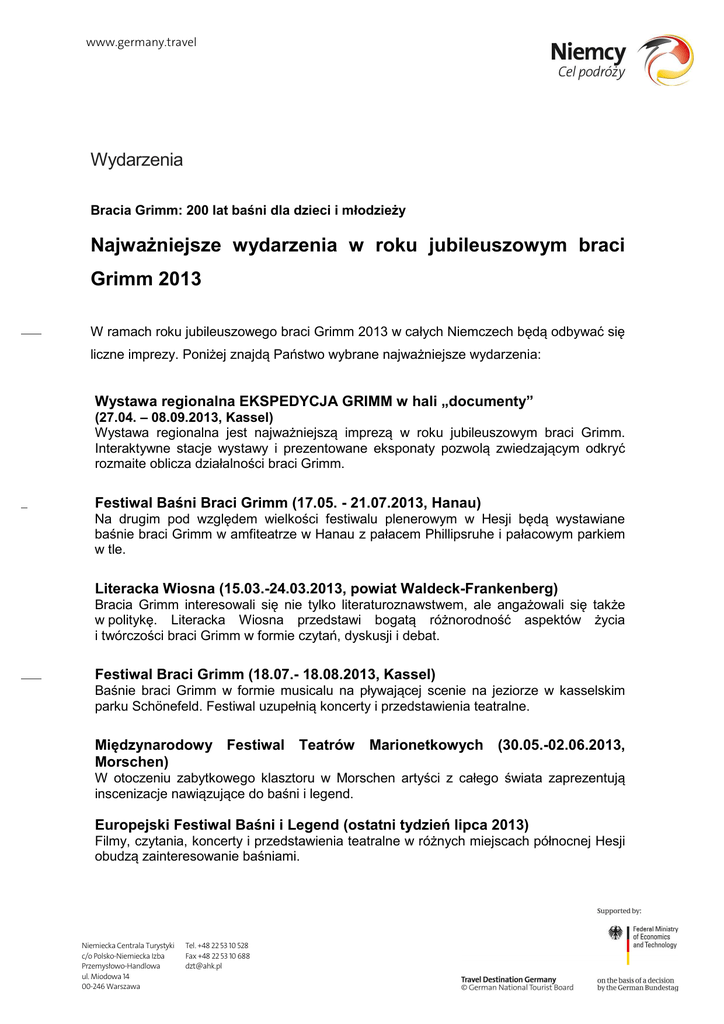 www.germany.travel Wydarzenia Bracia Grimm: 200 lat baśni dla dzieci i młodzieży Najważniejsze wydarzenia w roku jubileuszowym braci Grimm 2013 W ramach roku jubileuszowego braci Grimm 2013 w całych Niemczech będą odbywać się liczne imprezy. Poniżej znajdą Państwo wybrane najważniejsze wydarzenia: Wystawa regionalna EKSPEDYCJA GRIMM w hali „documenty” (27.04. – 08.09.2013, Kassel) Wystawa regionalna jest najważniejszą imprezą w roku jubileuszowym braci Grimm. Interaktywne stacje wystawy i prezentowane eksponaty pozwolą zwiedzającym odkryć rozmaite oblicza działalności braci Grimm. Festiwal Baśni Braci Grimm (17.05. - 21.07.2013, Hanau) Na drugim pod względem wielkości festiwalu plenerowym w Hesji będą wystawiane baśnie braci Grimm w amfiteatrze w Hanau z pałacem Phillipsruhe i pałacowym parkiem w tle. Literacka Wiosna (15.03.-24.03.2013, powiat Waldeck-Frankenberg) Bracia Grimm interesowali się nie tylko literaturoznawstwem, ale angażowali się także w politykę. Literacka Wiosna przedstawi bogatą różnorodność aspektów życia i twórczości braci Grimm w formie czytań, dyskusji i debat. Festiwal Braci Grimm (18.07.- 18.08.2013, Kassel) Baśnie braci Grimm w formie musicalu na pływającej scenie na jeziorze w kasselskim parku Schönefeld. Festiwal uzupełnią koncerty i przedstawienia teatralne. Międzynarodowy Festiwal Teatrów Morschen) Marionetkowych (30.05.-02.06.2013, W otoczeniu zabytkowego klasztoru w Morschen artyści z całego świata zaprezentują inscenizacje nawiązujące do baśni i legend. Europejski Festiwal Baśni i Legend (ostatni tydzień lipca 2013) Filmy, czytania, koncerty i przedstawienia teatralne w różnych miejscach północnej Hesji obudzą zainteresowanie baśniami. Niemiecka Centrala Turystyki c/o Polsko-Niemiecka Izba Przemysłowo-Handlowa ul. Miodowa 14 00-246 Warszawa Tel. +48 22 53 10 528 Fax +48 22 53 10 688 [email protected] www.germany.travel Festiwal baśni „5 za jednym zamachem“ (maj 2013) Bad Wildungen i cztery sąsiednie miasta, wszystkie będące ogniwami Niemieckiego Szlaku Baśniowego, urządzą przez pięć weekendów festiwal, którego tematyka będzie skupiać się wokół baśni, legend i sag. Tydzień Baśni (31.03. do 07.04.2013, Bad Sooden-Allendorf) Od niedzieli wielkanocnej cała miejscowość będzie żyć pod dyktando baśni. Pani Zamieć będzie codziennie o godz. 15.00 trzepać swoją pościel przy bramie miejskiej Södertor. Tydzień Baśni obejmie także opowiadanie baśni, inscenizacje teatralne, piesze wycieczki i paradę bajkowych postaci z Niemieckiego Szlaku Baśniowego. Muzeum Braci Grimm w pałacu Bellevue (stała ekspozycja, Kassel) Pałac Bellevue jest siedzibą Muzeum Braci Grimm. Wystawa organizowana w 2013 rzuci nieco światła na życie i twórczość słynnych braci. Baśnie Grimmów w rysunku (od połowy stycznia do 10 marca 2013, Willingshausen) Wernisaż w Nowej Galerii Sztuki w Willingshausen zaprezentuje ilustracje do baśni z trzech stuleci. 200 lat baśni dziecięcych i domowych braci Grimm (16.12.2012-24.03.2013, Steinau) Stare baśnie w nowej interpretacji: na wystawie w domu braci Grimm i muzeum w Steinau baśnie dadzą poznać się całkiem z innej strony dzięki ilustracjom rysownika satyrycznego Klausa Häringa. Dni Teatrów Lalkowych w Steinau (wrzesień / październik 2013, Steinau) W Steinau – mieście braci Grimm – aktorzy lalkowi z całych Niemiec ożywią szmaciane postaci i sprawią, że baśnie staną się rzeczywistością. Ścieżka Braci Grimm, Marburg (2012-2013) Ścieżka Braci Grimm wabi baśniowymi postaciami przymocowanymi wysoko do domów, schodów i murów. Trasa pokonuje różnicę wysokości 109 m. Plan miasta pokazuje szlak łączący 14 stacji na historycznej starówce. Dom braci Grimm w Steinau (stała ekspozycja, czynna codziennie przez cały rok) Dom, w którym niegdyś mieszkali bracia Grimm, ma bogatą przeszłość. Dziś mieści poświęcone im muzeum. Organizowane przez muzeum wystawy pokazują życie, twórczość i wpływ Grimmów na historię. Głównym tematem w tym regionie jest dzieciństwo i młodość braci. Niemiecka Centrala Turystyki c/o Polsko-Niemiecka Izba Przemysłowo-Handlowa ul. Miodowa 14 00-246 Warszawa Tel. +48 22 53 10 528 Fax +48 22 53 10 688 [email protected] www.germany.travel Bad Oeynhausen (stała ekspozycja, całoroczna, od środy do niedzieli) Muzeum zaprowadzi nas do świata baśni i legend. Tutaj nie tylko natkniemy się na znane postaci z baśni braci Grimm, ale przede wszystkim dowiemy się czegoś o baśniach i legendach w ogóle. Baśniowy jarmark bożonarodzeniowy (od końca listopada do Bożego Narodzenia 2013, Kassel) Specjalnie dla baśniowego jarmarku bożonarodzeniowego kasselski plac, Königsplatz, zostanie udekorowany figurami baśniowych postaci, a sklepy w kasselskim śródmieściu przyozdobione bohaterami czarownych opowieści. O DZT Niemiecka Centrala Turystyki (DZT) to narodowa „izba turystyki” Niemiec z siedzibą główną we Frankfurcie nad Menem. Centrala zajmuje się promowaniem Niemiec jako kraju turystycznego na zlecenie Federalnego Ministerstwa Gospodarki i Technologii (BMWi), które wspiera ją na mocy uchwały niemieckiego Bundestagu. DZT zajmuje się tworzeniem strategii i produktów oraz działaniami marketingowymi w celu dalszego umocnienia pozytywnego wizerunku Niemiec za granicą jako celu podróży oraz wspierania turystyki niemieckiej. DZT posiada 30 przedstawicielstw zagranicznych na całym świecie. Bliższe informacje można znaleźć w naszym internetowym centrum prasowym na stronie www.germany.travel/presse. Niemiecka Centrala Turystyki c/o Polsko-Niemiecka Izba Przemysłowo-Handlowa ul. Miodowa 14 00-246 Warszawa Tel. +48 22 53 10 528 Fax +48 22 53 10 688 [email protected]