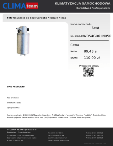 Filtr-Osuszacz do Seat Cordoba / Ibiza II / Inca Marka samochodu: Seat Nr. produktu: W054G061N050 Cena Netto: 89,43 zł Brutto: 110,00 zł Przejdź do sklepu OPIS PRODUKTU Kod produktu: W054G061N050 Opis produktu: Numer oryginału: 1H0820191ACzynnik chłodniczy: R-134aWymiary "wejscie": Wymiary "wyjście": Średnica filtra: Rocznik pojazdu: Seat Cordoba, Ibiza, Inca (93-)Pojemność silnika: Seat Cordoba, Ibiza (wszystkie) © CLIMA TEAM Spółka z o.o. Doradztwo i Profesjonalizm Tel: (022) 817 83 01 Mobile: 0 501 642 528 ul. Staniewicka 2 03-310 Warszawa Fax: (022) 817 84 49 Mobile: 0 501 642 529 Zapraszamy od poniedziałku do piątku [email protected] Mobile: 0 500 119 528 w godz. 9:00 - 17:00 [email protected] projekt GRAFCOM | Netler Shop 1.020