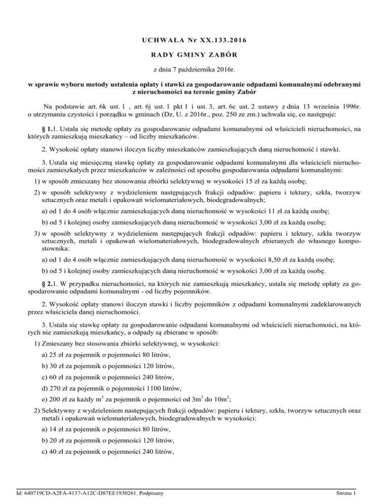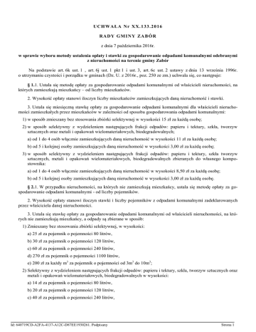 UCH WAŁA Nr XX.1 33.2016 RADY GMINY ZAB Ó R z dnia 7 października 2016r. w sprawie wyboru metody ustalenia opłaty i stawki za gospodarowanie odpadami komunalnymi odebranymi z nieruchomości na terenie gminy Zabór Na podstawie art. 6k ust. 1 , art. 6j ust. 1 pkt 1 i ust. 3, art. 6c ust. 2 ustawy z dnia 13 września 1996r. o utrzymaniu czystości i porządku w gminach (Dz. U. z 2016r., poz. 250 ze zm.) uchwala się, co następuje: § 1.1. Ustala się metodę opłaty za gospodarowanie odpadami komunalnymi od właścicieli nieruchomości, na których zamieszkują mieszkańcy – od liczby mieszkańców. 2. Wysokość opłaty stanowi iloczyn liczby mieszkańców zamieszkujących daną nieruchomość i stawki. 3. Ustala się miesięczną stawkę opłaty za gospodarowanie odpadami komunalnymi dla właścicieli nieruchomości zamieszkałych przez mieszkańców w zależności od sposobu gospodarowania odpadami komunalnymi: 1) w sposób zmieszany bez stosowania zbiórki selektywnej w wysokości 15 zł za każdą osobę; 2) w sposób selektywny z wydzieleniem następujących frakcji odpadów: papieru i tektury, szkła, tworzyw sztucznych oraz metali i opakowań wielomateriałowych, biodegradowalnych; a) od 1 do 4 osób włącznie zamieszkujących daną nieruchomość w wysokości 11 zł za każdą osobę; b) od 5 i kolejnej osoby zamieszkujących daną nieruchomość w wysokości 3,00 zł za każdą osobę; 3) w sposób selektywny z wydzieleniem następujących frakcji odpadów: papieru i tektury, szkła tworzyw sztucznych, metali i opakowań wielomateriałowych, biodegradowalnych zbieranych do własnego kompostownika: a) od 1 do 4 osób włącznie zamieszkujących daną nieruchomość w wysokości 8,50 zł za każdą osobę; b) od 5 i kolejnej osoby zamieszkujących daną nieruchomość w wysokości 3,00 zł za każdą osobę. § 2.1. W przypadku nieruchomości, na których nie zamieszkują mieszkańcy, ustala się metodę opłaty za gospodarowanie odpadami komunalnymi - od liczby pojemników. 2. Wysokość opłaty stanowi iloczyn stawki i liczby pojemników z odpadami komunalnymi zadeklarowanych przez właściciela danej nieruchomości. 3. Ustala się stawkę opłaty za gospodarowanie odpadami komunalnymi od właścicieli nieruchomości, na których nie zamieszkują mieszkańcy, a odpady są zbierane w sposób: 1) Zmieszany bez stosowania zbiórki selektywnej, w wysokości: a) 25 zł za pojemnik o pojemności 80 litrów, b) 30 zł za pojemnik o pojemności 120 litrów, c) 60 zł za pojemnik o pojemności 240 litrów, d) 270 zł za pojemnik o pojemności 1100 litrów, e) 200 zł za każdy m3 za pojemnik o pojemności od 3m3 do 10m3; 2) Selektywny z wydzieleniem następujących frakcji odpadów: papieru i tektury, szkła, tworzyw sztucznych oraz metali i opakowań wielomateriałowych, biodegradowalnych w wysokości: a) 14 zł za pojemnik o pojemności 80 litrów, b) 20 zł za pojemnik o pojemności 120 litrów, c) 40 zł za pojemnik o pojemności 240 litrów, Id: 640719CD-A2FA-4137-A12C-D87EE1930261. Podpisany Strona 1 d) 160 zł za pojemnik o pojemności 1100 litrów, e) 140 zł za każdy m3, za pojemnik o pojemności od 3m3 do 10m3, f) 5 zł za pakiet worków o pojemności 120 litrów (worek na papier i tekturę, worek na szkło, worek na tworzywa sztuczne oraz metale i opakowania wielomateriałowe, worek na odpady biodegradowalne ), g) 110 zł za pakiet pojemników o pojemności 1100 litrów na odpady selektywne (pojemnik na papier i tekturę, pojemnik na szkło, pojemnik na tworzywa sztuczne oraz metale i opakowania wielomateriałowe, pojemnik na odpady biodegradowalne). 3) Selektywny z wydzieleniem następujących frakcji odpadów: papieru i tektury, szkła, tworzyw sztucznych oraz metali i opakowań wielomateriałowych, biodegradowalnych zbieranych do własnego kompostownika w wysokości: a) 9 zł za pojemnik o pojemności 80 litrów, b) 12 zł za pojemnik o pojemności 120 litrów, c) 24 zł za pojemnik o pojemności 240 litrów, d) 110 zł za pojemnik o pojemności 1100 litrów, e) 100 zł za każdy m3, za pojemnik o pojemności od 3m3 do 10m3, f) 5 zł za pakiet worków o pojemności 120 litrów na odpady selektywne (worek na papier i tekturę, worek na szkło, worek na tworzywa sztuczne oraz metale i opakowania wielomateriałowe), g) 82,50 zł za pakiet pojemników o pojemności 1100 litrów na odpady selektywne (pojemnik na papier i tekturę, pojemnik na szkło, pojemnik na tworzywa sztuczne oraz metale i opakowania wielomateriałowe). § 3. Traci moc Uchwała nr XII.81.2015 Rady Gminy Zabór z dnia 30 listopada 2015r. w sprawie wyboru metody ustalenia opłaty i stawki za gospodarowanie odpadami komunalnymi odebranymi z nieruchomości na terenie gminy Zabór. § 4. Uchwała wchodzi w życie z dniem 1 stycznia 2017r. i podlega ogłoszeniu w Dzienniku Urzędowym Województwa Lubuskiego oraz rozplakatowaniu na tablicy ogłoszeń w urzędzie gminy i w poszczególnych sołectwach. Przewodniczący Rady Lech Merda Id: 640719CD-A2FA-4137-A12C-D87EE1930261. Podpisany Strona 2