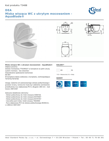 Kod produktu T3488 DEA Miska wisząca WC z ukrytym mocowaniem AquaBlade® Miska wisząca WC z ukrytym mocowaniem - AquaBlade® Odpływ poziomy Zestaw montażowy TT0299327 w komplecie (w pełni ukryty system montażu - bez otworów) Indywidulane opakowanie kartonowe EN 997 W komplecie deska sedesowa z duroplastu, wolnoopadająca T676701/T676783 KOLORY* 83 01 * 83 = Matowa biel, 01 = Biały NORMY Uwaga: Zależnie od zastosowanego stelaża podtynkowego i grubości ściany, konieczne może być oddzielne zamówienie przedłużonej rury odpływowej PCV o długości 280 mm – kod towaru W872367 Zalecane dodatkowe elementy: - Stelaż podtynkowy do miski wiszącej C0067AA - Stelaż podtynkowy do miski wiszącej W370567 - Stelaż podtynkowy do miski wiszącej W370767 - Uszczelka pod miskę i bidet wiszący T604900 - Rura odpływowa PCV do stelaża podtynkowego Ø100mm, L=280mm W872367 Ideal Standard Polska Sp. z o.o. • ul. Ostrowskiego 7 • 53-238 Wrocław • Poland • Tel.: 00 48 71 78 68 301