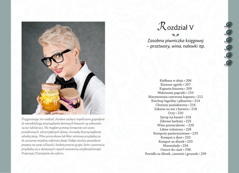 Rozdział V pk Zasobna piwniczka księgowej – przetwory, wina, nalewki itp. Przygotowując ten rozdział, chciałam zachęcić współczesne gospodynie do samodzielnego przyrządzania domowych kiszonek czy zakwasów na żur lub barszcz. Nie mogłam pominąć kompotów ani sosów pomidorowych, tak przydatnych dzisiaj, chociażby do przyrządzenia włoskiej pizzy. Wino porzeczkowe lub likier wiśniowy przydadzą się do uczczenia niejednej rodzinnej okazji. Podaję również sprawdzone przepisy na syrop od kaszlu i herbatę przeciw grypie, które z pewnością przydadzą się w dzisiejszych czasach wzmożonej antybiotykoterapii. Proponuję 19 przepisów do wyboru. Kiełbasa w słoju • 206 Kiszone ogórki • 207 Kapusta kiszona • 209 Wekowane papryki • 210 Marynowana czerwona kapusta • 212 Ketchup łagodny i pikantny • 214 Chutney pomidorowy • 216 Zakwas na żur i barszcz • 218 Octy • 220 Syrop na kaszel • 224 Zdrowe herbaty • 225 Wino porzeczkowe • 226 Likier wiśniowy • 228 Kompoty pasteryzowane • 229 Kompot z dyni • 232 Kompot ze śliwek • 233 Marmolady • 234 Owoce do ciast • 238 Powidła ze śliwek, czereśni i gruszek • 239 o o o o o o p K S I Ę G OWA W K U C H N I k p Z A S O B N A PI W N I C Z K A K S I Ę G OW E J k Kiełbasa w słoju Kiszone ogórki SKŁADNIKI: SKŁADNIKI: pk pk 250 g słoniny, 1½ kg wieprzowiny bez kości, gorczyca, pieprz naturalny mielony, czosnek. 3 kg ogórków zielonych średnich, 3 łyżki soli, 3 l wody, koper, chrzan w korzeniu, czosnek lub liście chrzanu, winogron czy wiśni. SPOSÓB PRZYRZĄDZANIA: pk Mięso zemleć w maszynce wraz ze słoniną. Masę mięsną wymieszać w misce z dodatkiem soli, pieprzu, niewielkiej ilości gorczycy i roztartego z solą czosnku. Gdy masa będzie dobrze wyrobiona, dodać do niej dwie łyżki wody, jeszcze raz wymieszać i przełożyć do wcześniej wyparzonych słoików. Szczelnie zakręcić, po czym gotować w kąpieli wodnej około godziny. Po ugotowaniu słoiki wyciągnąć i przenieść w chłodne miejsce na 24 godziny. Po upływie tego czasu ponownie gotować przez godzinę, następnie powoli wystudzić i przenieść do przechowania w chłodne i ciemne miejsce. p 206 k SPOSÓB PRZYRZĄDZANIA: pk Umyte ogórki ułożyć ciasno w słoikach wraz z przyprawami, tak aby po zalaniu wystudzona woda z solą nie wylewała się. Zakręcić i ustawić do fermentacji na metalowej tacy, gdyż w tym czasie mogą wyciekać. Aby ogórki ukisiły się szybciej, można je zalać wrzącą wodą. p 207 k o o o o o o p K S I Ę G OWA W K U C H N I k p Z A S O B N A PI W N I C Z K A K S I Ę G OW E J k Kapusta kiszona SKŁADNIKI: pk 4–5 główek kapusty białej (mocno zbitej), sól do smaku. Dodatki: marchewka, kminek. SPOSÓB PRZYRZĄDZANIA: pk Kapustę obrać, umyć, przekroić na połówki lub ćwiartki i drobno poszatkować. Poszatkowaną kapustę włożyć do dużej miski, posolić i wymieszać (na dużą miskę, jedna garść soli). Kapustę pozostawić w misce, aż zacznie puszczać sok, wówczas upchnąć ją mocno do przygotowanych czystych słoików, tak aby nie pozostawić w nich powietrza. Wierzch kapusty nakryć szczelnie liściem i zakręcić. Odstawić na plastikową lub metalową tacę na kilka dni, aż do momentu zakończenia fermentacji, wówczas słoiki wytrzeć i odstawić w chłodne i ciemne miejsce. Do kiszenia kapusty można dodać kminek lub startą na tarce o grubych oczkach obraną marchewkę. p 208 k p 209 k o o o o o o p K S I Ę G OWA W K U C H N I k Wekowane papryki p Z A S O B N A PI W N I C Z K A K S I Ę G OW E J k SKŁADNIKI: pk 250 g cebuli, 500 g zielonej papryki, 500 g czerwonej papryki, 500 g żółtej papryki, 3 łyżki soli, ¾ l białego octu winnego, 1 łodyżka selera naciowego, 3 liście laurowe, 3 ząbki czosnku, 1 papryka pepperoni. SPOSÓB PRZYRZĄDZANIA: pk Obraną cebulę pokroić w plasterki. Paprykę przekroić na ćwiartki, usunąć nasiona, opłukać. Ostro zakończonym nożem pokroić w paski. Na dużym ogniu zagotować 5 l wody z solą. Cebulę oraz żółtą, zieloną i czerwoną paprykę gotować 2 minuty, opłukać zimną wodą, odstawić do osączenia. W ¼ l wody po gotowaniu papryki gotować 10 minut pozostałe dodatki, po czym przecedzić i odstawić do wystygnięcia. Warzywa ułożyć warstwami w słoikach i zalać korzenną zalewą. Słoiki zamknąć i pasteryzować 20 minut w temperaturze 75°C. p 210 k p 211 k o o o o o o