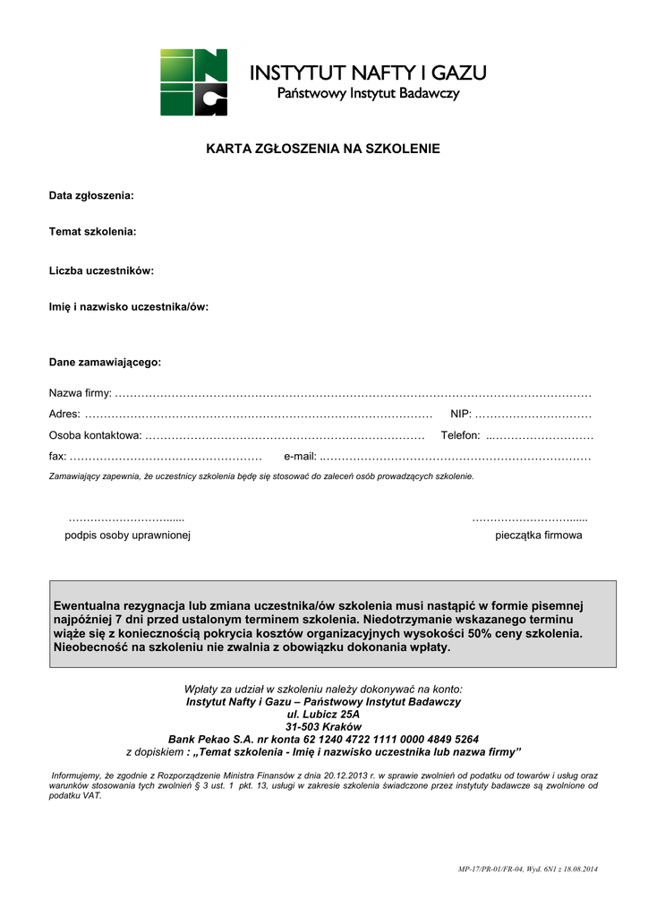 KARTA ZGŁOSZENIA NA SZKOLENIE Data zgłoszenia: Temat szkolenia: Liczba uczestników: Imię i nazwisko uczestnika/ów: Dane zamawiającego: Nazwa firmy: .............................................................................................................................. Adres: ............................................................................................ Osoba kontaktowa: .......................................................................... fax: ................................................... NIP: …............................ Telefon: ............................. e-mail: ........................................................................ Zamawiający zapewnia, że uczestnicy szkolenia będę się stosować do zaleceń osób prowadzących szkolenie. ………………………...... podpis osoby uprawnionej ………………………...... pieczątka firmowa Ewentualna rezygnacja lub zmiana uczestnika/ów szkolenia musi nastąpić w formie pisemnej najpóźniej 7 dni przed ustalonym terminem szkolenia. Niedotrzymanie wskazanego terminu wiąże się z koniecznością pokrycia kosztów organizacyjnych wysokości 50% ceny szkolenia. Nieobecność na szkoleniu nie zwalnia z obowiązku dokonania wpłaty. Wpłaty za udział w szkoleniu należy dokonywać na konto: Instytut Nafty i Gazu – Państwowy Instytut Badawczy ul. Lubicz 25A 31-503 Kraków Bank Pekao S.A. nr konta 62 1240 4722 1111 0000 4849 5264 z dopiskiem : „Temat szkolenia - Imię i nazwisko uczestnika lub nazwa firmy” Informujemy, że zgodnie z Rozporządzenie Ministra Finansów z dnia 20.12.2013 r. w sprawie zwolnień od podatku od towarów i usług oraz warunków stosowania tych zwolnień § 3 ust. 1 pkt. 13, usługi w zakresie szkolenia świadczone przez instytuty badawcze są zwolnione od podatku VAT. MP-17/PR-01/FR-04, Wyd. 6N1 z 18.08.2014