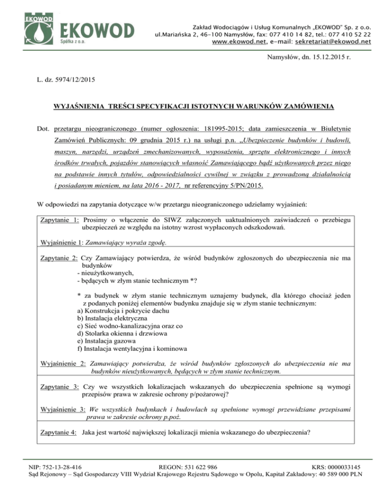Zakład Wodociągów i Usług Komunalnych „EKOWOD” Sp. z o.o. ul.Mariańska 2, 46-100 Namysłów, fax: 077 410 14 82, tel.: 077 410 52 22 www.ekowod.net, e-mail: [email protected] Namysłów, dn. 15.12.2015 r. L. dz. 5974/12/2015 WYJAŚNIENIA TREŚCI SPECYFIKACJI ISTOTNYCH WARUNKÓW ZAMÓWIENIA Dot. przetargu nieograniczonego (numer ogłoszenia: 181995-2015; data zamieszczenia w Biuletynie Zamówień Publicznych: 09 grudnia 2015 r.) na usługi p.n. „Ubezpieczenie budynków i budowli, maszyn, narzędzi, urządzeń zmechanizowanych, wyposażenia, sprzętu elektronicznego i innych środków trwałych, pojazdów stanowiących własność Zamawiającego bądź użytkowanych przez niego na podstawie innych tytułów, odpowiedzialności cywilnej w związku z prowadzoną działalnością i posiadanym mieniem, na lata 2016 - 2017, nr referencyjny 5/PN/2015. W odpowiedzi na zapytania dotyczące w/w przetargu nieograniczonego udzielamy wyjaśnień: Zapytanie 1: Prosimy o włączenie do SIWZ załączonych uaktualnionych zaświadczeń o przebiegu ubezpieczeń ze względu na istotny wzrost wypłaconych odszkodowań. Wyjaśnienie 1: Zamawiający wyraża zgodę. Zapytanie 2: Czy Zamawiający potwierdza, że wśród budynków zgłoszonych do ubezpieczenia nie ma budynków - nieużytkowanych, - będących w złym stanie technicznym *? * za budynek w złym stanie technicznym uznajemy budynek, dla którego chociaż jeden z podanych poniżej elementów budynku znajduje się w złym stanie technicznym: a) Konstrukcja i pokrycie dachu b) Instalacja elektryczna c) Sieć wodno-kanalizacyjna oraz co d) Stolarka okienna i drzwiowa e) Instalacja gazowa f) Instalacja wentylacyjna i kominowa Wyjaśnienie 2: Zamawiający potwierdza, że wśród budynków zgłoszonych do ubezpieczenia nie ma budynków nieużytkowanych, będących w złym stanie technicznym. Zapytanie 3: Czy we wszystkich lokalizacjach wskazanych do ubezpieczenia spełnione są wymogi przepisów prawa w zakresie ochrony p/pożarowej? Wyjaśnienie 3: We wszystkich budynkach i budowlach są spełnione wymogi przewidziane przepisami prawa w zakresie ochrony p.poż. Zapytanie 4: Jaka jest wartość największej lokalizacji mienia wskazanego do ubezpieczenia? NIP: 752-13-28-416 REGON: 531 622 986 KRS: 0000033145 Sąd Rejonowy – Sąd Gospodarczy VIII Wydział Krajowego Rejestru Sądowego w Opolu, Kapitał Zakładowy: 40 589 000 PLN Zakład Wodociągów i Usług Komunalnych „EKOWOD” Sp. z o.o. ul.Mariańska 2, 46-100 Namysłów, fax: 077 410 14 82, tel.: 077 410 52 22 www.ekowod.net, e-mail: [email protected] Wyjaśnienie 4: Oczyszczalnia ścieków w Namysłowie, ul. Grunwaldzka 52 – wartość mienia do ubezpieczenia 16.307.817,49 zł. Zapytanie 5: Jakie rodzaje działalności wg numerów PKD nie były faktycznie wykonywane przez Zamawiającego w 2015r.? Prosimy o podanie odpowiednich numerów PKD. Wyjaśnienie 5: 38.12.Z, 38.22.Z, 46.69.Z, 46.77.Z, 46.90.Z, 47.19.Z, 77.21.Z, 93.11.Z, 93.13.Z. Zapytanie 6: Prosimy o podanie wnioskowanych do ochrony działalności faktycznie wykonywanych przez Zamawiającego wg PKD 2007. Wyjaśnienie 6: 33.11.Z, 33.12.Z, 33.17.Z, 33.19.Z, 33.20.Z, 35.11.Z, 35.12.Z, 35.13.Z, 35.14.Z, 36.00.Z, 37.00.Z, 38.11.Z, 38.21.Z, 38.31.Z, 38.32.Z, 39.00.Z, 41.10.Z, 41.20.Z, 42.91.Z, 42.99.Z, 42.11.Z, 43.11.Z, 43.12.Z, 43.21.Z, 43.22.Z, 43.29.Z, 43.31.Z, 43.91.Z, 43.99.Z, 49.39.Z, 49.41.Z, 52.10.B, 68.20.Z, 68.32.Z, 71.12.Z, 71.20.B, 77.39.Z, 81.10.Z,81.21.Z,81.29.Z,81.30.Z,82.19.Z,82.99.Z. 35.30.Z, 42.21.Z, 43.39.Z, 77.12.Z, Zapytanie 7: Czy Zamawiający przewiduje w latach 2016- 2017 istotną zmianę struktury procentowej osiąganych przychodów w stosunku do podanej w SIWZ ? Wyjaśnienie 7: Zamawiający nie przewiduje w 2016-2017 r. istotnej zmiany struktury procentowej osiąganych przychodów w stosunku do podanej w SIWZ Zapytanie 8: Czy Zamawiający potwierdza, że a) nie zbiera, nie segreguje, nie przetwarza i nie składuje odpadów niebezpiecznych; b) nie zajmuje się recyklingiem odpadów; c) odpady (sortowane, składowane) nie stanowią przedmiotu ubezpieczenia? Wyjaśnienie 8: a)Zamawiający potwierdza, że nie zbiera, nie segreguje, nie przetwarza i nie składuje odpadów niebezpiecznych b)Zamawiający nie zajmuje się recyklingiem odpadów c)Zamawiający potwierdza, że odpady (sortowane, składowane) nie stanowią przedmiotu ubezpieczenia Zapytanie 9: Prosimy o opis i szkice sytuacyjne wszystkich miejsc sortowania i składowania odpadów, ze szczególnym uwzględnieniem opisu miejsca i sposobu składowania odpadów, zabezpieczeń p/poż., rodzaju sąsiedztwa, odległości od zabudowań i wartości majątku znajdującego się w bezpośrednim sąsiedztwie tych miejsc (dotyczy szczególnie sortowni przy ulicy Grunwaldzkiej w Namysłowie oraz sortowni w Ziemiełowicach ale także innych miejsc sortowania i składowania odpadów, jeśli takie występują) . Wyjaśnienie 9: Składowisko odpadów w Ziemiełowicach jest zastępczym RIPOKIEM, na składowisku tym tylko przeładowuje się odpady komunalne (nie segreguje się odpadów), które następnie wywozi się na składowisko w Gotartowie (Gmina Kluczbork) nie będące własnością i pod zarządem Zamawiającego: • najbliższe sąsiedztwo terenu składowiska stanowią pola uprawne oraz nieczynna linia kolejowa, • odległość od zabudowań wynosi 650-850 m, • szkic sytuacyjny w załączeniu, Sortownia odpadów komunalnych w Namysłowie: • odpady przyjmowane na sortownię odpadów to: papier i tektura, tworzywa sztuczne, NIP: 752-13-28-416 REGON: 531 622 986 KRS: 0000033145 Sąd Rejonowy – Sąd Gospodarczy VIII Wydział Krajowego Rejestru Sądowego w Opolu, Kapitał Zakładowy: 40 589 000 PLN Zakład Wodociągów i Usług Komunalnych „EKOWOD” Sp. z o.o. ul.Mariańska 2, 46-100 Namysłów, fax: 077 410 14 82, tel.: 077 410 52 22 www.ekowod.net, e-mail: [email protected] szkło, złom, odpady wielkogabarytowe oraz zużyty sprzęt elektryczny i elektroniczny,