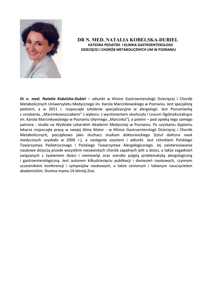 DR N. MED. NATALIA KOBELSKA-DUBIEL KATEDRA PEDIATRII I KLINIKA GASTROENTEROLOGII DZIECIĘCEJ I CHORÓB METABOLICZNYCH UM W POZNANIU Dr n. med. Natalia Kobelska-Dubiel – adiunkt w Klinice Gastroenterologii Dziecięcej i Chorób Metabolicznych Uniwersytetu Medycznego im. Karola Marcinkowskiego w Poznaniu. Jest specjalistą pediatrii, a w 2011 r. rozpoczęła szkolenie specjalizacyjne w alergologii. Jest Poznanianką z urodzenia, „Marcinkowszczakiem” z wyboru: z wyróżnieniem ukończyła I Liceum Ogólnokształcące im. Karola Marcinkowskiego w Poznaniu (słynnego „Marcinka”), a potem – pod opieką tego samego patrona - studia na Wydziale Lekarskim Akademii Medycznej w Poznaniu. Po uzyskaniu dyplomu lekarza rozpoczęła pracę w swojej Alma Mater - w Klinice Gastroenterologii Dziecięcej i Chorób Metabolicznych, początkowo jako słuchacz studium doktoranckiego (tytuł doktora nauk medycznych uzyskała w 2006 r.), a następnie asystent i adiunkt. Jest członkiem Polskiego Towarzystwa Pediatrycznego i Polskiego Towarzystwa Alergologicznego. Jej zainteresowania naukowe dotyczą przede wszystkim nieswoistych chorób zapalnych jelit u dzieci, a także zagadnień związanych z żywieniem dzieci i niemowląt oraz szeroko pojętą problematyką alergologiczną i gastroenterologiczną. Jest autorem kilkudziesięciu publikacji i doniesień naukowych, czynnym uczestnikiem konferencji i sympozjów naukowych, a także cenionym i lubianym nauczycielem akademickim. Dumna mama 14-letniej Zosi.