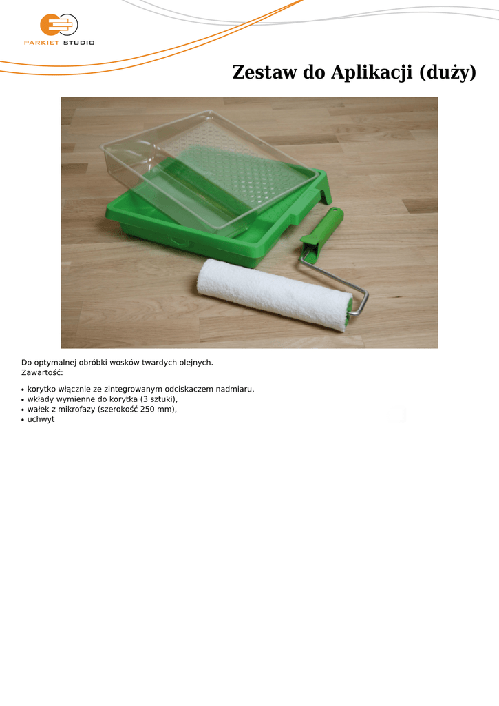 Zestaw do Aplikacji (duży) Do optymalnej obróbki wosków twardych olejnych. Zawartość: ● ● ● ● korytko włącznie ze zintegrowanym odciskaczem nadmiaru, wkłady wymienne do korytka (3 sztuki), wałek z mikrofazy (szerokość 250 mm), uchwyt