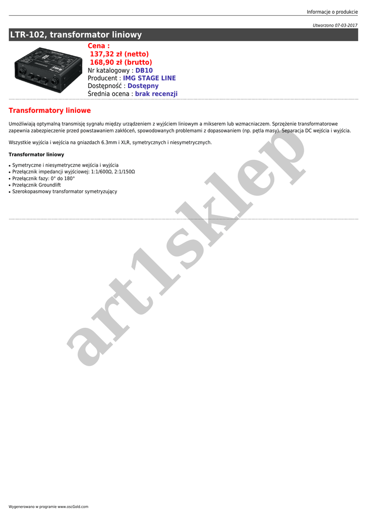 Informacje o produkcie Utworzono 07-03-2017 LTR-102, transformator liniowy Cena : 137,32 zł (netto) 168,90 zł (brutto) Nr katalogowy : DB10 Producent : IMG STAGE LINE Dostępność : Dostępny Średnia ocena : brak recenzji Transformatory liniowe Umożliwiają optymalną transmisję sygnału między urządzeniem z wyjściem liniowym a mikserem lub wzmacniaczem. Sprzężenie transformatorowe zapewnia zabezpieczenie przed powstawaniem zakłóceń, spowodowanych problemami z dopasowaniem (np. pętla masy). Separacja DC wejścia i wyjścia. Transformator liniowy ● ● ● ● ar t1 sk ● Symetryczne i niesymetryczne wejścia i wyjścia Przełącznik impedancji wyjściowej: 1:1/600Ω, 2:1/150Ω Przełącznik fazy: 0° do 180° Przełącznik Groundlift Szerokopasmowy transformator symetryzujący le p Wszystkie wyjścia i wejścia na gniazdach 6.3mm i XLR, symetrycznych i niesymetrycznych. Wygenerowano w programie www.oscGold.com