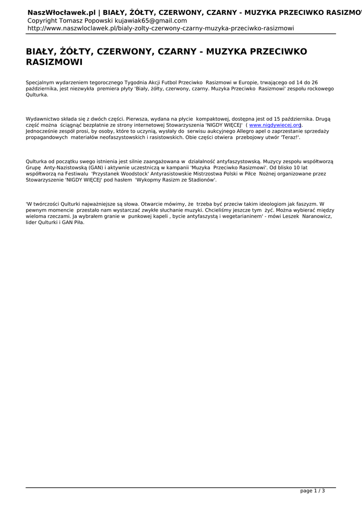 NaszWłocławek.pl | BIAŁY, ŻÓŁTY, CZERWONY, CZARNY - MUZYKA PRZECIWKO RASIZMOW Copyright Tomasz Popowski [email protected] http://www.naszwloclawek.pl/bialy-zolty-czerwony-czarny-muzyka-przeciwko-rasizmowi BIAŁY, ŻÓŁTY, CZERWONY, CZARNY - MUZYKA PRZECIWKO RASIZMOWI Specjalnym wydarzeniem tegorocznego Tygodnia Akcji Futbol Przeciwko Rasizmowi w Europie, trwającego od 14 do 26 października, jest niezwykła premiera płyty 'Biały, żółty, czerwony, czarny. Muzyka Przeciwko Rasizmowi' zespołu rockowego Qulturka. Wydawnictwo składa się z dwóch części. Pierwsza, wydana na płycie kompaktowej, dostępna jest od 15 października. Drugą część można ściągnąć bezpłatnie ze strony internetowej Stowarzyszenia 'NIGDY WIĘCEJ' ( www.nigdywiecej.org). Jednocześnie zespół prosi, by osoby, które to uczynią, wysłały do serwisu aukcyjnego Allegro apel o zaprzestanie sprzedaży propagandowych materiałów neofaszystowskich i rasistowskich. Obie części otwiera przebojowy utwór 'Teraz!'. Qulturka od początku swego istnienia jest silnie zaangażowana w działalność antyfaszystowską. Muzycy zespołu współtworzą Grupę Anty-Nazistowską (GAN) i aktywnie uczestniczą w kampanii 'Muzyka Przeciwko Rasizmowi'. Od blisko 10 lat współtworzą na Festiwalu 'Przystanek Woodstock' Antyrasistowskie Mistrzostwa Polski w Piłce Nożnej organizowane przez Stowarzyszenie 'NIGDY WIĘCEJ' pod hasłem 'Wykopmy Rasizm ze Stadionów'. 'W twórczości Qulturki najważniejsze są słowa. Otwarcie mówimy, że trzeba być przeciw takim ideologiom jak faszyzm. W pewnym momencie przestało nam wystarczać zwykłe słuchanie muzyki. Chcieliśmy jeszcze tym żyć. Można wybierać między wieloma rzeczami. Ja wybrałem granie w punkowej kapeli , bycie antyfaszystą i wegetarianinem' - mówi Leszek Naranowicz, lider Qulturki i GAN Piła. page 1 / 3 NaszWłocławek.pl | BIAŁY, ŻÓŁTY, CZERWONY, CZARNY - MUZYKA PRZECIWKO RASIZMOW Copyright Tomasz Popowski [email protected] http://www.naszwloclawek.pl/bialy-zolty-czerwony-czarny-muzyka-przeciwko-rasizmowi 'Nie chodzi o to, żeby ludzie byli z nami, ale żeby nie byli z nimi. Zwłaszcza tutaj, w kraju, gdzie ofiary faszyzmu w drugiej wojnie światowej liczone są w milionach' - dodaje Joanna Naranowicz, wokalistka grupy. Ich zespół ma już 15 lat i ciągle gra. Oni sami mają pięcioletniego synka i życie zawodowe - Joanna jest artystką plastykiem, a Leszek kapitanem straży pożarnej. Pozostali członkowie zespołu to cenieni muzycy sceny niezależnej: perkusista Dariusz Kułak i akordeonista Tomasz Kułak, znani z legendarnej grupy Alians, oraz gitarzysta Dawid Grygorcewicz i basista Paweł Paliński. Koncert promujący antyrasistowską płytę Qulturki odbędzie się 15 października w klubie 'Peron' w Pile. Kompakt został wydany staraniem Stowarzyszenia 'NIGDY WIĘCEJ' i firmy płytowej 'Zima'. Dodatkowo w czasie Tygodnia Akcji członkowie Qulturki organizują również w klubie 'Peron' trwającą tydzień wystawę plakatów i grafik antyrasistowskich oraz turniej futbolowy na stadionie Gwardii Piła. Wszystkim imprezom towarzyszyć będą antyrasistowskie stoiska informacyjne. page 2 / 3 NaszWłocławek.pl | BIAŁY, ŻÓŁTY, CZERWONY, CZARNY - MUZYKA PRZECIWKO RASIZMOW Copyright Tomasz Popowski [email protected] http://www.naszwloclawek.pl/bialy-zolty-czerwony-czarny-muzyka-przeciwko-rasizmowi Stowarzyszenie 'NIGDY WIĘCEJ' to powstała w 1996 roku niezależna organizacja antyrasistowska, prowadząca m.in. kampanię 'Muzyka Przeciwko Rasizmowi' i 'Wykopmy Rasizm ze Stadionów' oraz wydająca antyfaszystowski magazyn 'NIGDY WIĘCEJ'. Źródło: www.nigdywiecej.org page 3 / 3