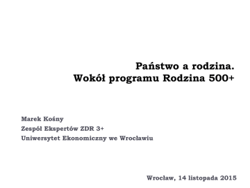 Państwo a rodzina. Wokół programu Rodzina 500+ Marek Kośny Zespół Ekspertów ZDR 3+ Uniwersytet Ekonomiczny we Wrocławiu Wrocław, 14 listopada 2015 Kto jest właścicielem dzieci? W ujęciu filozoficznym i prawnym – dzieci nie są niczyją własnością. Z ekonomicznego punktu widzenia – efekty przyszłej pracy dzieci należą do państwa: może ono jednostronnie decydować o obciążeniach podatkowych. Tymczasem rodzice nie mają (prawie) żadnych praw do dochodów dzieci. A dzieci bardzo rzadko wspierają rodziców w formie bezpośrednich transferów pieniężnych (w Polsce – poniżej 5% osób dorosłych wspiera w ten sposób swoich rodziców). Państwo a rodzina. Wokół programu Rodzina 500+ Dziecko – dobro publiczne Folbre (1994) wskazuje, że dzieci straciły – we współczesnych gospodarkach rozwiniętych – na znaczeniu jako zabezpieczenie na starość. Stały się natomiast publicznym dobrem inwestycyjnym. Problem charakterystyki potomstwa (dobro konsumpcyjne czy inwestycyjne) pojawił się w literaturze w kontekście motywacji do jego posiadania (por. np. Becker, Barro 1988, Cigno 1992, Cigno, Werding 2007) Państwo a rodzina. Wokół programu Rodzina 500+ Dziecko – dobro publiczne Problem gapowicza: poziom finansowania dóbr publicznych nie jest wystarczający (por. np. Marwell, Ames 1981, Fischbacher, Gachter 2010). Konsekwencje w obszarze demografii: możliwe problemy z zagwarantowaniem wystarczającego wzrostu gospodarczego oraz z finansowaniem świadczeń emerytalnych (por. np. Cigno 1993, Groezen i in. 2003). Państwo a rodzina. Wokół programu Rodzina 500+ Krótkookresowe konsekwencje ekonomiczne wychowywania dzieci Kraj Bułgaria Polska Włochy Hiszpania W. Brytania Niemcy Francja Słowenia Relacja pomiędzy przeciętnym dochodem gospodarstwa domowego z 3 lub więcej dzieci a przeciętnym dochodem par bezdzietnych na gospodarstwo na jednostkę domowe (%) ekwiwalentną (%) 60 36 99 60 105 63 115 69 114 69 118 71 124 75 135 81 Źródło: Eurostat Państwo a rodzina. Wokół programu Rodzina 500+ Wpływ dzieci na sytuację finansową rodziny Wychowywanie dzieci pociąga za sobą (w krótkim okresie) : stałe obciążenie dla budżetu domowego na wiele lat, spadku poziomu bezpieczeństwa ekonomicznego, obniżenie standardu życia, znaczny wzrost ryzyka ubóstwa. Decyzja o dziecku wiąże się z ponoszeniem przez rodziców kosztów, nie tylko na etapie jego wychowywania. Oznacza często także niższą emeryturę – zwłaszcza w wypadku większych rodzin (ze względu na okresy nieaktywności zawodowej lub pracy w niepełnym wymiarze godzin itp.). Państwo a rodzina. Wokół programu Rodzina 500+ Refleksje nad Programem Rodzina 500+ Zagwarantowanie podmiotowości rodziny – kto i jak będzie weryfikował prawidłowe wydatkowanie środków? Definicja osób uprawnionych – które dziecko jest drugie? Ograniczenie wiekowe – czy 18 lat to koniec kosztów? Złożoność systemu – czy nowe, hojne świadczenie nie powinno stać się okazją do przeglądu obecnego systemu wsparcia rodziny? Sposób dystrybucji świadczenia – gminy czy inne urzędy? Państwo a rodzina. Wokół programu Rodzina 500+ Dziękuję za uwagę!