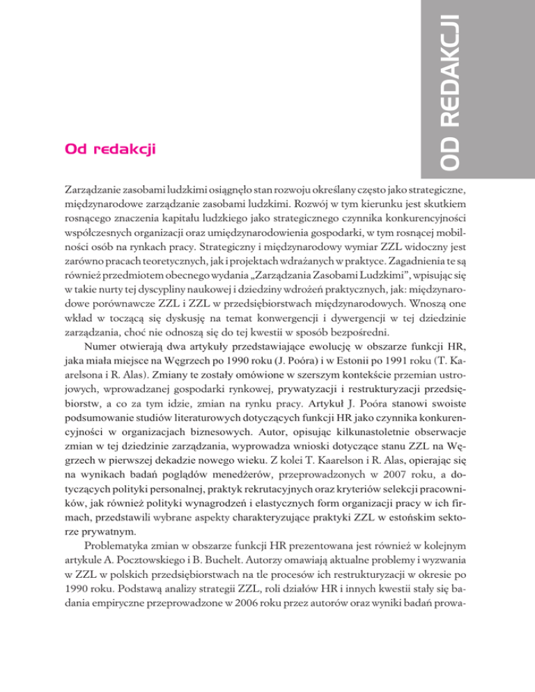 OD REDAKCJI Od redakcji Zarz¹dzanie Od Redakcji zasobami ludzkimi osi¹gnê³o stan rozwoju okrelany czêsto jako strategiczne, miêdzynarodowe zarz¹dzanie zasobami ludzkimi. Rozwój w tym kierunku jest skutkiem rosn¹cego znaczenia kapita³u ludzkiego jako strategicznego czynnika konkurencyjnoci wspó³czesnych organizacji oraz umiêdzynarodowienia gospodarki, w tym rosn¹cej mobilnoci osób na rynkach pracy. Strategiczny i miêdzynarodowy wymiar ZZL widoczny jest zarówno pracach teoretycznych, jak i projektach wdra¿anych w praktyce. Zagadnienia te s¹ równie¿ przedmiotem obecnego wydania Zarz¹dzania Zasobami Ludzkimi, wpisuj¹c siê w takie nurty tej dyscypliny naukowej i dziedziny wdro¿eñ praktycznych, jak: miêdzynarodowe porównawcze ZZL i ZZL w przedsiêbiorstwach miêdzynarodowych. Wnosz¹ one wk³ad w tocz¹c¹ siê dyskusjê na temat konwergencji i dywergencji w tej dziedzinie zarz¹dzania, choæ nie odnosz¹ siê do tej kwestii w sposób bezporedni. Numer otwieraj¹ dwa artyku³y przedstawiaj¹ce ewolucjê w obszarze funkcji HR, jaka mia³a miejsce na Wêgrzech po 1990 roku (J. Poóra) i w Estonii po 1991 roku (T. Kaarelsona i R. Alas). Zmiany te zosta³y omówione w szerszym kontekœcie przemian ustrojowych, wprowadzanej gospodarki rynkowej, prywatyzacji i restrukturyzacji przedsiêbiorstw, a co za tym idzie, zmian na rynku pracy. Artyku³ J. Poóra stanowi swoiste podsumowanie studiów literaturowych dotycz¹cych funkcji HR jako czynnika konkurencyjnoœci w organizacjach biznesowych. Autor, opisuj¹c kilkunastoletnie obserwacje zmian w tej dziedzinie zarz¹dzania, wyprowadza wnioski dotycz¹ce stanu ZZL na Wêgrzech w pierwszej dekadzie nowego wieku. Z kolei T. Kaarelson i R. Alas, opieraj¹c siê na wynikach badañ pogl¹dów mened¿erów, przeprowadzonych w 2007 roku, a dotycz¹cych polityki personalnej, praktyk rekrutacyjnych oraz kryteriów selekcji pracowników, jak równie¿ polityki wynagrodzeñ i elastycznych form organizacji pracy w ich firmach, przedstawili wybrane aspekty charakteryzuj¹ce praktyki ZZL w estoñskim sektorze prywatnym. Problematyka zmian w obszarze funkcji HR prezentowana jest równie¿ w kolejnym artykule A. Pocztowskiego i B. Buchelt. Autorzy omawiaj¹ aktualne problemy i wyzwania w ZZL w polskich przedsiêbiorstwach na tle procesów ich restrukturyzacji w okresie po 1990 roku. Podstaw¹ analizy strategii ZZL, roli dzia³ów HR i innych kwestii sta³y siê badania empiryczne przeprowadzone w 2006 roku przez autorów oraz wyniki badañ prowa- 8 Od Redakcji dzonych w ramach konkursu Lider Zarz¹dzania Zasobami Ludzkimi, organizowanego przez IPiSS w Warszawie. Uzyskane wyniki badañ potwierdzaj¹ tezê, ¿e w Polsce ronie znaczenie zarz¹dzania zasobami ludzkimi. Autorzy stwierdzaj¹, i¿ w przysz³oci miejsce i znaczenie funkcji HR bêdzie uzale¿nione od umiejêtnoci wykorzystania nowoczesnych technologii w procesie nabywania i wykorzystywania wiedzy niezbêdnej do generowania wartoci dodanej dla interesariuszy. Jedn¹ z kwestii bêd¹cej przedmiotem dyskusji w rodowisku specjalistów zajmuj¹cych siê ZZL jest zmieniaj¹ca siê rola dzia³u HR. Zagadnienie to stanowi przedmiot kolejnego artyku³u, napisanego przez J. Brandl, M. Fink, S. Kraus. Przedstawiaj¹ oni opracowany na podstawie badañ empirycznych model dzia³u HR. Wyjaniaj¹c dzia³ania i kryteria oceny dzia³ów HR, czyni¹ to z perspektywy austriackich mened¿erów wy¿szego szczebla. Model szczegó³owo opisuje warunki delegowania odpowiedzialnoci na pracowników dzia³ów HR oraz identyfikuje odpowiednie kryteria u¿ywane przez mened¿erów do ich oceny. Zespala te¿ funkcjonalne i instytucjonalne podejcie do ZZL i stara siê wyjaniæ przyczyny krytyki dzia³ów HR, jaka spotyka je ze strony mened¿erów. Artyku³ wpisuje siê w nurt publikacji o rolach i kompetencjach dzia³ów HR we wspó³czesnych organizacjach. O ile cztery pierwsze artyku³y traktuj¹ o zmianach w zarz¹dzaniu zasobami ludzkimi z perspektywy krajów rodkowoeuropejskich (Wêgry, Estonia, Polska i Austria), o tyle przedmiotem rozwa¿añ kolejnego opracowania s¹ zmiany obserwowane w ostatnich latach w Japonii. Autorka, A. Szczerbak wychodz¹c od tradycyjnego modelu japoñskiego ZZL, rysuje nowe tendencje takie, jak: odchodzenie od do¿ywotniego zatrudnienia, podzia³ rynku pracy na czêæ sta³¹ i peryferyjna. Charakteryzuje tak¿e grupê wolnych strzelców na rynku pracy zwanych Freeters, podnosi kwestie spo³eczne starzej¹cego siê spo³eczeñstwa, zmiany w prawie pracy i zagadnienie równoci szans na rynku pracy. W artykule odnosi siê tak¿e do kwestii HR takich, jak: derekrutacja pracowników, wynagrodzenia, czy te¿ ocenianie. Artyku³ wpisuje siê w nurt dyskusji nad wp³ywem globalizacji na zmiany w obszarze funkcji HR. Kontynuacj¹ w¹tku dalekowschodniego zarz¹dzania zasobami ludzkimi jest, prezentowany w dziale Forum Liderów, wywiad A. Marek z Mutong Ma, chiñskim ekspertem w dziedzinie kultury organizacyjnej. Wywiad dostarcza ciekawych informacji na temat zmian kulturowych w chiñskich przedsiêbiorstwa wywo³anych procesami transformacji gospodarczej i spo³ecznej w tym kraju. Podnosi kwestiê zró¿nicowania kulturowego oraz wskazuje typowe ró¿nice kulturowe miêdzy firmami chiñskimi i joint venture, firmami pañstwowymi i prywatnymi oraz przedstawia podejcie do zarz¹dzania zmianami kulturowymi w przedsiêbiorstwach. W dziale Komunikaty przedstawiamy artyku³ M. Bratnickiego, M. Majowskiej i J. Stru¿yny na temat relacji miêdzy strategiami przedsiêbiorczoci a polityk¹ wynagra- Od Redakcji 9 dzania w przedsiêbiorstwie. Zagadnienie strategicznego zespolenia ZZL, w tym wynagradzania ze strategiami konkurowania przedsiêbiorstw, nale¿y do kluczowych kwestii w procesie doskonalenia praktyki, jak równie¿ rozwoju teorii. Autorzy formu³uj¹ tezê, ¿e efektywnoæ polityki wynagradzania zale¿y od dopasowania strategii, organizacji i otoczenia. Opracowanie to wpisuje siê w nurt strate