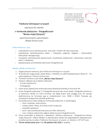 Regulamin konkursu plastyczno - fotograficznego „Barwy mojej Ojczyzny” „Biel śniegu i żar czerwieni i orły dumne, piastowskie, to wieczne symbole tej ziemi najbliższej sercu, bo polskiej.” M. Ogiński Publiczne Gimnazjum w Łysych zaprasza do udziału w konkursie plastyczno - fotograficznym “Barwy mojej Ojczyzny” pod honorowym patronatem Wójta Gminy Łyse Celem konkursu jest: rozbudzanie uczuć patriotycznych, szacunku i miłości do ziemi ojczystej, wzbudzenie zainteresowania dzieci i młodzieży pięknem bogatej i różnorodnej kolorystyki naszego kraju, rozwijanie zainteresowań plastycznych, wrażliwości estetycznej i aktywności twórczej dzieci i młodzieży; popularyzacja uczniowskiej twórczości fotograficznej. Zasady udziału w konkursie: 1. Organizatorem konkursu jest Publiczne Gimnazjum w Łysych. 2. W konkursie mogą wziąć udział dzieci i młodzież ze szkół podstawowych (klasy IV - VI) i gimnazjalnych z terenu Gminy Łyse. 3. Tematem konkursu jest hasło „Barwy mojej Ojczyzny”. 4. Konkurs odbywa się w dwóch zakresach: 1) praca plastyczna, 2) fotografia. 5. Autor pracy plastycznej wykonuje pracę dowolną techniką w formacie A4. 6. Autor fotografii wykonuje 2-3 fotografie barwne lub czarno-białe. Fotografie dostarcza w wymiarze 20x30 cm (inne formaty nie będą brane pod uwagę) oraz ich wersję elektroniczną (w formacje jpg w rozdzielczości min. 2398 x 3543). Pozwala się stosowanie programów obróbki graficznej. 7. Do każdej pracy należy dołączyć metryczkę (załącznik 1) zawierającą: imię i nazwisko, wiek autora, nazwę szkoły i klasę, do której uczeń uczęszcza, nazwisko opiekuna, tytuł i opis przedstawionej pracy (w kilku zdaniach), czas i miejsce wykonania zdjęcia (dotyczy prac fotograficznych). 8. Prace zamknięte w kopercie z dopiskiem „Konkurs plastyczno - fotograficzny Barwy mojej Ojczyzny” należy składać w sekretariacie szkoły lub odpowiednio zabezpieczone przesłać pocztą na adres: Publiczne Gimnazjum w Łysych, ul. Szkolna 1, 07-437 Łyse. 9. Termin dostarczania prac mija 28 października 2016 r. (piątek). 1 Regulamin konkursu plastyczno - fotograficznego „Barwy mojej Ojczyzny” 10. Każda zgłoszona praca musi być wykonana osobiście przez autora, bez pomocy osób trzecich, a także niepublikowana wcześniej np. w internecie. 11. Autor zgłaszając pracę na konkurs wypełnia oświadczenie (załącznik 2), które podpisują także rodzice. W przypadku fotografii z utrwalonym wizerunkiem innych osób, autor powinien mieć ich zgodę na prezentację wizerunku, co deklaruje w oświadczeniu. 12. Organizator zastrzega możliwość zaprezentowania nagrodzonych prac na wystawie w czasie uroczystego Wieczoru Patriotycznego „Barwy mojej Ojczyzny” organizowanego przez Publiczne Gimnazjum w Łysych. Zgłoszenie pracy do konkursu jest równoznaczne ze zgodą na udział w wystawie, a także na nieodpłatną reprodukcję pracy w materiałach edukacyjnych i promocyjnych szkoły (z podaniem autora). 13. Oceny prac dokona jury, powołane przez organizatora. Laureaci konkursu zostaną wyłonieni w dwóch kategoriach wiekowych (uczniowie szkoły podstawowej oraz uczniowie gimnazjum) w dwóch określonych zakresach: praca plastyczna i fotografia. W przypadku niskiej liczby zgłoszonych prac (poniżej 10) organizator zastrzega sobie możliwość wyłonienia laureata spośród wszystkich prac łącznie, bez podziału na kategorię wiekową. 14. Najlepsze prace zostaną nagrodzone /nagrody książkowe i dyplomy regulaminowe/. 15. Kryteria brane pod uwagę przy ocenie prac: poziom techniczny wykonania i estetyka, zrealizowanie hasła konkursowego „Barwy mojej Ojczyzny”, oryginalność ujęcia tematu i kreatywność. 16. Ogłoszenie wyników i wręczenie laureatom nagród i dyplomów odbędzie się podczas uroczystego Wieczoru Patriotycznego „Barwy mojej Ojczyzny” organizowanego przez Publiczne Gimnazjum w Łysych. 17. Możliwy jest zwrot prac biorących udział w konkursie. Prace będzie można odebrać po 14 listopada br. w sekretariacie szkoły. 18. Wszelkich informacji związanych z konkursem udziela pani Katarzyna Rynkiewicz, tel. 608 039 535. 19. Informacje o wynikach konkursu zostaną zamieszczone na stronie www.pglyse.pl oraz na stronie www.gminalyse.pl. Załączniki: 1. metryczka imię i nazwisko, wiek autora ……………………………………………………………………… nazwa szkoły i klasa …………………………………………………………………………………… nazwisko opiekuna ……………………………………………………………………………………. tytuł i opis przedstawionej pracy (w kilku zdaniach): czas i miejsce wykonania zdjęcia (dotyczy prac fotograficznych): 2 Regulamin konkursu plastyczno - fotograficznego „Barwy mojej Ojczyzny” 2. oświadczenie Oświadczam, że jestem autorem/autorką pracy zgłoszonej na Gminny Konkurs Plastyczno - Fotograficzny „Barwy mojej Ojczyzny”. Zgłaszając fotografię oświadczam, iż posiadam zgodę uwiecznionych osób na wykorzystanie ich wizerunku. Wyrażam zgodę na prezentację pracy w wystawie konkursowej i nieodpłatną reprodukcję pracy w materiałach edukacyjnych i promocyjnych szkoły. podpis ucznia: .............................................................................................. podpis rodzica ucznia: ................................................................................. 3