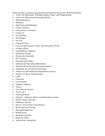 Wykaz tytułów czasopism zagranicznych prenumerowanych przez Bibliotekę Śląską Archiv für Diplomatik, Schriftgeschichte, Siegel- und Wappenkunde Archiv für Schleisische Kirchengeschichte Bibliotheksdienst Billboard BuB Buch und Bibliothek Česká Literatura Český Jazyk a Literatura Český Lid Der Schlesier Der Spiegel Die Zeit Financial Times Focus on International Library and Information Work Foreign Affairs Freudenthaler Ländchen Historický Časopis Historische Zeitschrift IFLA Journal Internationale Politik Jahrbuch der Deutschen Bibliotheken Jahrbuch für Schlesische Kirchengeschichte Jahrbücher für Geschichte Osteuropas Journal of Librarianship and Information Science Journal of Library Administration L'Obs Librarium Livres Hebdo Manager Magazin Nature New Musical Express Newsweek Osteuropa Recht Program : elektronic library and information systems Public Library Quarterly Publishers Weekly Review of Economics and Statistics Revue des Deux Mondes Riesengebirgsheimat Rolling Stone Russkaja Literatura Schlesien Heute Schlesischer Gebirgsbote Sight and Sound Slezský Sborník Slovanský Přehled The Economist The Spectator Time Vine Zeitschrift für Bibliothekswesen und Bibliographie