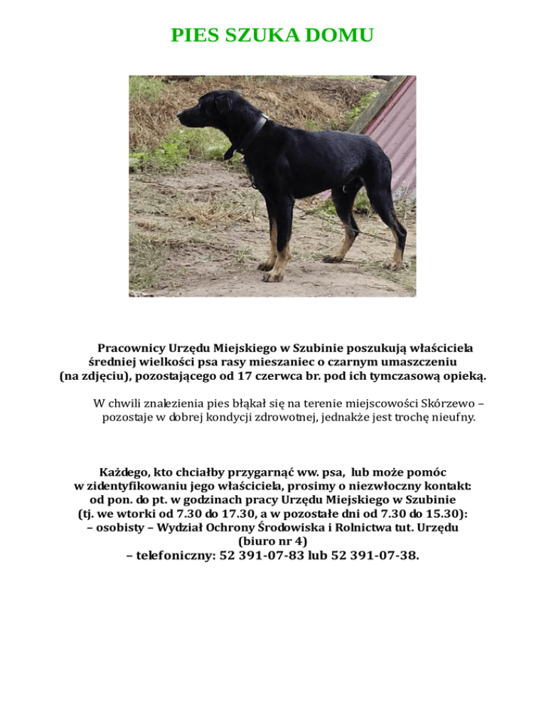 PIES SZUKA DOMU Pracownicy Urzędu Miejskiego w Szubinie poszukują właściciela średniej wielkości psa rasy mieszaniec o czarnym umaszczeniu (na zdjęciu), pozostającego od 17 czerwca br. pod ich tymczasową opieką. W chwili znalezienia pies błąkał się na terenie miejscowości Skórzewo – pozostaje w dobrej kondycji zdrowotnej, jednakże jest trochę nieufny. Każdego, kto chciałby przygarnąć ww. psa, lub może pomóc w zidentyfikowaniu jego właściciela, prosimy o niezwłoczny kontakt: od pon. do pt. w godzinach pracy Urzędu Miejskiego w Szubinie (tj. we wtorki od 7.30 do 17.30, a w pozostałe dni od 7.30 do 15.30): – osobisty – Wydział Ochrony Środowiska i Rolnictwa tut. Urzędu (biuro nr 4) – telefoniczny: 52 391-07-83 lub 52 391-07-38.