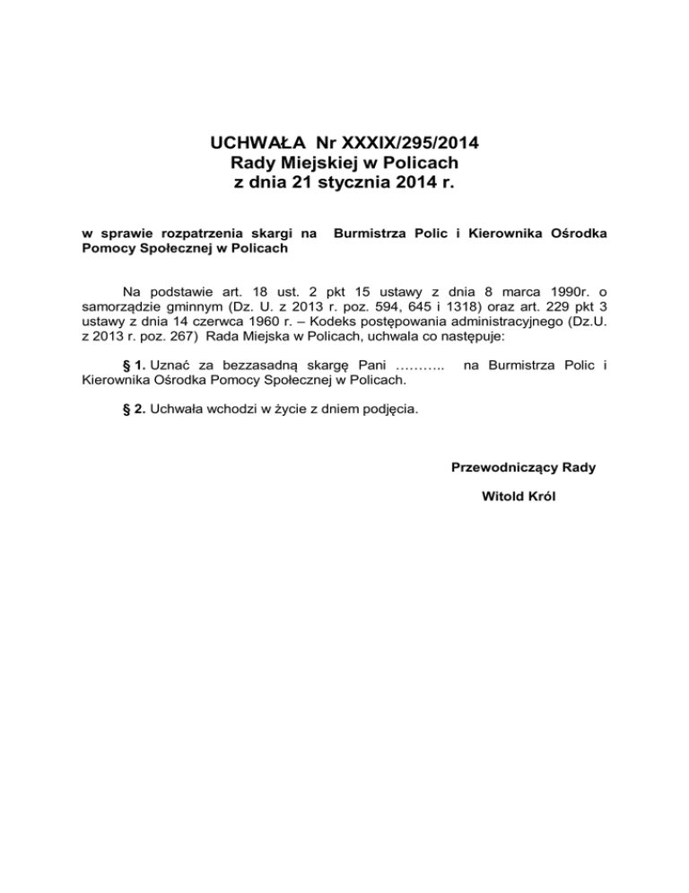UCHWAŁA Nr XXXIX/295/2014 Rady Miejskiej w Policach z dnia 21 stycznia 2014 r. w sprawie rozpatrzenia skargi na Pomocy Społecznej w Policach Burmistrza Polic i Kierownika Ośrodka Na podstawie art. 18 ust. 2 pkt 15 ustawy z dnia 8 marca 1990r. o samorządzie gminnym (Dz. U. z 2013 r. poz. 594, 645 i 1318) oraz art. 229 pkt 3 ustawy z dnia 14 czerwca 1960 r. – Kodeks postępowania administracyjnego (Dz.U. z 2013 r. poz. 267) Rada Miejska w Policach, uchwala co następuje: § 1. Uznać za bezzasadną skargę Pani ……….. Kierownika Ośrodka Pomocy Społecznej w Policach. na Burmistrza Polic i § 2. Uchwała wchodzi w życie z dniem podjęcia. Przewodniczący Rady Witold Król Uzasadnienie Projekt uchwały przedkłada Komisja Rewizyjna Rady Miejskiej w Policach. W dniu 21 listopada 2013 r. do Rady Miejskiej wpłynęła za pośrednictwem Zachodniopomorskiego Urzędu Wojewódzkiego skarga Pani …….. W skardze Pani ……… zarzuca Burmistrzowi Polic, Kierownikowi OPS w Policach i pracownikom OPS naruszenie jej praw rodzicielskich oraz pozbawienie jej mieszkania. Jak wynika z przeprowadzonego postępowania wyjaśniającego Pani …….. korzystała z różnorodnych form pomocy Ośrodka Pomocy Społecznej jak: zasiłek celowy, zasiłek rodzinny na córkę, świadczenia z funduszu alimentacyjnego jak również do października 2012 r. zasiłek pielęgnacyjny z tytułu niepełnosprawności. Sytuacja Pani ……… jest trudna z uwagi na fakt utraty przez Nią spółdzielczego własnościowego prawa do lokalu z zasobów SM „Chemik”. Mieszkanie to zostało zlicytowane w postępowaniu egzekucyjnym, w związku z zadłużeniem. Pani …………. wraz z córką Nikolą zamieszkała u ojca dziecka, prowadząc oddzielne gospodarstwo domowe. Strony pozostają jednak w złych relacjach. Pani ………. skarżyła się pracownikowi socjalnemu na zachowanie ojca dziecka. Jak twierdziła skarżąca ojciec dziecka zachowywał się niewłaściwie w obecności córki. Pracownik socjalny podejmował próby przekonania Pani …….. o wyprowadzeniu się z mieszkania ojca dziecka, zważywszy także na fakt, iż objęta jest Ona procedurą „Niebieskiej Karty”. Niestety Pani ……. zarówno na powyższe rozwiązanie jak też sugestie wizyty u psychologa, reagowała bardzo impulsywnie, wręcz krzykiem. Pani ……… jest osobą niepełnosprawną w stopniu umiarkowanym. Sąd Rejonowy Szczecin – Prawobrzeże i Zachód w Szczecinie w sprawie o zmianę orzeczenia w przedmiocie władzy rodzicielskiej, postanowieniem z dnia 7 listopada 2013r syg. akt VIII RNsm 791/13 postanowił z urzędu udzielić zabezpieczenia w ten sposób, że na czas trwania postępowania umieścić małoletnią córkę Pani ……. w placówce opiekuńczo – wychowawczej lub w pogotowiu opiekuńczym. Jak wynika z uzasadnienia w/w postanowienia w dniu 6 listopada 2013r do sądu wpłynął wniosek kuratora sprawującego nadzór w rodzinie o wydanie zarządzeń opiekuńczych w trybie nagłym wobec małoletniej albowiem kurator stwierdził, iż dobro dziecka jest zagrożone. Matka dziecka Pani ……….. mimo zobowiązania przez sąd nie podjęła leczenia, a jej stan zdrowia znacznie się pogorszył. Nadto między rodzicami małoletniej dochodzi do awantur i interwencji policji. Sąd uznał wniosek kuratora za zasadny i orzekł o umieszczeniu córki ……… w placówce. W dniu 29 listopada 2013r do Ośrodka Pomocy Społecznej w Policach z Domu Dziecka w Policach wpłynęła informacja o przyjęciu małoletniej Nikoli do placówki w dniu 8 listopada 2013r, na podstawie postanowienia Sądu z dnia 7 listopada 2013r. Do w/w informacji załączono postanowienie Sądu oraz skierowanie Powiatowego Centrum Pomocy Rodzinie w Policach z dnia 7 listopada 2013r kierujące w trybie nagłym córkę skarżącej do w/w Domu Dziecka. W świetle powyższego nie można zgodzić się z zarzutem skarżącej o naruszeniu jej praw rodzicielskich przez Burmistrza, Kierownika Ośrodka Pomocy Społecznej jak też pracowników tego Ośrodka. Decyzja bowiem w tym zakresie została podjęta przez Sąd na wniosek kuratora. Rola pracownika socjalnego sprowadzała się jedynie do przeprowadzania wywiadów środowiskowych z Panią ……… oraz oferowania jej pomocy w ramach procedury „Niebieskiej Karty”. Kolejną kwestią, którą porusza Pani …….. w skardze to pozbawienie jej mieszkania. Z wniosku wierzyciela Spółdzielni Mieszkaniowej „Chemik” w Policach w dniu 21 kwietnia 2009 r. została przeprowadzona licytacja komornicza mieszkania spółdzielczego własnościowego prawa do lokalu należącego do skarżącej i jej męża. Należy nadmienić, iż nowy właściciel mieszkania „wyrzucił” z niego rodzinę Pani ……. Od dnia 17 grudnia 2009 r. Pani ……… z córką Nikolą i swoją matką zamieszkały w lokalu socjalnym zajmowanym przez ojca małoletniej Nikoli. Pod tym adresem Pani ……….. wraz córką zamieszkuje do chwili obecnej. Skarżąca w dniu 04 listopada 2009 roku złożyła wniosek o przydział mieszkania z zasobów gminy Police. Wniosek został zarejestrowany pod nr GKM II – 71404/1367/2009. Nie było jednak możliwości przydziału mieszkania, ponieważ wniosek o przydział mieszkania złożony został w trakcie obowiązywania planu przydziału mieszkań na lata 2007-2009. Nie było również możliwości przydziału skarżącej lokalu socjalnego. Zgodnie bowiem z § 10 uchwały Rady Miejskiej w Policach nr XXXIV/239/05 z dnia 24 maja 2005 r. w sprawie zasad wynajmowania lokali wchodzących w skład mieszkaniowego zasobu gminy Police, umowy najmu lokalu socjalnego zawierane są z osobami, które nabyły prawo do lokalu socjalnego na podstawie prawomocnego orzeczenia sądowego bądź, które utraciły mieszkanie wskutek klęski żywiołowej, katastrofy lub pożaru. Wyrokiem z dnia 13 grudnia 2010 r. Sąd Okręgowy w Szczecinie II Wydział Cywilny Odwoławczy ustalił, iż skarżącej przysługuje uprawnienie do lo
