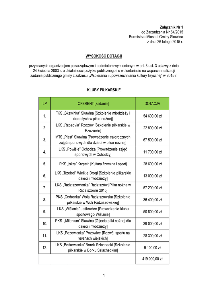 Załącznik Nr 1 do Zarządzenia Nr 64/2015 Burmistrza Miasta i Gminy Skawina z dnia 26 lutego 2015 r. WYSOKOŚĆ DOTACJI przyznanych organizacjom pozarządowym i podmiotom wymienionym w art. 3 ust. 3 ustawy z dnia 24 kwietnia 2003 r. o działalności pożytku publicznego i o wolontariacie na wsparcie realizacji zadania publicznego gminy z zakresu „Wspierania i upowszechniania kultury fizycznej” w 2015 r. KLUBY PIŁKARSKIE LP OFERENT [zadanie] DOTACJA 1. TKS „Skawinka” Skawina [Szkolenie młodzieży i dorosłych w piłce nożnej] 54 600,00 zł 2. LKS „Rzozovia” Rzozów [Szkolenie piłkarskie w Rzozowie] 22 800,00 zł 3. MTS „Piast” Skawina [Prowadzenie całorocznych zajęć sportowych dla dzieci w piłce nożnej] 67 500,00 zł 4. LKS „Powiśle” Ochodza [Prowadzenie zajęć sportowych w Ochodzy] 11 700,00 zł 5. RKS „Iskra” Krzęcin [Kultura fizyczna i sport] 28 600,00 zł 6. LKS „Trzebol” Wielkie Drogi [Szkolenie piłkarskie dzieci i młodzieży] 13 000,00 zł 7. LKS „Radziszowianka” Radziszów [Piłka nożna w Radziszowie 2015] 57 200,00 zł 8. PKS „Cedronka” Wola Radziszowska [Szkolenie piłkarskie w Woli Radziszowskiej] 36 400,00 zł 9. LKS „Wiślanie” Jaśkowice [Prowadzenie klubu sportowego Wiślanie] 50 800,00 zł 10. PKS „Milenium” Skawina [Zajęcia piłki nożnej dla dzieci i młodzieży] 39 000,00 zł 11. LKS „Pozowianka” Pozowice [Rozwój sportu na terenach wiejskich] 28 300,00 zł 12. LKS „Borkowianka” Borek Szlachecki [Szkolenie piłkarskie w Borku Szlacheckim] 9 100,00 zł 419 000,00 zł 1 POZOSTALI OFERENCI LP OFERENT [zadanie] DOTACJA 1. PUKS Pobiedr Paszkówka [Bieg przełajowy dwóch gmin] 3 000,00 zł 2. UKS Jedynka Skawina [Zadziw świat tańcem] 3 000,00 zł 3. PKS Milenium Skawina [Zajęcia ruchowe dla dzieci i młodzieży] 17 000,00 zł 4. PKS Milenium Skawina [Puchar Żubrów] 4 000,00 zł 5. UKS Akademia Piłkarska Skawina [Pozalekcyjne zajęcia sportowe dla dzieci i młodzieży] 3 000,00 zł 6. UKS Jedynka Skawina [Szkolenie siatkarskie z Jedynką] 7 000,00 zł 7. MUKS Walley Plus Duo Skawina [Zajęcia łyżwiarskie dla dzieci i młodzieży] 8 000,00 zł 8. UKS Jedynka - XIII Międzynarodowy Bieg Skawiński 40 000,00 zł 9. UKS Jedynka Skawina [Drugi Górski Bieg Niepodległości] 5 000,00 zł 10. UKS Polon Skawina [Zdrowy, aktywny styl życia] 3 000,00 zł 11. Stowarzyszenie Budujemy Nadzieję Skawina [Treningi kinect sports] 3 000,00 zł 12. Fundacja Budujemy Nadzieję Skawina [Fitness dla seniorów] 4 000,00 zł 13. Spółdzielnia Socjalna [Bajkowa Kraina] 2 500,00 zł 14. 15. SPONiIR Kruszynki Skawina [Organizacja zajęć sportowych 10 000,00 zł dla osób niepełnosprawnych] Stowarzyszenie Przyjaciół ZST-E [Active world] 2 1 000,00 zł 16. Fundacja Inkluzja - Edukacja Włączająca [Skawina PROaktywna] 6 000,00 zł 17. Rzymsko-Katolicka Parafia Miłosierdzia Bożego w Skawinie [II Gminna Olimpiada Przedszkolaków] 2 000,00 zł 18. Stowarzyszenie Szkoła Marzeń w Radziszowie [Czerp radość z aktywności] 3 000,00 zł 19. Stowarzyszenie OSP Przyjaciół św. Floriana Borek Szlachecki [Cykl turniejów gier stołowych] 1 000,00 zł 20. Chrześcijański Ośrodek Kultury w Skawinie [Piknik Rodzinny] 2 000,00 zł 21. Stowarzyszenie Miłośników Sportu Speed-ball Polska [Skawińska Szkółka Mistrzostwa Speed-ball] 6 000,00 zł 22. UKS Jedynka Skawina [Gminne Igrzyska Sportowe] 4 000,00 zł 23. Stowarzyszenie Absolwentów i Przyjaciół Liceum Ogólnokształcącego w Skawinie [Obóz żeglarski w Pucku] 3 000,00 zł 24. SWSiR Skimka Skawina [Nauka i doskonalenie umiejętności pływackich] 4 000,00 zł 25. SWSiR Skimka Skawina [Prowadzenie zajęć ogólnorozwojowych] 3 500,00 zł 26. SWSiR Skimka Skawina [XII Otwarte Mistrzostwa Rowerowe] 3 000,00 zł 27. Klub Sportowy Optima Skawina [VI Pływackie Mistrzostwa Skawiny] 4 500,00 zł 28. Klub Sportowy Optima Skawina [Treningi pływackie] 4 000,00 zł 29. Klub Sportowy Optima Skawina [Impreza sportowa Pokonaj Focha III] 7 500,00 zł 30. MTS Piast Skawina [Szkolenie sekcji piłki siatkowej dzieci] 4 000,00 zł 3 31. MTS Piast Skawina [Dragon Piast Cup 2015] 3 000,00 zł 32. MTS Piast Skawina [Szkolenie w brydżu sportowym] 4 000,00 zł 33. MTS Piast Skawina [Halowe Mistrzostwa Małopolski w piłce nożnej dziewcząt] 2 500,00 zł 34. MTS Piast Skawina [Dzień Dziecka na sportowo!] 7 000,00 zł 35. MTS Piast Skawina [Szkolenie sekcji piłki ręcznej] 10 000,00 zł 36. KJ Facimiech [Akademicki Puchar WKKW] 5 000,00 zł 37. KJ Facimiech [Mistrzostwa Polski WKKW] 10 000,00 zł 38. Stowarzyszenie FORUM [Forumiada siatkarska] 2 000,00 zł 39. Stowarzyszenie FORUM [Forumiada piłkarska] 2 000,00 zł 40. LKS Trzebol Wielkie Drogi [Prowadzenie zajęć wielosekcyjnych] 1 000,00 zł 41. LKS Trzebol Wielkie Drogi [Festyn rekreacyjno-sportowy z okazji 20-lecia LKS Trzebol] 1 000,00 zł 42. Prawicowy Blok Samorządowy [IV Familijny Turniej Tenisa Stołowego] 1 000,00 zł 43. LKS Radziszowianka Radziszów [Organizacja turnieju piłkarskiego] 1 500,00 zł 221 000,00 zł 4
