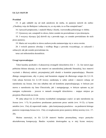 Łk 2,(1-14)15-20 Przekład 15. A gdy oddalili się od nich aniołowie do nieba, że pasterze mówili do siebie: „Chodźmy więc do Betlejem i zobaczmy to, co się stało, to co Pan oznajmił nam”. 16. I przyszli pośpiesznie, i znaleźli Marię i Józefa, i noworodka położonego w żłobie. 17. Ujrzawszy zaś, oznajmili to słowo, które zostało im powiedziane o tym dziecięciu. 18. I wszyscy słyszący [je] dziwili się z powodu tego, co zostało powiedziane do nich przez pasterzy. 19. Maria zaś wszystkie te słowa zachowywała zastanawiając się w sercu swoim. 20. I wrócili pasterze chwaląc i wielbiąc Boga z powodu wszystkiego, co usłyszeli i zobaczyli, tak jak zostało powiedziane im. teraz zaś miłosierdzia doznaliście. Uwagi wprowadzające Tekst kazalny pochodzi z Łukaszowej ewangelii dzieciństwa (Łk 1 – 2). Już nawet jego pobieżna lektura ukazuje, że nie stanowi on samodzielnej jednostki literackiej, lecz stanowi wycinek z dłuższej całości, przynajmniej jeśli chodzi o kontekst poprzedzający. Słusznie dlatego zasugerowano, aby w pracy nad kazaniem sięgnąć do dłuższego ustępu Łk 2,1-14. Cała sekcja bowiem Łk 2,1-20 tworzy zamkniętą w sobie całość i stanowi relację od narodzeniu się Jezusa. Jest ona odrębna tak od kontekstu poprzedzającego, w którym jest mowa o narodzeniu się Jana Chrzciciela, jak i następującego, w którym opisane są już następne wydarzenia – jeszcze w ramach ewangelii dzieciństwa – mające miejsce po przyjściu Zbawiciela na świat. W całej sekcji Łk 2,1-20 można wyodrębnić następujące części: a) opis narodzenia się Jezusa (ww. 1-7); b) poselstwo przekazane pasterzom przez anioła (ww. 8-12); c) hymn aniołów (ww. 13n); d) zapowiedź znaku – jako kontynuacja poselstwa – na podstawie którego pasterze rozpoznają Jezusa (ww. 15n); e) rozgłoszenie przez pasterzy dobrej nowiny (ww. 1720). Można zauważyć, że Łk 2,1-20 stanowi bardzo przemyślaną, wręcz poetycko ukształtowaną kompozycję. Bardzo wyraźnie dostrzegalne są w niej liczne motywy starotestamentowo-judaistyczne, zaczerpnięte przede wszystkim z obszaru żydowskich wyobrażeń soteriologicznych. Komentarz W. 15. Wiersz ten z jednej strony odsyła do kontekstu poprzedzającego – postaci pasterzy zostają wprowadzone na arenę wydarzeń wraz z w. 8. Mowa jest o tym, że stanął pośród nich anioł Pański i przekazał im radosną nowinę o narodzeniu się Zbawiciela (ww. 9-11). Następnie, że anioł wskazał im na znak, którym mają się kierować w swych poszukiwaniach małego Jezusa (ww. 12). Ta narracja zostaje przerwana opisem pojawienia się wojsk anielskich i wygłoszonego przez nich uwielbiającego hymnu na cześć narodzenia się Zbawiciela (ww. 13n). Wraz z analizowanym wierszem pasterze znów pojawiają się na arenie wydarzeń i wiersz ten kieruje wzrok już ku przyszłym wydarzeniom. Zmienia się też pozycja pasterzy – podczas gdy dotąd byli niejako biernymi świadkami i adresatami Bożego działania, teraz sami podejmują określone decyzje i kroki. Nie pozostali obojętni wobec otrzymanego od anioła poselstwa i wobec anielskiej teofanii. W zasadzie bez zastanowienia podjęli natychmiastową decyzję o pójściu do Betlejem, by spotkać się z nowonarodzonym Zbawicielem. Pragnęli zobaczyć to, co się wydarzyło, a o co obwieścił im anioł Pański. Zwrócić należy uwagę, jak istotną rolę w całym opowiadaniu dotyczącym pasterzy odgrywają elementy słuchania i widzenia. To one rodzą określone decyzje i działania, to one wiodą do poszukiwania Jezusa. Pasterze najpierw usłyszeli, a teraz pragną zobaczyć. W. 16. Wiersz ten w zasadzie bardzo zwięźle relacjonuje wydarzenie odnalezienia przez pasterzy Marii, Józefa i dzieciątka. Ale zwracają w nim uwagę dwa elementy. Po pierwsze, Łukasz podkreśla, że pasterze się śpieszyli (elthan speusantes). To ważne – w obliczu tak radosnej nowiny nie można być opieszałym. Należy podjąć szybkie decyzje i natychmiast działać. Jezusa należy szukać z całego serca przepełnionego żarliwym pragnieniem spotkania się z nim. Po drugie zaś wiersz ten odsyła do poselstwa anioła Pańskiego w tym jego fragmencie, w którym jest mowa o znaku, jakim mają się kierować pasterze w swych poszukiwaniach. Pasterze, odnalazłszy dzieciątko dokładnie tak, jak im powiedział Boży posłaniec – położone w żłobie, mogą być pewni, że Boże, zbawcze obietnice rzeczywiście się spełniły. W tym dzieciątku, położonym w surowym, być może brudnym i śmierdziącym żłobie, przyszedł na świat Zbawiciel, Chrystus Pan. W. 17. Ewangeliczna relacja Łukasza nie opisuje szczegółowo ani jak długo trwała wizyta pasterzy, ani jak przebiegała. Natomiast od razu wskazuje na ich reakcję – gdy ujrzeli dzieciątko, zaczęli rozgłaszać to, co im o nim powiedział anioł Pański. Tak więc od teraz to pasterze stali się – można powiedzieć – Bożymi posłańcami. Opowiadali to, co sami usłyszeli na temat nowonarodzonego dzieciątka od anioła. Zwrócić w tym kontekście należy uwagę na istotny szczegół – gdy mowa jest o ich działaniu, w tekście pojawia się sformułowanie, że rozgłosili to rhema to lalethen autois peri tou paidiou: słowo, które zostało im powiedziane o tym dziecięciu. Termin to rhema – słowo, wydarzenie – pojawia się też w w. 15., gdy pasterze podejmują decyzję, aby zobaczyć to, co się wydarzyło i co zostało im objawione przez anioła Pańskiego. Pasterze zatem, jako zwiastuni dobrej nowiny, przekazują dalej dokładnie to wszystko, co sami usłyszeli od Bożego posłańca – ani mniej, ani więcej. Dalej przekazują radosne, Boże objawienie. Są wierni bożonarodzeniowej Ewangelii. W. 18. Można tylko snuć przypuszczenia, do kogo kierowali oni swe zwiastowanie i dokąd w tym celu się udali. Być może w pierwszej kolejności, jak mógłby sugerować w. 19., przekazali tę wieść Marii i