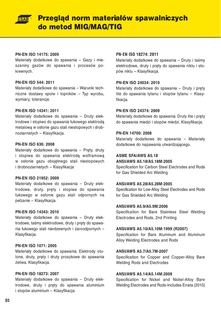 Przegląd norm materiałów spawalniczych do metod MIG/MAG/TIG PN-EN ISO 14175: 2009 Materiały dodatkowe do spawania – Gazy i mieszaniny gazów do spawania i procesów pokrewnych. PN-EN ISO 18274: 2011 Materiały dodatkowe do spawania – Druty i taśmy elektrodowe, druty i pręty do spawania niklu i stopów niklu – Klasyfikacja. PN-EN ISO 544: 2011 Materiały dodatkowe do spawania – Warunki techniczne dostawy spoiw i topników – Typ wyrobu, wymiary, tolerancje. PN-EN ISO 24034: 2010 Materiały dodatkowe do spawania – Druty i pręty lite do spawania tytanu i stopów tytanu – Klasyfikacja. PN-EN ISO 14341: 2011 Materiały dodatkowe do spawania – Druty elektrodowe i stopiwo do spawania łukowego elektrodą metalową w osłonie gazu stali niestopowych i drobnoziarnistych – Klasyfikacja. PN-EN ISO 24374: 2009 Materiały dodatkowe do spawania. Druty lite i pręty do spawania miedzi i stopów miedzi. Klasyfikacja. PN-EN ISO 636: 2008 Materiały dodatkowe do spawania – Pręty, druty i stopiwa do spawania elektrodą wolframową w osłonie gazu obojętnego stali niestopowych i drobnoziarnistych – Klasyfikacja PN-EN ISO 21952: 2009 Materiały dodatkowe do spawania – Druty elektrodowe, druty, pręty i stopiwa do spawania łukowego w osłonie gazu stali odpornych na pełzanie – Klasyfikacja. PN-EN ISO 14343: 2010 Materiały dodatkowe do spawania – Druty elektrodowe, taśmy elektrodowe, druty i pręty do spawania łukowego stali nierdzewnych i żaroodpornych – Klasyfikacja. PN-EN ISO 1071: 2005 Materiały dodatkowe do spawania. Elektrody otulone, druty, pręty i druty proszkowe do spawania żeliwa. Klasyfikacja. PN-EN ISO 18273: 2007 Materiały dodatkowe do spawania – Druty elektrodowe, druty i pręty do spawania aluminium i stopów aluminium – Klasyfikacja. D3 PN-EN 14700: 2008 Materiały dodatkowe do spawania – Materiały dodatkowe do napawania utwardzającego. ASME SFA/AWS A5.18 ANSI/AWS A5.18/A5.18M:2005 Specification for Carbon Steel Electrodes and Rods for Gas Shielded Arc Welding ANSI/AWS A5.28/A5.28M:2005 Specification for Low-Alloy Steel Electrodes and Rods for Gas Shielded Arc Welding ANSI/AWS A5.9/A5.9M:2006 Specification for Bare Stainless Steel Welding Electrodes and Rods, 2nd Printing ANSI/AWS A5.10/A5.10M:1999 (R2007) Specification for Bare Aluminum and Aluminum Alloy Welding Electrodes and Rods ANSI/AWS A5.7/A5.7M-2007 Specification for Copper and Copper-Alloy Bare Welding Rods and Electrodes ANSI/AWS A5.14/A5.14M:2009 Specification for Nickel and Nickel-Alloy Bare Welding Electrodes and Rods-Includes Errata (2010)