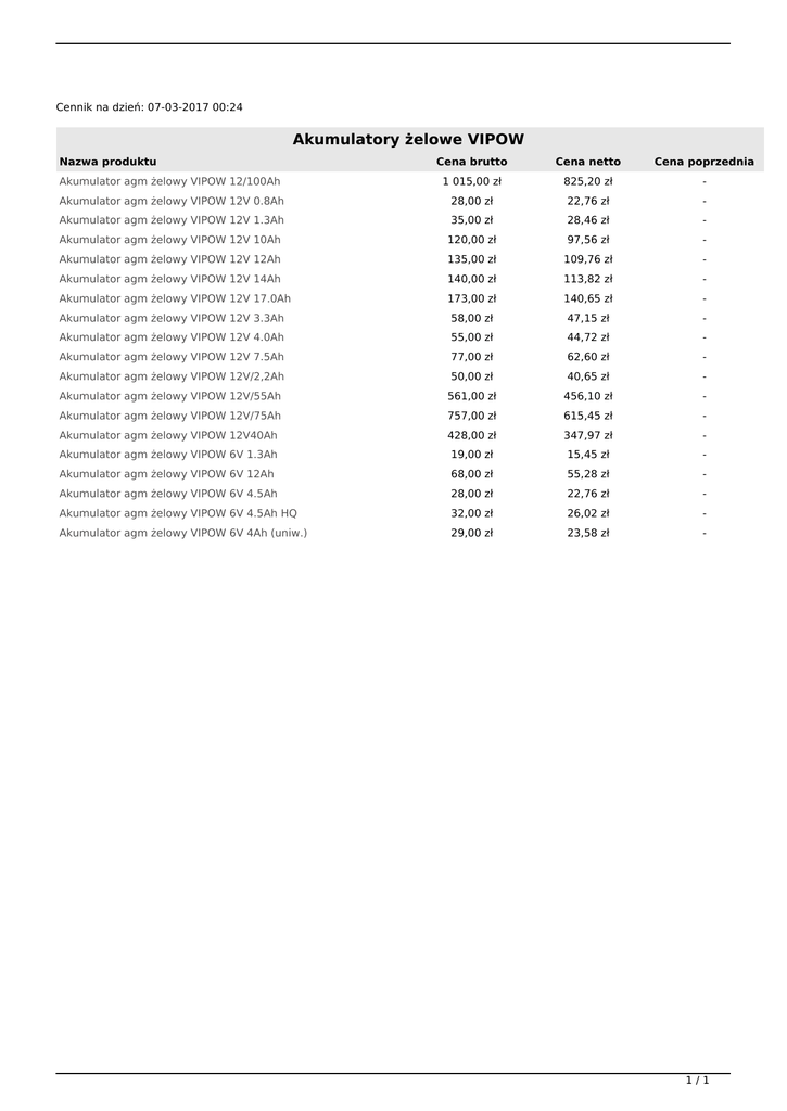 Cennik na dzień: 07-03-2017 00:24 Akumulatory żelowe VIPOW Nazwa produktu Cena brutto Cena netto Cena poprzednia Akumulator agm żelowy VIPOW 12/100Ah 1 015,00 zł 825,20 zł - Akumulator agm żelowy VIPOW 12V 0.8Ah 28,00 zł 22,76 zł - Akumulator agm żelowy VIPOW 12V 1.3Ah 35,00 zł 28,46 zł - Akumulator agm żelowy VIPOW 12V 10Ah 120,00 zł 97,56 zł - Akumulator agm żelowy VIPOW 12V 12Ah 135,00 zł 109,76 zł - Akumulator agm żelowy VIPOW 12V 14Ah 140,00 zł 113,82 zł - Akumulator agm żelowy VIPOW 12V 17.0Ah 173,00 zł 140,65 zł - Akumulator agm żelowy VIPOW 12V 3.3Ah 58,00 zł 47,15 zł - Akumulator agm żelowy VIPOW 12V 4.0Ah 55,00 zł 44,72 zł - Akumulator agm żelowy VIPOW 12V 7.5Ah 77,00 zł 62,60 zł - Akumulator agm żelowy VIPOW 12V/2,2Ah 50,00 zł 40,65 zł - Akumulator agm żelowy VIPOW 12V/55Ah 561,00 zł 456,10 zł - Akumulator agm żelowy VIPOW 12V/75Ah 757,00 zł 615,45 zł - Akumulator agm żelowy VIPOW 12V40Ah 428,00 zł 347,97 zł - Akumulator agm żelowy VIPOW 6V 1.3Ah 19,00 zł 15,45 zł - Akumulator agm żelowy VIPOW 6V 12Ah 68,00 zł 55,28 zł - Akumulator agm żelowy VIPOW 6V 4.5Ah 28,00 zł 22,76 zł - Akumulator agm żelowy VIPOW 6V 4.5Ah HQ 32,00 zł 26,02 zł - Akumulator agm żelowy VIPOW 6V 4Ah (uniw.) 29,00 zł 23,58 zł - 1/1 Powered by TCPDF (www.tcpdf.org)