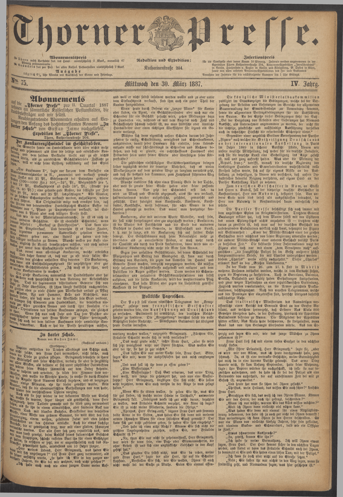 ftlr»- Abonnementspreis ^2 1 ? ^ . nebst Vorstädte frei ins H a u s : vierteljährlich 2 M a rk , monatlich 67 sie A „ s pränum erando; v W ä r t s frei per Post : bei allen Kaiser! Postanstalten vierteljährlich 2 Mark. Ausgabe Redaktion und Expedition: Katharinenstraße 204. Mittwoch den 30. März 1887. Abonnements Nekni- !> «Thorner Messe" pro H- Quartal 1887 sämmtliche Kaiserlichen Postanstalten, die ^ d b u e ftr ^ lg»g/buhinzutretende Abonnenten erhalten auf Ver g ab den Anfang des hochinteressanten Romans „ In Schute" von Gustav Zmme nachgeliefert. Expedition der „Warner Messe", _____ Thorn, Katharinenstraße 2 04.______ Im ^onkurrenzschwindek im Keschäftstköe». Seh»., ' ^ " " k rb e sowie im HandelSstande w ird über nichts mehr k»kr,n> gejammert als über dir leidige und erdrückende Kondem soliden Verkäufer bleibt n ur zu oft nichts »eh»,. "drjg, M zu unredlichem Geschäftsbetriebe Zuflucht zu setzt» "" ä iill er nicht seine Existenz vollständig auf das S p ie l ^te rig l^ ^"ufm ann T " , sagte vor kurzem dem Verfasser ein ''^ » " ^ « r e n h ä n d le r in N ., „annoncirt und verkauft gemahk o s t e n / i * ^ l t 31 P f., Börsenpreis bei Entnahme größerer ^ >Nit ia Z tr.) 3 0 's ,-3 2 's , P f-, Weizenstärke pro ^ Ztr. . d f., Einkaufspreis ab Halle 1 8 ^ P f-, (Fracht pro l°st»t «k d f ) ; eine gesunde gute Rosine, die billigst« zur Z e it ^ j u l l '' m it 35 P f. losgeschlagen/ Alle Waaren, j>r tzti» k- E" Schundpreisen verkauft werden, aufzuführen, würde >i«t lühren. A is O rig in a litä t möge noch erwähnt sein, daß ^ t l i a k ^ " ^ S bedeutendsten Handelsplatzes Sachsen Kaffee bei '!« Pfund zu Engrospreisen verkauft, bei E ntU„k ^ Pfund aber noch billigere Preise stellt, s^len ^ der Materialwaarenbranche, so ist es noch in Ödland ^ ^ ^ u Geschäften. Es ist ebenfalls Schwindel, wenn »>,»» .'" s e rirt: „V erkauf zu Fabrikpreisen". D a s kann nic»»»» Einzelverkauf. Und fernerhin ist eS fauler Zauber, ^ 1 , ^Lendwo permanente Ausverkäufe gehalten werden, hold geben vor, eine Fabrik zu haben und deskLiift» verkaufen zu können. Manche wollen per Kasse einKolk ' "°k>lrich sie K revit beanspruchen müssen, und noch andere ^ö a r unter dem Einkaufspreise verkaufen rc. iftvh nennt man allerdings Konkurrenz, welche erdrücken schilp, ^ "d daher kommt e», daß n ur zu oft viele solide Gevi»L den gleichen unsoliden Weg betreten D ie Konkurrenz, als Entschuldigungsgrund fü r ungehörigen oder gar e» Geschäftsbetrieb gelten. „Ic h muß es so thun, w eil Ne Konkurrenten so machen." ihre A r« Konkurrenz namentlich im HandelSstande aber hak jft ih.« "och hauptsächlich in dem Andrang der Arbeitskräfte 3,i>» ' Daß die sogenannten distributiven Gewerbe sich von li« Oahr überfüllen, ist schon längst statistisch nachgewiesen, bild" 'ben zu viele Hände zum Merkurstab anstatt zu P flu g ^ » d e l e u n d Hammer, Kell« und Richtscheit, man Elieber, als daß man in der Werkstelle sein B ro d verdient, -- Elemente »>»,,»rang«» 7 '» '" stch zum Handelsstand, die demselben nie» * i« r Ehre E h „ gereichen können und durch ihre sinnlosen G r ill ' Operationen den soliden Kaufmann zwingen, ein gleiches Hlvirtkc. Wenn sich nun nach J a h r und Tag jene Pfuscher abd»,H g a s te t haben und F ra u Pleite zur Thüre hereinguckt, ^ r r l'H auch bei dem soliden Kaufmann diese unwürdige KonAuch er hat die Preise herabsetzen müssen, I n harter Schule. Roman von G u s t a v I m m e . (Nachdruck verboten) (Fortsetzung) »vr »Spiere ^ 'r r e enthielten die Truhen allerdings und Schätze auch, be»,» / l solch,, wie F ra u H a rt vermuthete, nicht solche, nach feige v/'x,. zu graben pflegen. G ringm uth bewahrte in ihnen »>>r o». ^?lhrk und seine Schriften, verbarg sie ober so sorgfältig »ich lvlickrn, als befände er sich unter päpstlicher Ju risd iktio n N ,r . stin« Bücher sämmtlich aus dem In d e x stehende, kosten und arbeitete, so blieb sein Z im m e r stets vera»d » j w o l l t e die W irth in hinein, so mußtc sie durch Klopfen ^ v ,rr . ihres Namens Einlaß begehren, und es vergingen Hlftft» 'w ig r M in u te » , ehe ih r dieser gewährt wurde. Kein b>ag ' °aß st« hj» abenteuerlichsten Vorstellungen von dem hatte, A » « " l>en verschloflenen Thüren vorging, vftt. als st« jetzt wieder in der bekannten Weise um Einlaß ?*i»aiu> ^ warten, sogar länger als gewöhnlich, denn H err siehe» n,a r-^E e Toilette gemacht und sie blieb ganz verwundert l>koft»' a sie ihn in einem altmodischen, aber sauberen Rock von H o ff, .. Tuch m it blanken Knöpfen. Beinkleider von demselben n e u n te ," " " Weste von grünem Sam m et, die w eit über den Leib Aions^. » " ^ ' einem weißen, gefalteten Jabot und eben solchen l x" an den Händen erblickte. Auch die etwas fuchsige ^ta u in » die er gewöhnlich trug, w ar m it einer glatten, schwarzen lvftr ^ Uwrden. D e r alte H err sah ganz reputirlich aus, und Ulit geneigt, beim Anblick seines faltenreiches Gesichtes ib halte« t^ s ü g e n , schlecht rasirten B a rt ihn fü r einen SechSziger likft,,» sv erschien er jetzt, wo er augenscheinlich auch da» Ra"o. ^handhabt hatte, mindestens um 10 Jahre jünger. ^kftft "y,-, ^ Meine» Leben», H err G ringm uth, wa» haben S ie m * >lch angefangen!" rie f F ra u H a rt ganz verwundert, als ^ lh o lk wurde, „so habe ich S ie in den ganzen an» .J a h r e n , die S ie bei m ir wohnen, noch nicht gesehen!" ' H habe auch noch nie einer jungen Dame meine A u f- oder deren Raum 10 Pfennig. Inserate werden angenommen in der Thorn Katharinenstraße 204, Annoncen-Expedition „Jnvalidendank" Haasenstein u . Vogler in Berlin und Königsberg, M . Dukes in W ien, allen anderen Annoncen-Expeditionen des I n - und Auslandes Annahme der Inserate fü r die nächstfolgende Nummer bis 1 Uhr M ittags. t ä g l i c h 6 '/, Uhr Abends mit Ausschluß der S onn- und Feiertage. 75. Jnsertionspreis für die Spaltzeile Expeditio