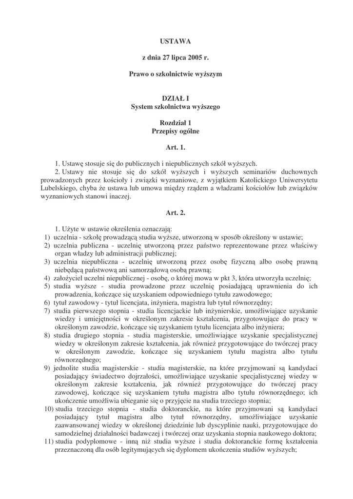 USTAWA z dnia 27 lipca 2005 r. Prawo o szkolnictwie wy szym DZIAŁ I System szkolnictwa wy szego Rozdział 1 Przepisy ogólne Art. 1. 1. Ustaw stosuje si do publicznych i niepublicznych szkół wy szych. 2. Ustawy nie stosuje si do szkół wy szych i wy szych seminariów duchownych prowadzonych przez ko cioły i zwi zki wyznaniowe, z wyj tkiem Katolickiego Uniwersytetu Lubelskiego, chyba e ustawa lub umowa mi dzy rz dem a władzami ko ciołów lub zwi zków wyznaniowych stanowi inaczej. Art. 2. 1. U yte w ustawie okre lenia oznaczaj : 1) uczelnia - szkoł prowadz c studia wy sze, utworzon w sposób okre lony w ustawie; 2) uczelnia publiczna - uczelni utworzon przez pa stwo reprezentowane przez wła ciwy organ władzy lub administracji publicznej; 3) uczelnia niepubliczna - uczelni utworzon przez osob fizyczn albo osob prawn nieb d c pa stwow ani samorz dow osob prawn ; 4) zało yciel uczelni niepublicznej - osob , o której mowa w pkt 3, która utworzyła uczelni ; 5) studia wy sze - studia prowadzone przez uczelni posiadaj c uprawnienia do ich prowadzenia, ko cz ce si uzyskaniem odpowiedniego tytułu zawodowego; 6) tytuł zawodowy - tytuł licencjata, in yniera, magistra lub tytuł równorz dny; 7) studia pierwszego stopnia - studia licencjackie lub in ynierskie, umo liwiaj ce uzyskanie wiedzy i umiej tno ci w okre lonym zakresie kształcenia, przygotowuj ce do pracy w okre lonym zawodzie, ko cz ce si uzyskaniem tytułu licencjata albo in yniera; 8) studia drugiego stopnia - studia magisterskie, umo liwiaj ce uzyskanie specjalistycznej wiedzy w okre lonym zakresie kształcenia, jak równie przygotowuj ce do twórczej pracy w okre lonym zawodzie, ko cz ce si uzyskaniem tytułu magistra albo tytułu równorz dnego; 9) jednolite studia magisterskie - studia magisterskie, na które przyjmowani s kandydaci posiadaj cy wiadectwo dojrzało ci, umo liwiaj ce uzyskanie specjalistycznej wiedzy w okre lonym zakresie kształcenia, jak równie przygotowuj ce do twórczej pracy zawodowej, ko cz ce si uzyskaniem tytułu magistra albo tytułu równorz dnego; ich uko czenie umo liwia ubieganie si o przyj cie na studia trzeciego stopnia; 10) studia trzeciego stopnia - studia doktoranckie, na które przyjmowani s kandydaci posiadaj cy tytuł magistra albo tytuł równorz dny, umo liwiaj ce uzyskanie zaawansowanej wiedzy w okre lonej dziedzinie lub dyscyplinie nauki, przygotowuj ce do samodzielnej działalno ci badawczej i twórczej oraz uzyskania stopnia naukowego doktora; 11) studia podyplomowe - inn ni studia wy sze i studia doktoranckie form kształcenia przeznaczon dla osób legitymuj cych si dyplomem uko czenia studiów wy szych; 12) studia stacjonarne - form studiów wy szych, w której program studiów jest realizowany w postaci zaj dydaktycznych wymagaj cych bezpo redniego udziału nauczycieli akademickich i studentów w wymiarze okre lonym standardami kształcenia dla tej formy studiów wskazan przez senat uczelni zgodnie z art. 169 ust. 2; 13) studia niestacjonarne - inn form studiów ni studia stacjonarne, z zachowaniem standardów kształcenia okre lonych dla tej formy studiów wskazan przez senat uczelni zgodnie z art. 169 ust. 2; 14) kierunek studiów - wyodr bniony obszar kształcenia; 15) makrokierunek studiów - obszar kształcenia stanowi cy poł czenie kierunków studiów maj cych podobne standardy kształcenia; 16) studia mi dzykierunkowe - studia wy sze prowadzone wspólnie na ró nych kierunkach przez uprawnione jednostki organizacyjne jednej lub kilku uczelni; 17) forma studiów - tryb studiowania i organizacj studiów; 18) standardy kształcenia - zbiór reguł kształcenia na studiach wy szych, prowadzonego w ró nych formach w ramach kierunków studiów, makrokierunków lub studiów mi dzykierunkowych; 19) immatrykulacja - akt przyj cia w poczet studentów uczelni; 20) student - osob kształc c si na studiach pierwszego lub drugiego stopnia albo jednolitych studiach magisterskich; 21) doktorant - uczestnika studiów doktoranckich; 22) uczelnia akademicka - uczelni , w której przynajmniej jedna jednostka organizacyjna posiada uprawnienie do nadawania stopnia naukowego doktora; 23) uczelnia zawodowa - uczelni prowadz c studia pierwszego lub drugiego stopnia albo jednolite studia magisterskie nieposiadaj c uprawnienia do nadawania stopnia naukowego doktora; 24) uczelnia wojskowa - uczelni publiczn nadzorowan przez Ministra Obrony Narodowej; 25) uczelnia słu b pa stwowych - uczelni publiczn nadzorowan przez ministra wła ciwego do spraw wewn trznych; 26) uczelnia artystyczna - uczelni publiczn nadzorowan przez ministra wła ciwego do spraw kultury i ochrony dziedzictwa narodowego; 27) uczelnia medyczna - uczelni publiczn nadzorowan przez ministra wła ciwego do spraw zdrowia; 28) uczelnia morska - uczelni publiczn nadzorowan przez ministra wła ciwego do spraw gospodarki morskiej; 29) podstawowa jednostka organizacyjna - wydział lub inn jednostk organizacyjn uczelni okre lon w statucie, prowadz ce co najmniej jeden kierunek studiów lub studia doktoranckie co najmniej w jednej dyscyplinie naukowej; 30) nauka i badania naukowe - tak e odpowiednio - sztuk i twórczo artystyczn ; 31) stopie naukowy doktora i stopie naukowy doktora habilitowanego - tak e odpowiednio stopie doktora sztuki i stopie doktora habilitowanego sztuki; 32) tytuł naukowy profesora - tak e odpowiednio - tytuł profesora sztuki; 33) podstawowe miejsce pracy - uczelni , w której nauczyciel akademicki pozostaje w stosunku pracy w pełnym wymiarze czasu pracy, wskazan w akcie stanowi cym podstaw zatrudnienia jako podstawowe miejsce pracy. 2. Ilekro w ustawie jest mowa o: 1) studiach, bez bli szego okre lenia - rozumie si przez to studia wy sze; 2) zwi zku uczelni, bez bli szego okre lenia - rozumie si przez to zwi zek uczelni publicznych lub zwi zek uczelni niepublicznych. 3. W uczelni, w której nie ma podstawowych jednostek organizacyjnych, przepisy ustawy dotycz ce takich jednostek stosuje si odpowiednio do ca