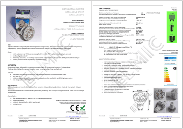 KARTA KATALOGOWA CATALOGUE SHEET KATALOGSEITE NAZWA PRODUKTU THE NAME OF PRODUCT /PRODUKT-NAME REFLEKTOR LED LED Spot Light / LED Reflektorlampe SYMBOL PRODUKTU THE CODE OF PRODUCT /PRODUKT-SYMBOL ELMIC XH 008 OPIS Reflektor LED o konwencjonalnym kształcie reflektora halogenowego stanowiąca zamiennik typowej żarówki halogenowej. Lampa oferuje wysoką wydajność przy bardzo niskim zużyciu energii, a także wysoką jakość wykończenia. Cechy: • • • • niskie zużycie energii elektrycznej (oszczędności nawet do 90% względem tradycyjnych żarówek) bardzo długa żywotność minimalny czas startu, nie wymaga rozgrzewania, natychmiastowa dostępność 100 % parametrów świetlnych nie jest przeznaczona do współpracy ze ściemniaczami TECHNICAL DATA / TECHNISCHE DATEN Źródło światła / Light Source / Lichtquelle Ilość elementów świetlnych / Number of Light Source / Lichtelementemenge Features: • low power consumption (saves up to 90% of power comparing to traditional light bulbs) • very long life • minimum start time, doesn't require warming up, immediate availability of 100% light parameters • not designed to work with dimmers BESCHREIBUNG LED-Scheinwerfer mit einer herkömmlichen Form von einen Halogen-Scheinwerfer ist ein Ersatz für eine typische HalogenGlühlampe. Das Leuchtmittel besticht durch eine hohe Effizienz bei gleichzeitig sehr niedrigem Energieverbrauch, sowie eine hochwertige Verarbeitung. Eigenschaften: • sehr geringer Verbrauch, dadurch bis zu 80% Energieeinsparung • hohe Lebensdauer • minimale Startzeit (sofort 100% Leuchtkraft) • nicht dimmbar LED 3x1W EPISTAR HIGH POWER LED Napięcie znamionowe / Rated voltage / Nennspannung Moc maksymalna / Max power / Elektrische Leistung Temperatura pracy / Temperature / Arbeitstemperaturen 220-240 V / 50 Hz 3W - 30°C~+40°C Wymiary / Dimensions / Dimensionen (D x H) Waga / Weight / Gewicht fi 50 x 59 mm 35 g Żywotność / Average work life / Mittlere Lebensdauer Stopień oddawania barw / Colour Rendering Index /Farbwiedergabeindex Skuteczność świetlna / Lamp Luminous Efficiency / Lichtausbeute Strumień świetlny / Lamp Luminous Flux / Lampen-Lichtstrom Kąt świecenia / Light angle / Strahl Winkel Temperatura barwowa/ Color Temperature / Farben-Temperatur (CCT) Liczba włączeń / Number of starts / Schaltzyklen > 25000 h CRI > 80 Ra 90-100 lm / W 270 – 300 lm 30/450 3000 K – 6500 K Mocowanie / Base Type / Fassung Przeznaczenie / Application Environment / Umwelt Anwendung Możliwość przyciemniania / Dimmable / Dimmbar Materiał obudowy / Housing Material / Gehȁusematerial E14 / E27 / GU10 Wewnętrzne / Indoor / Innen nie / no / nein Aluminium Symbol: ELMIC XH 008 pp / vvv / hh / cc / kk pp – moc / Power / Leistung vvv – napięcie / Voltage / Nennspannung hh – mocowanie / Base Type / Fassung cc – temperatura barwowa / Color Temperature / Farben-Temperatur kk – Kąt świecenia / Light angle / Strahl Winkel ETYKIETA ENERGETYCZNA ENERGY LABEL ENERGIEVERBRAUCHSKENNZEICHNUNG UWAGI / ATTENTION / ACHTUNG • DESCRIPTION Conventional shape LED spotlight constituting a replacement for conventional tungsten / halogen lamp. The lamp offers high performance at very low power consumption, and high quality finish. Mocowanie Base Type Fassung DANE TECHNICZNE • • • • • NIEPRAWIDŁOWE UŻYTKOWANIE MOŻE STANOWIĆ ZAGROŻENIE - PORAŻENIE PRĄDEM LUB NIEBEZPIECZEŃSTWO POŻARU używać tylko w środowisku suchym, elektrycznie bezpiecznym, używać w odpowiednich oprawach oświetleniowych, nie używać na zewnątrz lub w warunkach gorących, mokrych lub zaolejonych, nie demontuj żarówki, nie używaj jeżeli któraś z części jest uszkodzona, • • • • • • INVALID USE MAY CAUSE A DANGER - ELECTRIC SHOCK OR FIRE HAZARD use only dry environments, electrically safe, use the appropriate lighting fixtures, do not use outdoors or in hot conditions, wet or oily, do not disassemble the bulb, do not use if any part is damaged, • • • • • NICHT REGELGERECHTE NUTZUNG KANN ZUM STROMSCHLAG ODER FEUER FÜHREN Nur in Trockene und gut elektrischgesicherte Renne nutzen, Verwenden in der entsprechenden Leuchten, Verwenden Sie nicht im Freien oder in einem heißen, feuchten oder öligen, die Lampe nicht demontieren, • Wenn Teil beschädigt ist, nicht nutzen, WYRÓB POSIADA CERTYFIKATY I ZNAKI CE I ROHS PRODUCT HAS CERTYFICATES AND SIGNS CE AND ROHS DAS ERZEUGNIS HAT DIE ZERTIFIKATE CE UND ROHS WYPRODUKOWANO W CHINACH MADE IN CHINA Strona 1 z 2 rev. 1.0.3 ELMIC XH 008 Importer / Importeur: Przedsiębiorstwo Handlowo Usługowe FENIKS Cyprian Pawlaczyk www.elmic.pl, [email protected] ul. Słoneczna 110, Nowa Kuźnica, 42-350 Koziegłowy Polska - Poland NIP: 627-114-97-86 REGON: 240243739 Strona 2 z 2 rev. 1.0.3 ELMIC XH 008 Importer / Importeur: Przedsiębiorstwo Handlowo Usługowe FENIKS Cyprian Pawlaczyk www.elmic.pl, [email protected] ul. Słoneczna 110, Nowa Kuźnica, 42-350 Koziegłowy Polska - Poland NIP: 627-114-97-86 REGON: 240243739