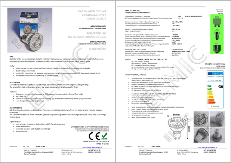 karta katalogowa reflektor led elmic xh 008