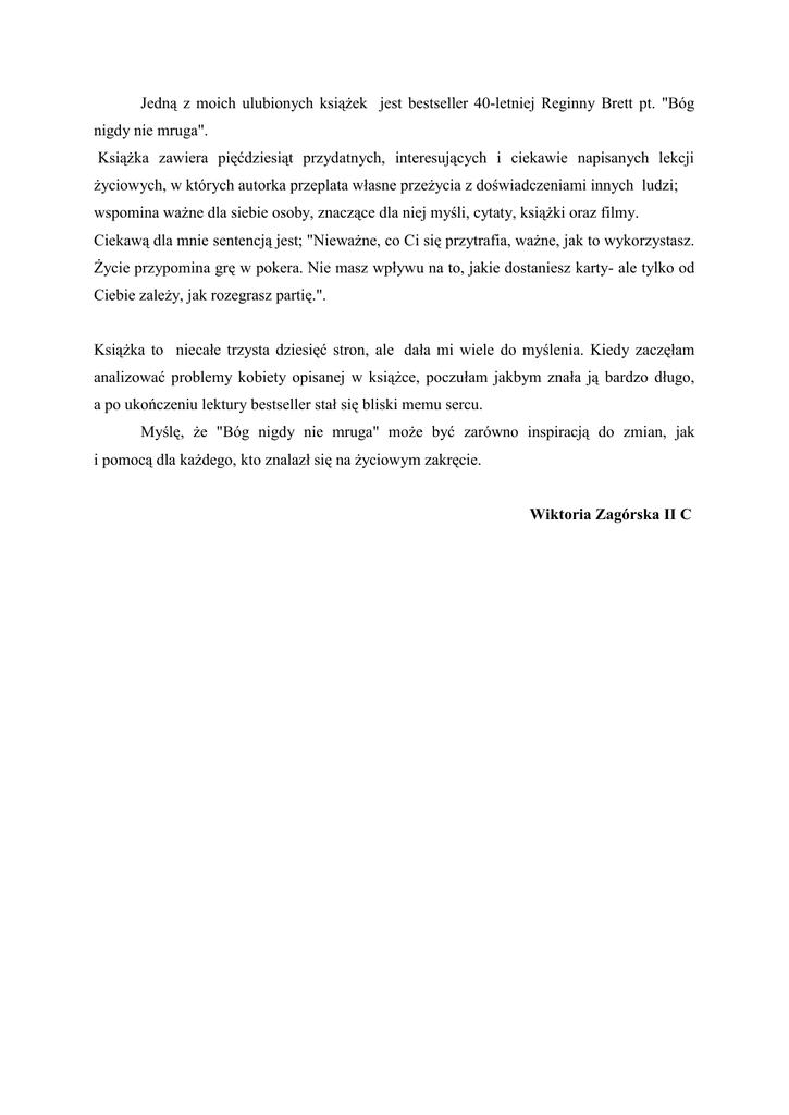 Jedną z moich ulubionych książek jest bestseller 40-letniej Reginny Brett pt. "Bóg nigdy nie mruga". Książka zawiera pięćdziesiąt przydatnych, interesujących i ciekawie napisanych lekcji życiowych, w których autorka przeplata własne przeżycia z doświadczeniami innych ludzi; wspomina ważne dla siebie osoby, znaczące dla niej myśli, cytaty, książki oraz filmy. Ciekawą dla mnie sentencją jest; "Nieważne, co Ci się przytrafia, ważne, jak to wykorzystasz. Życie przypomina grę w pokera. Nie masz wpływu na to, jakie dostaniesz karty- ale tylko od Ciebie zależy, jak rozegrasz partię.". Książka to niecałe trzysta dziesięć stron, ale dała mi wiele do myślenia. Kiedy zaczęłam analizować problemy kobiety opisanej w książce, poczułam jakbym znała ją bardzo długo, a po ukończeniu lektury bestseller stał się bliski memu sercu. Myślę, że "Bóg nigdy nie mruga" może być zarówno inspiracją do zmian, jak i pomocą dla każdego, kto znalazł się na życiowym zakręcie. Wiktoria Zagórska II C