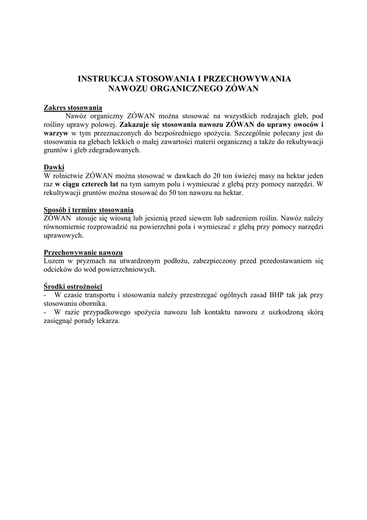 INSTRUKCJA STOSOWANIA I PRZECHOWYWANIA NAWOZU ORGANICZNEGO ZÓWAN Zakres stosowania Nawóz organiczny ZÓWAN moŜna stosować na wszystkich rodzajach gleb, pod rośliny uprawy polowej. Zakazuje się stosowania nawozu ZÓWAN do uprawy owoców i warzyw w tym przeznaczonych do bezpośredniego spoŜycia. Szczególnie polecany jest do stosowania na glebach lekkich o małej zawartości materii organicznej a takŜe do rekultywacji gruntów i gleb zdegradowanych. Dawki W rolnictwie ZÓWAN moŜna stosować w dawkach do 20 ton świeŜej masy na hektar jeden raz w ciągu czterech lat na tym samym polu i wymieszać z glebą przy pomocy narzędzi. W rekultywacji gruntów moŜna stosować do 50 ton nawozu na hektar. Sposób i terminy stosowania ZÓWAN stosuje się wiosną lub jesienią przed siewem lub sadzeniem roślin. Nawóz naleŜy równomiernie rozprowadzić na powierzchni pola i wymieszać z glebą przy pomocy narzędzi uprawowych. Przechowywanie nawozu Luzem w pryzmach na utwardzonym podłoŜu, zabezpieczony przed przedostawaniem się odcieków do wód powierzchniowych. Środki ostroŜności - W czasie transportu i stosowania naleŜy przestrzegać ogólnych zasad BHP tak jak przy stosowaniu obornika. - W razie przypadkowego spoŜycia nawozu lub kontaktu nawozu z uszkodzoną skórą zasięgnąć porady lekarza.