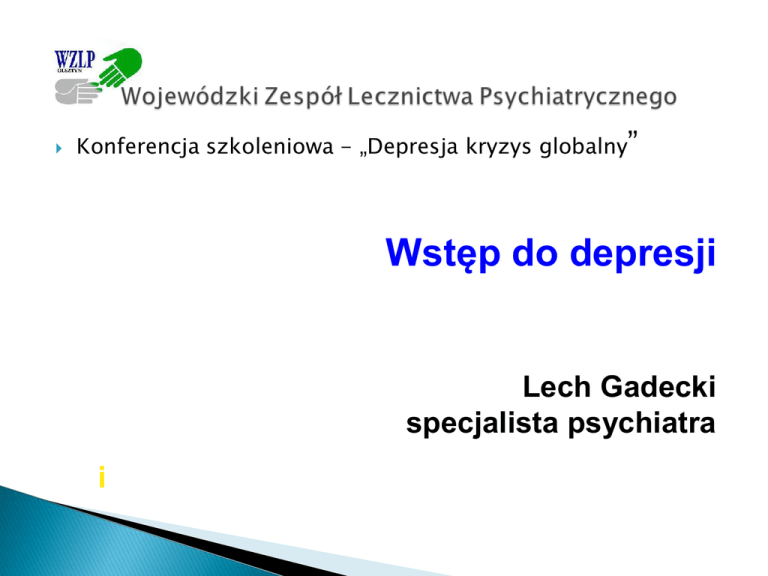 Konferencja szkoleniowa - „Depresja kryzys globalny” Wstęp do depresji Lech Gadecki specjalista psychiatra i Depresja – znaczenie terminu Termin depresja jest wieloznaczny: w języku potocznym określa się nim złe samopoczucie, obniżony nastrój, przygnębienie, niezależnie od przyczyn tego stanu w psychiatrii dotyczy szczególnego rodzaju zaburzeń nastroju i emocji, takich, które uznać można za zjawisko chorobowe, a więc wymagających pomocy lekarskiej granica pomiędzy „normalnym” przygnębieniem a depresją jako stanem chorobowym nie jest ostra, co nie oznacza zupełnej bezradności diagnostycznej „Normalne” przygnębienie a depresja Kryteria: • - obraz kliniczny, zwłaszcza nasilenie zaburzeń • - długość utrzymywania się • - wpływ na funkcjonowanie w życiu codziennym, w pracy, • potrzeba i skuteczność terapii Przygnębienie fizjologiczne („normalne”) i depresja jako zjawisko chorobowe Kryterium Przygnębienie Depresja nasilenie zazwyczaj złe smutek, samopoczucie, „chandra” przygnębienie czas utrzymywania się krótki (godziny) długi (tygodnie, miesiące) poczucie choroby zwykle nie występuje występuje często dezorganizacja aktywności zwykle nie występuje złożonej (codzienne lub jest mało znacząca czynności, kontakty z otoczeniem, praca zawodowa) występuje często Depresja – zgłaszane skargi • -poczucie stałego zmęczenia, ociężałości, • -niechęć do pracy i wykonywania codziennych czynności, • -„nic mnie nie cieszy”, „nic mnie nie interesuje”, • -brak satysfakcji z życia, niechęć do życia, • -gorsza pamięć, trudności ze skupieniem uwagi, • -ciągłe martwienie się (o dzień dzisiejszy, o jutro), • • • • • • • • -poczucie wewnętrznego napięcia, niepokoju, -unikanie kontaktów ze znajomymi, kolegami, -trudności w codziennych obowiązkach i w pracy, -płytki sen, wczesne budzenie się, -złe samopoczucie rano, -brak apetytu, chudnięcie, -zaparcie, wysychanie w ustach, -bóle (głowy, mięśni). Cechy i objawy zespołu depresyjnego typu endogennego - cechy i objawy podstawowe (osiowe) 1.Obniżenie nastroju: depresja (smutek, przygnębienie, ogólnie przykre przeżywanie ogółu wydarzeń), anhedonia, zobojętnienie depresyjne 2.Obniżenie napędu psychoruchowego: spowolnienie myślenia, tempa wypowiedzi, poczucie gorszej sprawności pamięci, intelektu, abulia, spowolnienie, zahamowanie ruchowe, utrata energii, siły, poczucie ciągłego zmęczenia fizycznego 3. Zaburzenia rytmu okołodobowego i objawy somatyczne: hiposomnia (wczesne budzenie się, sen płytki, przerywany), hipersomnia (z sennością w ciągu dnia), zaburzenia rytmu okołodobowego („rano gorzej, wieczorem lepiej”), bóle głowy, wysychanie jamy ustnej, zaparcia, zmniejszenie masy ciała 4. Lęk: poczucie napięcia, zagrożenia, trwożliwe oczekiwanie, niepokój (manipulacyjny), podniecenie ruchowe 1. Depresyjne zaburzenia myślenia: poczucie winy (urojenia grzeszności, winy, kary), depresyjna ocena własnej osobowości, zdrowia, szans wyleczenia (urojenia hipochondryczne, nihilistyczne), depresyjna ocena własnej sytuacji, przyszłości, przeszłości (urojenia, klęski, katastrofy), zniechęcenie do życia, myśli i tendencje samobójcze 2. Zaburzenia aktywności złożonej: zmniejszenie liczby i zakresu zainteresowań, pogorszenie zdolności do pracy, osłabienie kontaktów z otoczeniem, izolowanie się, zaniedbywanie się Skargi i objawy somatyczne występujące w zespołach depresyjnych -zaburzenia snu (typowo – bezsenność, niekiedy hipersomnia) -bóle głowy (potyliczne, opasujące – „kask”) -bóle typu neuralgicznego -utrata apetytu, niekiedy jadłowstręt -zaparcia (niekiedy biegunka) -dyskomfort, rozlane bóle w jamie brzusznej -zmniejszenie masy ciała (niekiedy zwiększenie) -niepokój w okolicy serca, dołku podsercowym -„zaciskanie” klatki piersiowej, poczucie duszności i „płytkiego oddechu” -skargi przypominające dławicę piersiową -umiarkowana tachykardia lub bradykardia -suchość jamy ustnej -palenie, pieczenie skóry, błon śluzowych -wzmożona potliwość -poczucie oziębienia stóp, rąk Czynniki ryzyka samobójstwa w depresjach 1.Cechy zespołu depresyjnego: -depresja o dużym nasileniu, -poczucie winy, poczucie beznadziejności, -niska samoocena, -lęk, niepokój, -bezsenność, -ujawniane myśli lub zamiary samobójcze 2.Cechy demograficzne: -wiek >45. rż., -płeć: mężczyzna, -owdowiała(y), rozwiedziona(y) 3.Sytuacja socjalna: -samotność, -brak wsparcia, -zła sytuacja materialna, -utrata pracy, źródeł utrzymania 4.Dane z wywiadu: -próby samobójcze w przeszłości, -samobójstwa osób bliskich (krewnych, osób znaczących dla pacjenta) 5.Inne cechy: -nadużywanie alkoholu, -zaburzenia osobowości, -przewlekłe choroby somatyczne, -przewlekłe dolegliwości bólowe Maski psychopatologiczne zaburzenia lękowe (lęk przewlekły, napadowy) natręctwa Jadłowstręt Zaburzenia rytmów biologicznych bezsenność nadmierna senność (hipersomnia) Maski „wegetatywne” i psychosomatyczne dławica piersiowa zaburzenia motoryki przewodu pokarmowego stany spastyczne dróg żółciowych zespół „niespokojnych nóg” świąd skóry Maski bólowe bóle głowy neuralgia (np. nerwu trójdzielnego) Maski behawioralne okresowe nadużywanie alkoholu okresowe nadużywanie leków Depresja i choroby somatyczne Depresja wpływa na obraz kliniczny i przebieg niektórych chorób somatycznych Okres depresji wiąże się wyraźnie z częstszym występowaniem chorób somatycznych Rozpowszechnienie depresji w populacji osób chorych somatycznie Rodzaj chorób somatycznych Rozpowszechnienie depresji choroby nerek do 20% choroba Parkinsona do 50% choroby tarczycy 20–30% choroby wątroby do 15% cukrzyca do 10% nowotwory 20–40% padaczka 20–30% udar mózgu 25–35% zawał serca 15–25% zespoły bólowe do 50% Metody stosowane w leczeniu zaburzeń afektywnych Far