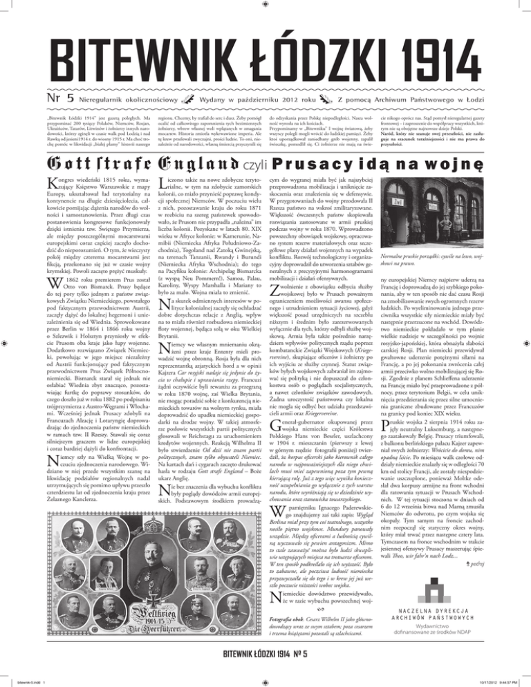 BITEWNIK ŁÓDZKI 1914 Nr 5 Nieregularnik okolicznościowy * Wydany w październiku 2012 roku ) Z pomocą Archiwum Państwowego w Łodzi „Bitewnik Łódzki 1914” jest gazetą poległych. Ma przypominać 200 tysięcy Polaków, Niemców, Rosjan, Ukraińców, Tatarów, Litwinów i żołnierzy innych narodowości, którzy zginęli w czasie walk pod Łodzią i nad Rawką od jesieni1914 r. do wiosny 1915 r. Ma choć trochę pomóc w likwidacji „białej plamy” historii naszego regionu. Chcemy, by trafiał do serc i dusz. Żeby pomógł ocalić od całkowitego zapomnienia tych bezimiennych żołnierzy, wbrew własnej woli wplątanych w zmagania mocarstw. Historia zmiotła wykrwawione imperia. Ale tę krew przelewali zwyczajni, prości ludzie. To oni, niezależnie od narodowości, własną śmiercią przyczynili się do odzyskania przez Polskę niepodległości. Nasza wolność wyrosła na ich kościach. Przypominamy w „Bitewniku” I wojnę światową, żeby wszyscy polegli mogli wrócić do ludzkiej pamięci. Żeby ktoś uporządkował zaniedbany grób wojenny, zapalił świeczkę, pomodlił się. Ci żołnierze nie mają na świe- cie nikogo oprócz nas. Stąd pomysł nieregularnej gazety frontowej – i zaproszenie do współpracy wszystkich, którym nie są obojętne najnowsze dzieje Polski. Naród, który nie szanuje swej przeszłości, nie zasługuje na szacunek teraźniejszości i nie ma prawa do przyszłości. G o t t s t r a f e E n g l a n d czyli P r u s a c y i d ą n a w o j n ę K L ongres wiedeński 1815 roku, wymazujący Księstwo Warszawskie z mapy Europy, ukształtował ład terytorialny na kontynencie na długie dziesięciolecia, całkowicie pomijając dążenia narodów do wolności i samostanowienia. Przez długi czas postanowienia kongresowe funkcjonowały dzięki istnieniu tzw. Świętego Przymierza, ale między poszczególnymi mocarstwami europejskimi coraz częściej zaczęło dochodzić do nieporozumień. O tym, że wieczysty pokój między czterema mocarstwami jest fikcją, przekonano się już w czasie wojny krymskiej. Powoli zaczęto prężyć muskuły. 1862 roku premierem Prus został Otto von Bismarck. Prusy będące do tej pory tylko jednym z państw związkowych Związku Niemieckiego, powstałego pod faktycznym przewodnictwem Austrii, zaczęły dążyć do lokalnej hegemoni i uniezależnienia się od Wiednia. Sprowokowane przez Berlin w 1864 i 1866 roku wojny o Szlezwik i Holsztyn przyniosły w efekcie Prusom oba kraje jako łupy wojenne. Dodatkowo rozwiązano Związek Niemiecki, powołując w jego miejsce niezależny od Austrii funkcjonujący pod faktycznym przewodnictwem Prus Związek Północnoniemiecki. Bismarck starał się jednak nie osłabiać Wiednia zbyt znacząco, pozostawiając furtkę do poprawy stosunków, do czego doszło już w roku 1882 po podpisaniu trójprzymierza z Austro-Węgrami i Włochami. Wcześniej jednak Prusacy zdobyli na Francuzach Alzację i Lotaryngię doprowadzając do zjednoczenia państw niemieckich w ramach tzw. II Rzeszy. Stawali się coraz silniejszym graczem w lidze europejskiej i coraz bardziej dążyli do konfrontacji. iemcy szły na Wielką Wojnę w poczuciu zjednoczenia narodowego. Widziano w niej przede wszystkim szansę na likwidację podziałów regionalnych nadal utrzymujących się pomimo upływu przeszło czterdziestu lat od zjednoczenia kraju przez Żelaznego Kanclerza. W N iczono także na nowe zdobycze terytorialne, w tym na zdobycie zamorskich kolonii, co miało przynieść poprawę kondycji społecznej Niemców. W poczuciu wielu z nich, pozostawanie kraju do roku 1871 w rozbiciu na szereg państewek spowodowało, że Prusom nie przypadła „należna” im liczba kolonii. Pozyskane w latach 80. XIX wieku w Afryce kolonie: w Kamerunie, Namibii (Niemiecka Afryka Południowo-Zachodnia), Togoland nad Zatoką Gwinejską, na terenach Tanzanii, Rwandy i Burundi (Niemiecka Afryka Wschodnia); do tego na Pacyfiku kolonie: Archipelag Bismarcka (z wyspą Neu Pommern!), Samoa, Palau, Karoliny, Wyspy Marshalla i Mariany to było za mało. Wojna miała to zmienić. a skutek odmiennych interesów w polityce kolonialnej zaczęły się ochładzać dobre dotychczas relacje z Anglią, wpływ na to miała również rozbudowa niemieckiej floty wojennej, będąca solą w oku Wielkiej Brytanii. iemcy we własnym mniemaniu okrążeni przez kraje Ententy mieli prowadzić wojnę obronną. Rosja była dla nich reprezentantką azjatyckich hord a w opinii Kajzera Car rosyjski nadaje się jedynie do życia w chałupie i uprawiania rzepy. Francuzi żądni oczywiście byli rewanżu za przegraną w roku 1870 wojnę, zaś Wielka Brytania, nie mogąc poradzić sobie z konkurencją niemieckich towarów na wolnym rynku, miała doprowadzić do upadku niemieckiej gospodarki na drodze wojny. W takiej atmosferze posłowie wszystkich partii politycznych głosowali w Reichstagu za uruchomieniem kredytów wojennych. Reakcją Wilhelma II było stwierdzenie Od dziś nie znam partii politycznych, znam tylko obywateli Niemiec. Na kartach dań i cygarach zaczęto drukować hasła w rodzaju Gott strafe England – Boże ukarz Anglię. ie bez znaczenia dla wybuchu konfliktu były poglądy dowódców armii europejskich. Podstawowym środkiem prowadzą- N N N cym do wygranej miała być jak najszybciej przeprowadzona mobilizacja i uniknięcie zaskoczenia oraz znalezienia się w defensywie. W przygotowaniach do wojny przodowała II Rzesza państwo na wskroś zmilitaryzowane. Większość ówczesnych państw skopiowała rozwiązania zastosowane w armii pruskiej podczas wojny w roku 1870. Wprowadzono powszechny obowiązek wojskowy, opracowano system rezerw materiałowych oraz szczegółowe plany działań wojennych na wypadek konfliktu. Rozwój technologiczny i organizacyjny doprowadził do utworzenia sztabów generalnych z precyzyjnymi harmonogramami mobilizacji i działań ofensywnych. wolnienie z obowiązku odbycia służby wojskowej było w Prusach powa