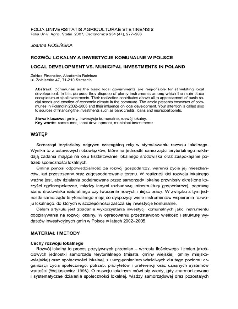 FOLIA UNIVERSITATIS AGRICULTURAE STETINENSIS Folia Univ. Agric. Stetin. 2007, Oeconomica 254 (47), 277–286 Joanna ROSIŃSKA ROZWÓJ LOKALNY A INWESTYCJE KOMUNALNE W POLSCE LOCAL DEVELOPMENT VS. MUNICIPAL INVESTMENTS IN POLAND Zakład Finansów, Akademia Rolnicza ul. Żołnierska 47, 71-210 Szczecin Abstract. Communes as the basic local governments are responsible for stimulating local development. In this purpose they dispose of plenty instruments among which the main place occupies municipal investments. Their realization contributes above all to appeasement of basic social needs and creation of economic climate in the commune. The article presents expenses of communes in Poland in 2002–2005 and their influence on local development. Your attention is called also to sources of financing the investments such as bank credits, loans and municipal bonds. Słowa kluczowe: gminy, inwestycje komunalne, rozwój lokalny. Key words: communes, local development, municipal investments. WSTĘP Samorząd terytorialny odgrywa szczególną rolę w stymulowaniu rozwoju lokalnego. Wynika to z ustawowych obowiązków, które na jednostki samorządu terytorialnego nakładają zadania mające na celu kształtowanie lokalnego środowiska oraz zaspokajanie potrzeb społeczności lokalnych. Gmina ponosi odpowiedzialność za rozwój gospodarczy, warunki życia jej mieszkańców, ład przestrzenny oraz zagospodarowanie terenu. W realizacji idei rozwoju lokalnego ważne jest, aby działania podejmowane przez samorządy lokalne przyniosły określone korzyści ogólnospołeczne, między innymi rozbudowę infrastruktury gospodarczej, poprawę stanu środowiska naturalnego czy tworzenie nowych miejsc pracy. W związku z tym jednostki samorządu terytorialnego mają do dyspozycji wiele instrumentów wspierania rozwoju lokalnego, do których w szczególności zalicza się inwestycje komunalne. Celem artykułu jest zbadanie wykorzystania inwestycji komunalnych jako instrumentu oddziaływania na rozwój lokalny. W opracowaniu przedstawiono wielkość i strukturę wydatków inwestycyjnych gmin w Polsce w latach 2002–2005. MATERIAŁ I METODY Cechy rozwoju lokalnego Rozwój lokalny to proces pozytywnych przemian – wzrostu ilościowego i zmian jakościowych jednostki samorządu terytorialnego (miasta, gminy wiejskiej, gminy miejsko-wiejskiej) oraz społeczności lokalnej, z uwzględnieniem właściwych dla tego poziomu organizacji życia społecznego: potrzeb, priorytetów i preferencji oraz uznanych systemów wartości (Wojtasiewicz 1998). O rozwoju lokalnym mówi się wtedy, gdy zharmonizowane i systematyczne działania społeczności lokalnej, władzy samorządowej oraz pozostałych 278 J. Rosińska podmiotów funkcjonujących w gminie zmierzają do kreowania nowych i do poprawy istniejących walorów użytkowych1 gminy, tworzenia korzystnych warunków dla lokalnej gospodarki oraz zapewnienia ładu przestrzennego i ekologicznego (Brol 1998). Podstawowym zadaniem władz samorządowych jest kreowanie i stymulowanie rozwoju lokalnego. Rozwój ten powinien mieć charakter rozwoju zintegrowanego, czyli odbywać się równocześnie i harmonijnie w sferach: społecznej, ekonomicznej, infrastrukturalnej, przestrzennej i ekologicznej. Jest on niezbędnym warunkiem tworzenia możliwie najlepszego środowiska życia dla jej mieszkańców, które obejmuje w szczególności takie walory użytkowe, jak (Majchrzak i Zalewski 2000): – zamieszkanie – dostępność mieszkań i warunków mieszkaniowych, w tym również czynniki kształtujące warunki życia w miejscu zamieszkania, tj. ład przestrzenny zabudowy, tereny zielone, tereny rekreacji i wypoczynku, obiekty sportowe, miejsca parkingowe itp.; – praca – możliwość uzyskania pracy i dochodów oraz warunki pracy; – obsługa – podstawowe usługi świadczone dla ludności w sferach: bytowej, oświaty, kultury i sztuki, ochrony zdrowia i opieki społecznej, rekreacji i wypoczynku, a także usługi wyspecjalizowane świadczone między innymi przez banki, instytucje ubezpieczeniowe czy firmy konsultingowe; – środowisko przyrodnicze – zasoby, walory oraz jakość środowiska naturalnego. Walory użytkowe, występujące w danej gminie, mogą podnosić lub obniżać jej atrakcyjność dla potencjalnych inwestorów. Jednym z kierunków działań władz lokalnych w tym zakresie jest kreowanie tzw. korzystnego klimatu gospodarczego, który ma przyciągać inwestorów, ułatwiać rozwój istniejących przedsiębiorstw oraz powstanie nowych firm. Samorząd osiąga ten cel poprzez tworzenie odpowiednich warunków do inwestowania. Warunkami tymi są (Dobrodziej 2002): – stabilność i bezpieczeństwo – oprócz stabilności prawnej i podatkowej odnosi się ono również do stabilności społecznej. W każdej gminie mogą istnieć bowiem lokalne ogniska niestabilności, które są związane na przykład z bezrobociem, strajkami, protestami czy podobnymi zjawiskami odstraszającymi potencjalnych inwestorów; – wykwalifikowana kadra – dopasowanie struktury zawodowej dostępnych na danym terytorium zasobów pracy oraz kwalifikacji do specyfiki terenu i potencjalnego zapotrzebowania; – infrastruktura gospodarcza – działalność gospodarcza jest w coraz większym stopniu uzależniona od obsługi technicznej. Stała dostawa różnych form energii, łatwość transportu, łączność tworzą warunki, bez których trudno znaleźć chętnych do inwestowania; – kapitał – jest to warunek niezbędny dla wszelkich procesów inwestycyjnych, w związku z czym należy podejmować działania w celu generowania kapitałów lokalnych; – gospodarka gruntami – szybka i rzetelna inwentaryzacja własności komunalnej oraz sprawne usuwanie przeszkód prawnych w sprzedaży lub dzierżawie mienia komunalnego są znacznym ułatwieniem przy rozpoczynaniu działalności inwestycyjnej; – planowanie przestrzenne – ogólny plan zagospodarowania przestrzennego powinien jasno okreś