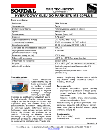 OPIS TECHNICZNY KLE/PAR/MS/2015 HYBRYDOWY KLEJ DO PARKIETU MS-30PLUS Dane techniczne: Podstawa: Konsystencja: System utwardzania: Spoina: Barwa spoiny: Gęstość: Lepkość (Brookfield mPas): Czas otwarty/układania: Czas korygowania Gotowość do przenoszenia obciążeń: Wytrzymałość na ścinanie (drewno/drewno EN14293): Zawartość masy suchej: Odporność termiczna: Odporność na starzenie: Zużycie: Wilgotność podłoża: Charakterystyka: Trwale elastyczny wodoodporny klej na bazie polimerów MS o bardzo wysokiej sile spajania – przeznaczony do klejenia każdego rodzaju drewna, w tym egzotycznego do praktycznie wszystkich podłoży budowlanych. Szybko osiąga wystarczającą do bezpiecznego obciążenia wytrzymałość (3h). Nie zawiera wody, rozpuszczalników, silikonów i izocyjanianów, co eliminuje ryzyko deformacji parkietu. Aplikowany pacą zębatą formuje stabilne ścieżki, nie cieknie i nie rozlewa się po podłożu. Polecany do klejenia drewna wrażliwego na wilgoć na trudnych, mało chłonnych podłożach. Odpowiedni również do ogrzewania podłogowego. Prawie bez- SMX Polimer Pasta Polimeryzacja z udziałem wilgoci Elastyczna Beżowa (jasny dąb) 1,72 g/cm3 Ok. 72.000 (HBT A/10) 25-30 minut (przy 21°C/50 % RH) 25-30 minut (przy 21°C/50 % RH) Min. 3h > 2N/mm² 100% wag. -40°C do +90°C (po utwardzeniu) Bardzo dobra 800 – 1200 g/m2 (w zależności od podłoża) Jastrychy cementowe i beton maks. 2% (metoda CM) Jastrychy anhydrytowe maks. 0,5% (metoda CM) wonny i bezpieczny dla otoczenia - najniższy poziom emisji substancji lotnych – klasa EC 1R PLUS. Zastosowanie: - Klejenie wszystkich typów podłóg drewnianych: parkietów i desek podłogowych zarówno litych, jak i klejonych warstwowo - Klejenie mozaiki, bruku drewnianego, gotowych podłóg typu finisz. Przeznaczony na podłoża porowate i nieporowate: posadzki anhydrytowe i cementowe, starą glazurę, kamień, drewno, płytę wiórową, sklejkę itp. Opakowanie: (3 x 6 kg = 18 kg). Hermetyczne worki aluminiowe. Strona 1 z 3 Soudal Sp. z o.o. - ul. Gdańska 7, Cząstków Mazowiecki, 05-152 Czosnów, tel/fax (22) 785 90 40 www.soudal.pl OPIS TECHNICZNY KLE/PAR/MS/2015 Przechowywanie: 12 miesięcy w fabrycznie zamkniętym opakowaniu w suchym i chłodny miejscu w temperaturze od + 5oC do +25oC. Normy i certyfikaty: Produkt wytwarzany przez firmę SOUDAL, zgodnie z systemem ISO 9001. Przygotowanie podłoża: - Przed ułożeniem parkietu zbadać stan podłoża w całym przekroju. Wilgotność powinna zawierać się w granicach zalecanych przez dostawcę parkietu (zwykle < 2% dla posadzek cementowych i < 0,5 % dla posadzek anhydrytowych, podłoża z ogrzewaniem podłogowym odpowiednio 1,5% i 0,3%). - Nowe jastrychy anhydrytowe i cementowe przeszlifować i odkurzyć. - Podłoże powinno być wysezonowane, równe, suche i czyste, pozbawione pęknięć i nierówności. Pozostałości starych klejów mające wpływ na przyczepność powinny zostać usunięte mechanicznie. - Luźne, sypkie lub uszkodzone podłoża muszą zostać naprawione, wyrównane i wzmocnione. - Przed przystąpieniem do klejenia podłoże zagruntować środkiem DEEP PRIMER WBPR-21P. - W przypadku układania parkietu na podłożu gładkim i niechłonnym – kamieniu polerowanym, lastryko lub płytkach ceramicznych dokładnie umyć i odtłuścić powierzchnię sodą kaustyczną lub innym odpowiednim płynem czyszczącym i dokładnie spłukać dużą ilością wody. Pozostawić podłogę do całkowitego wyschnięcia. Parkiet: - Parkiet powinien przez kilka dni aklimatyzować się w pomieszczeniu, w którym będzie układany. Aby uniknąć ewentualnych deformacji pozostawić parkiet w fabrycznym opakowaniu. - Sprawdzić, czy wilgotność drewna zawiera się w granicach zalecanych przez producenta parkietu (zwykle 7% - 9%). Nie zalecamy układania parkietu jeśli wilgotność drewna przekracza 11%. Klejenie parkietu: - Przed użyciem doprowadzić klej do temperatury pokojowej. - Nakładać równomiernie przy pomocy pacy zębatej B3/B11 (w zależności od wielkości parkietu) na powierzchnię, na której można ułożyć parkiet w czasie do 30 min. - Aby zapewnić odpowiednią wytrzymałość wymagane jest minimum 80% kontaktu klejonej powierzchni. - Klepkę parkietową ułożyć na warstwie kleju, lekko przesunąć, a następnie silnie docisnąć lub dobić gumowym młotkiem do podłoża. - Pozostawić odstęp ok. 1-1,5 cm pomiędzy parkietem a ścianą, kolumną lub każdym elementem stałym pomieszczenia. - Obciążenie parkietu podczas utwardzania kleju poprawia siłę spajania końcowego. - Ogrzewanie podłogowe można włączyć po całkowitym związaniu kleju. - Szlifowanie i lakierowanie wykonywać dopiero po całkowitym związaniu kleju, nie wcześniej niż po upływie 24 godzin od zakończenia robót. Uwaga! Ze względu na aklimatyzację drewna w pomieszczeniu zaleca się wykonanie szlifowania po co najmniej 14 dniach. Czyszczenie podłoża i narzędzi: Nieutwardzony klej MS-30Plus może być usunięty przy pomocy ściereczek SWIPEX Strona 2 z 3 Soudal Sp. z o.o. - ul. Gdańska 7, Cząstków Mazowiecki, 05-152 Czosnów, tel./fax (22) 785 90 40 www.soudal.pl OPIS TECHNICZNY KLE/PAR/MS/2015 i/lub preparatu Adhesive Remover. Klej utwardzony powinien być usuwany mechanicznie. Zalecenia: - Nie stosować na podłożach, które nie są zabezpieczone przed podsiąkaniem kapilarnym. - Nie nakładać kleju w temperaturze niższej niż 15°C i wyższej niż +25°C. - Minimalna temperatura podłoża 15°C. - Nie stosować przy wilgotności względnej > 75%. - Nie stosować na podłożach, których wilgotność przekracza granice zalecane przez dostawcę parkietu. - - - Nie stosować do klejenia drewna o wilgotności poniżej 7%. Drewno rozszerza się pod wpływem wilgoci i parkiet może zostać uszkodzony w przypadku znacznego wzrostu wilgotności. Nie stosować w pomieszczeniach, w których ściany były świeżo tynkowane lub malowane. Nie rozcie