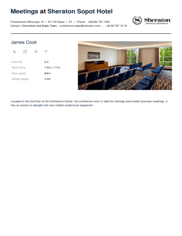 Meetings at Sheraton Sopot Hotel Powstancow Warszawy 10 • 81-718 Sopot • PL • Phone: (48)(58) 767 1000 Contact: Convention and Sales Team , [email protected], , +48 58 767 16 70 James Cook Floor No. 2.2 Room Size 7.8m x 7.7m Floor space 60m² Ceiling Height 3.0m Located on the 2nd floor of the Conference Center, the conference room is ideal for trainings and smaller business meetings. It has an access to daylight and very modern audiovisual equipment. Meetings at Sheraton Sopot Hotel Powstancow Warszawy 10 • 81-718 Sopot • PL • Phone: (48)(58) 767 1000 Contact: Convention and Sales Team , [email protected], , +48 58 767 16 70 James Cook • Default Floor Plan Max. Capacity: 50 Meetings at Sheraton Sopot Hotel Powstancow Warszawy 10 • 81-718 Sopot • PL • Phone: (48)(58) 767 1000 Contact: Convention and Sales Team , [email protected], , +48 58 767 16 70 James Cook • Banquet Max. Capacity: 40 Meetings at Sheraton Sopot Hotel Powstancow Warszawy 10 • 81-718 Sopot • PL • Phone: (48)(58) 767 1000 Contact: Convention and Sales Team , [email protected], , +48 58 767 16 70 James Cook • Theatre Max. Capacity: 50 Meetings at Sheraton Sopot Hotel Powstancow Warszawy 10 • 81-718 Sopot • PL • Phone: (48)(58) 767 1000 Contact: Convention and Sales Team , [email protected], , +48 58 767 16 70 James Cook • Reception Max. Capacity: 50 Meetings at Sheraton Sopot Hotel Powstancow Warszawy 10 • 81-718 Sopot • PL • Phone: (48)(58) 767 1000 Contact: Convention and Sales Team , [email protected], , +48 58 767 16 70 James Cook • Classroom Max. Capacity: 24 Meetings at Sheraton Sopot Hotel Powstancow Warszawy 10 • 81-718 Sopot • PL • Phone: (48)(58) 767 1000 Contact: Convention and Sales Team , [email protected], , +48 58 767 16 70 James Cook • U-Shape Max. Capacity: 23 Meetings at Sheraton Sopot Hotel Powstancow Warszawy 10 • 81-718 Sopot • PL • Phone: (48)(58) 767 1000 Contact: Convention and Sales Team , [email protected], , +48 58 767 16 70 James Cook • Hollow Square Max. Capacity: 32