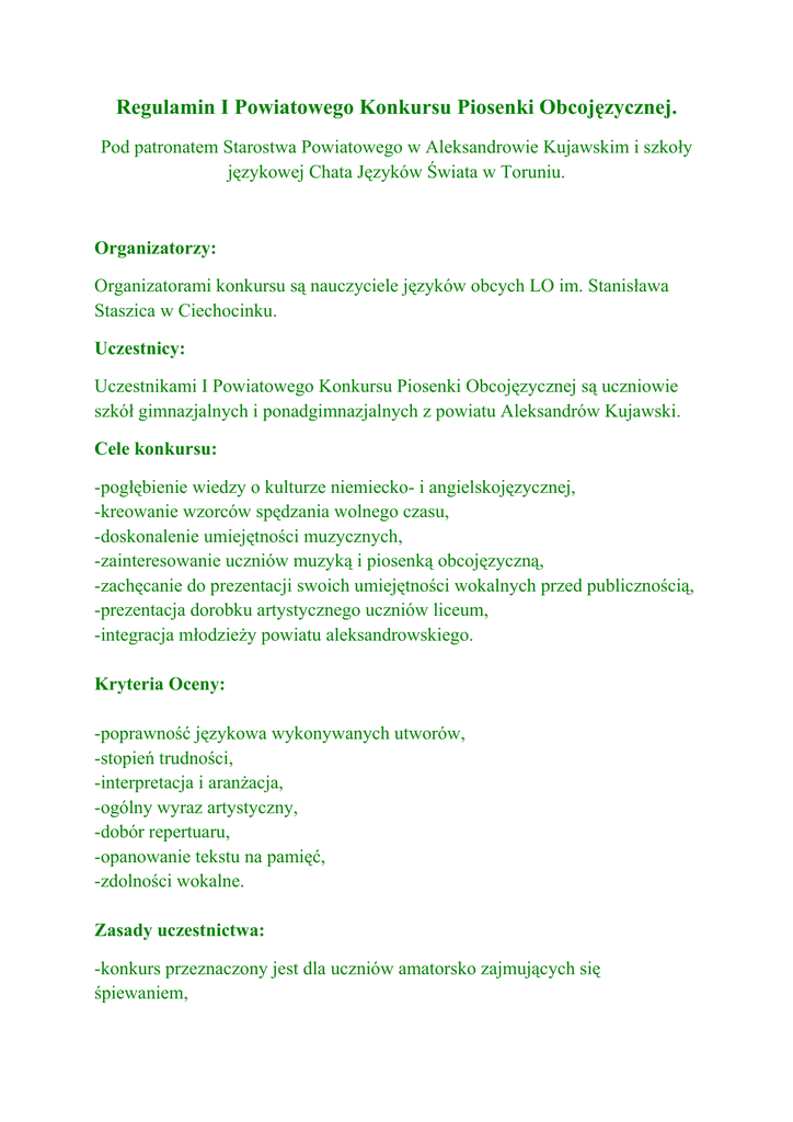Regulamin I Powiatowego Konkursu Piosenki Obcojęzycznej. Pod patronatem Starostwa Powiatowego w Aleksandrowie Kujawskim i szkoły językowej Chata Języków Świata w Toruniu. Organizatorzy: Organizatorami konkursu są nauczyciele języków obcych LO im. Stanisława Staszica w Ciechocinku. Uczestnicy: Uczestnikami I Powiatowego Konkursu Piosenki Obcojęzycznej są uczniowie szkół gimnazjalnych i ponadgimnazjalnych z powiatu Aleksandrów Kujawski. Cele konkursu: -pogłębienie wiedzy o kulturze niemiecko- i angielskojęzycznej, -kreowanie wzorców spędzania wolnego czasu, -doskonalenie umiejętności muzycznych, -zainteresowanie uczniów muzyką i piosenką obcojęzyczną, -zachęcanie do prezentacji swoich umiejętności wokalnych przed publicznością, -prezentacja dorobku artystycznego uczniów liceum, -integracja młodzieży powiatu aleksandrowskiego. Kryteria Oceny: -poprawność językowa wykonywanych utworów, -stopień trudności, -interpretacja i aranżacja, -ogólny wyraz artystyczny, -dobór repertuaru, -opanowanie tekstu na pamięć, -zdolności wokalne. Zasady uczestnictwa: -konkurs przeznaczony jest dla uczniów amatorsko zajmujących się śpiewaniem, -szkoła typuje 2 uczestników i zgłasza ich do konkursu, -każdy uczestnik prezentuje utwór jako solista, -uczestnik prezentuje 1 piosenkę w jednym z 2 języków (język angielski lub niemiecki), -akompaniament dowolny, -organizator zapewnia sprzęt nagłaśniający i sprzęt odtwarzający, -repertuar dowolny (zwrócić uwagę na kulturę języka, bez wulgaryzmów), -czas trwania prezentacji nie może przekroczyć 10 min. Warunki udziału: Warunkiem udziału w konkursie jest: -przesłanie do dnia 30 stycznia 2011 roku zgłoszenia wytypowanego ucznia. W zgłoszeniu należy podać nazwę i adres szkoły, nazwisko uczestnika i opiekuna, tytuł prezentowanego utworu i język, -zgłoszenia należy wysyłać w formie elektronicznej na adres: [email protected] lub faksem pod nr. 416-04-07. Kontakt telefoniczny: Bogusława Wojno 0-54-283-25-31 -dostarczenie w dniu konkursu na płycie CD, lub pendrive podkładu muzycznego wraz z opisem (tytuł piosenki, nazwa szkoły i wykonawca) do organizatorów konkursu (niedostarczenie podkładu eliminuje ucznia z przyczyn technicznych z konkursu). Podkład muzyczny nie może zawierać ścieżki wokalnej. Inne informacje: -próby akustyczne odbywają się w dniu konkursu od godz. 8:30, -planowany termin konkursu to 7 marca 2012 roku. -laureci I, II i III miejsca i nagrody publiczności otrzymują wartościowe nagrody. Nagrodą główną jest roczny kurs języka angielskiego w szkole językowej Chata Języków Świata w Toruniu o wartości 1500zł. Atrakcyjne nagrody za II i III miejsce zapewnia starosta. Wszyscy uczestnicy otrzymują pamiątkowe dyplomy, -w jury zasiadają osoby powołane przez organizatora konkursu.