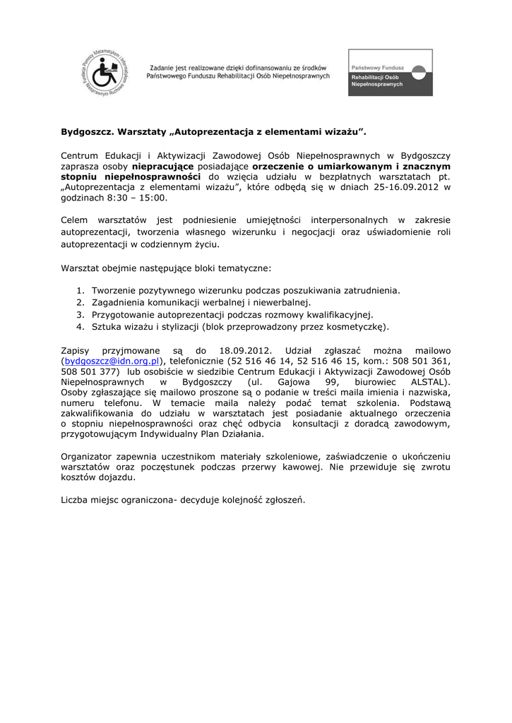 Bydgoszcz. Warsztaty „Autoprezentacja z elementami wizażu”. Centrum Edukacji i Aktywizacji Zawodowej Osób Niepełnosprawnych w Bydgoszczy zaprasza osoby niepracujące posiadające orzeczenie o umiarkowanym i znacznym stopniu niepełnosprawności do wzięcia udziału w bezpłatnych warsztatach pt. „Autoprezentacja z elementami wizażu”, które odbędą się w dniach 25-16.09.2012 w godzinach 8:30 – 15:00. Celem warsztatów jest podniesienie umiejętności interpersonalnych w zakresie autoprezentacji, tworzenia własnego wizerunku i negocjacji oraz uświadomienie roli autoprezentacji w codziennym życiu. Warsztat obejmie następujące bloki tematyczne: 1. 2. 3. 4. Tworzenie pozytywnego wizerunku podczas poszukiwania zatrudnienia. Zagadnienia komunikacji werbalnej i niewerbalnej. Przygotowanie autoprezentacji podczas rozmowy kwalifikacyjnej. Sztuka wizażu i stylizacji (blok przeprowadzony przez kosmetyczkę). Zapisy przyjmowane są do 18.09.2012. Udział zgłaszać można mailowo ([email protected]), telefonicznie (52 516 46 14, 52 516 46 15, kom.: 508 501 361, 508 501 377) lub osobiście w siedzibie Centrum Edukacji i Aktywizacji Zawodowej Osób Niepełnosprawnych w Bydgoszczy (ul. Gajowa 99, biurowiec ALSTAL). Osoby zgłaszające się mailowo proszone są o podanie w treści maila imienia i nazwiska, numeru telefonu. W temacie maila należy podać temat szkolenia. Podstawą zakwalifikowania do udziału w warsztatach jest posiadanie aktualnego orzeczenia o stopniu niepełnosprawności oraz chęć odbycia konsultacji z doradcą zawodowym, przygotowującym Indywidualny Plan Działania. Organizator zapewnia uczestnikom materiały szkoleniowe, zaświadczenie o ukończeniu warsztatów oraz poczęstunek podczas przerwy kawowej. Nie przewiduje się zwrotu kosztów dojazdu. Liczba miejsc ograniczona- decyduje kolejność zgłoszeń.