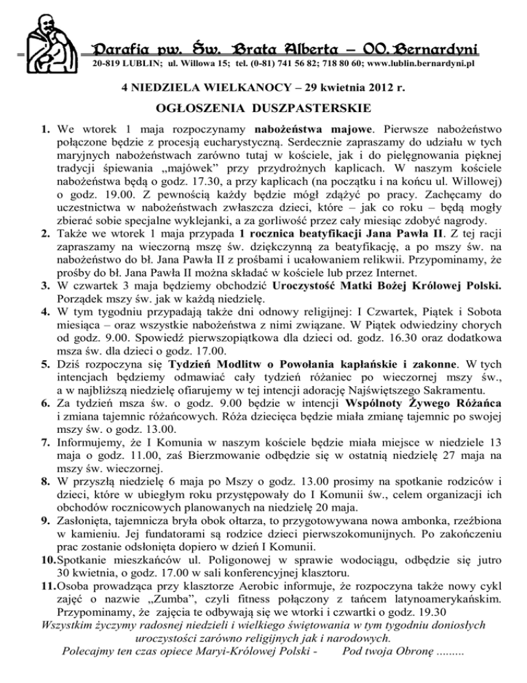 Parafia pw. Św. Brata Alberta – OO.Bernardyni 20-819 LUBLIN; ul. Willowa 15; tel. (0-81) 741 56 82; 718 80 60; www.lublin.bernardyni.pl 4 NIEDZIELA WIELKANOCY – 29 kwietnia 2012 r. OGŁOSZENIA DUSZPASTERSKIE 1. We wtorek 1 maja rozpoczynamy nabożeństwa majowe. Pierwsze nabożeństwo połączone będzie z procesją eucharystyczną. Serdecznie zapraszamy do udziału w tych maryjnych nabożeństwach zarówno tutaj w kościele, jak i do pielęgnowania pięknej tradycji śpiewania „majówek” przy przydrożnych kaplicach. W naszym kościele nabożeństwa będą o godz. 17.30, a przy kaplicach (na początku i na końcu ul. Willowej) o godz. 19.00. Z pewnością każdy będzie mógł zdążyć po pracy. Zachęcamy do uczestnictwa w nabożeństwach zwłaszcza dzieci, które – jak co roku – będą mogły zbierać sobie specjalne wyklejanki, a za gorliwość przez cały miesiąc zdobyć nagrody. 2. Także we wtorek 1 maja przypada 1 rocznica beatyfikacji Jana Pawła II. Z tej racji zapraszamy na wieczorną mszę św. dziękczynną za beatyfikację, a po mszy św. na nabożeństwo do bł. Jana Pawła II z prośbami i ucałowaniem relikwii. Przypominamy, że prośby do bł. Jana Pawła II można składać w kościele lub przez Internet. 3. W czwartek 3 maja będziemy obchodzić Uroczystość Matki Bożej Królowej Polski. Porządek mszy św. jak w każdą niedzielę. 4. W tym tygodniu przypadają także dni odnowy religijnej: I Czwartek, Piątek i Sobota miesiąca – oraz wszystkie nabożeństwa z nimi związane. W Piątek odwiedziny chorych od godz. 9.00. Spowiedź pierwszopiątkowa dla dzieci od. godz. 16.30 oraz dodatkowa msza św. dla dzieci o godz. 17.00. 5. Dziś rozpoczyna się Tydzień Modlitw o Powołania kapłańskie i zakonne. W tych intencjach będziemy odmawiać cały tydzień różaniec po wieczornej mszy św., a w najbliższą niedzielę ofiarujemy w tej intencji adorację Najświętszego Sakramentu. 6. Za tydzień msza św. o godz. 9.00 będzie w intencji Wspólnoty Żywego Różańca i zmiana tajemnic różańcowych. Róża dziecięca będzie miała zmianę tajemnic po swojej mszy św. o godz. 13.00. 7. Informujemy, że I Komunia w naszym kościele będzie miała miejsce w niedziele 13 maja o godz. 11.00, zaś Bierzmowanie odbędzie się w ostatnią niedzielę 27 maja na mszy św. wieczornej. 8. W przyszłą niedzielę 6 maja po Mszy o godz. 13.00 prosimy na spotkanie rodziców i dzieci, które w ubiegłym roku przystępowały do I Komunii św., celem organizacji ich obchodów rocznicowych planowanych na niedzielę 20 maja. 9. Zasłonięta, tajemnicza bryła obok ołtarza, to przygotowywana nowa ambonka, rzeźbiona w kamieniu. Jej fundatorami są rodzice dzieci pierwszokomunijnych. Po zakończeniu prac zostanie odsłonięta dopiero w dzień I Komunii. 10. Spotkanie mieszkańców ul. Poligonowej w sprawie wodociągu, odbędzie się jutro 30 kwietnia, o godz. 17.00 w sali konferencyjnej klasztoru. 11. Osoba prowadząca przy klasztorze Aerobic informuje, że rozpoczyna także nowy cykl zajęć o nazwie „Zumba”, czyli fitness połączony z tańcem latynoamerykańskim. Przypominamy, że zajęcia te odbywają się we wtorki i czwartki o godz. 19.30 Wszystkim życzymy radosnej niedzieli i wielkiego świętowania w tym tygodniu doniosłych uroczystości zarówno religijnych jak i narodowych. Polecajmy ten czas opiece Maryi-Królowej Polski Pod twoja Obronę .........