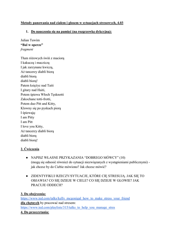 Metody panowania nad ciałem i głosem w sytuacjach stresowych, 4.03 1. Do nauczenia się na pamięć (na rozgrzewkę dykcyjną): Julian Tuwim “Bal w operze” fragment Tłum różowych świń z maciorą I kakuczą i macziczą I jak zarzynane kwiczą, Aż tancerzy diabli biorą diabli biorą diabli biorą! Patem księżyc nad Taiti I gitary nad Haiti, Potem śpiewa Włoch Tęsknotti Zakochane totti-frotti, Potem duo Pitt and Kitty, Klowny się po pyskach piorą I śpiewają: I am Pitty I am Pitt I love you Kitty, Aż tancerzy diabli biorą diabli biorą diabli biorą! 2. Ćwiczenia ● NAPISZ WŁASNE PRZYKAZANIA “DOBREGO MÓWCY” (10) (mogą się odnosić również do sytuacji niezwiązanych z wystąpieniami publicznymi) jak chcesz by do Ciebie mówiono? Jak chcesz mówić? ● ZIDENTYFIKUJ RZECZY/SYTUACJE, KTÓRE CIĘ STRESUJĄ. JAK SIĘ TO OBJAWIA? CO SIĘ DZIEJE W CIELE? CO SIĘ DZIEJE W GŁOWIE? JAK PRACUJE ODDECH? 3. Do obejrzenia: https://www.ted.com/talks/kelly_mcgonigal_how_to_make_stress_your_friend dla chętnych by pracować nad stresem: https://www.ted.com/playlists/315/talks_to_help_you_manage_stres 4. Do przeczytania: Poniżej kilka rad prewencyjnych - zanim zaczniesz się stresować (ćwiczenia sytuacyjne na zajęciach): - Mów tylko o tym, co cię obchodzi. - Bądź przygotowany (merytorycznie). - Przemyśl jakie są 3 najważniejsze treści (punkty) Twojej wypowiedzi, które chcesz żeby wszyscy zapamiętali (nie więcej). Na nie kładź nacisk, weryfikuj czy zostały zrozumiane wszystko ponad to jest ozdobnikiem oraz sukcesem Twoim i słuchacza (oraz waszej relacji). - Rozpoznaj publiczność (Kim są ludzie do których mówię? Ilu ich będzie? Jakich słów mogą się spodziewać, jakimi możesz zaskoczyć - wiek może być istotny w tym zakresie? Co stanowi płaszczyznę porozumienia między wami?). - Poznaj przestrzeń (jeśli możesz - przynajmniej dzień wcześniej) - będziesz mieć przewagę, wiedzieć, czy światło nie oślepia i czy stolik się nie zarwie jeśli poszukasz w nim oparcia. Mniej rzeczy może Cię wtedy zaskoczyć - zadbasz na przykład o obcasy by wystawać zza mównicy. - Bądź skupiony (maksymalne skupienie to maksymalne rozluźnienie!) - bądź obecny. Spójrz jak reagują słuchacze, powiedz coś, co przywróci ich dusze do ciał - na przykład o tej musze pod sufitem. - Nie bój się pokazać, że oddychasz (oddychaj!)! - Daj sobie czas (nie mów za szybko!) - jeśli często słyszysz (nawet jeśli tylko od starszych osób) prośbę żeby mówić wolniej - pamiętaj, by podczas wystąpienia wydawało Ci się, że mówisz troszkę zbyt wolno - ludzie zdenerwowani najczęściej przyspieszają. - Dbaj o siebie (wysypiaj się - robienie prezentacji noc wcześniej to zły pomysł. Naprawdę. Jedz - najlepiej dobre rzeczy, ale zadbaj o jakiekolwiek pożywieni przed wystąpieniem nawet, jeśli wydaje Ci się, że wcale nie chcesz jeść. Ruszaj się zdrowo - odrobina wysiłku fizycznego przed wystąpieniem znacznie redukuje zdenerwowanie). - komunikuj swoje potrzeby; umiej przyznać przed sobą, że w tym momencie jesteś zestresowany/a Emocje (w tym - stres) Christof Koch, Neurobiologia na tropie świadomości, WUW 2008, s. 104 Antonio Damasio twierdzi, że świadomość rozszerzona, czyli aspekty świadomości odpowiedzialne, za wytworzenie przeświadczenia, że w mózgu znajduje się jego właściciel i obserwator, jest ściśle związana z określonym dopływem informacji z ciała, wewnątrz którego się on znajduje. Damasio sądzi, ze świadomość rozszerzona nie może istnieć bez wrażeń proprioceptywnych, trzewnych i innych, które bezustannie dostarczają mózgowi informacji na temat stanu ciała. Uważa on, że poczucie własnego ja jest nierozerwalnie związane z emocjami Formy aktywności umysłu - ujęcia kognitywistyczne Tom 1: emocje, percepcja, świadomość pod. red. A. Klawiter, PWN 2008, s. 127-128 Emocje wpływają na zmianę operacyjnych charakterystyk procesów poznawczych i wybór działania. Istnieją neuronaukowe dowody na to, że afekt jest zasadniczy dla ukształtowania długotrwałych wspomnień. Ma także poważne konsekwencje dla alokacji uwagi. Strach prowadzi do koncentracji uwagi na detalach, natomiast sytuacja pozytywnego afektu skłania ludzi do koncentracji uwagi na szerszym obrazie. Preferowany system operujący zadań, takich jak mobilizacja zasobów i priorytetyzacja zachowań, polega na zbieraniu sygnałów, które mają wysoki wpływ na funkcjonowanie autonomicznego agenta. Zasadniczą hipotezą jest to, że hierarchiczna ocena priorytetów zadań może pomóc robotom w radzeniu sobie ze złożonością i nieprzewidywalnością (zewnętrznego lub wewnętrznego) otoczenia - odzwierciedlając bogate interakcje procesów przetwarzania poznawczego i emocjonalnego w mózgu ssaka. Mechanizmy adaptacyjne mogą dostosowywać hierarchię i grupować zadania w taki sposób, aby korespondowały z narzuconymi ograniczeniami czasowymi, limitami fizycznymi i zasobami energii. Należy zauważyć, ze w tym podejściu ludzkie emocje stają się nieprzystosowawcze nie tylko wtedy, gdy szybkie procesy zaangażowania uniemożliwiają bardziej ostrożne analizy, ale także wtedy, gdy obawy albo inne związane z nimi emocje wymagające ostrożniejszych analiz uniemożliwiają adaptacyjną szybkość Ludzkość zdaje się być już przygotowana do gwałtownego rozwoju procesu integracji wiedzy o mózgu w teoriach dotyczących emocji u zwierząt i ludzi, a także w przyszłej eksploracji zagadnienia: czy autonomiczny robot także będzie potrzebował emocji. 5. Dla chętnych i zainteresowanych: Synestezja http://www.kopernik.org.pl/wystawy/wystawy-archiwalne/wszystko-gra/synestezjapomieszanie-zmyslow/ Czy zastanawialiście się kiedyś nad zabarwieniem nazw dni tygodnia? A może muzyka Mozarta smakuje wam jak szarlotka? Jeżeli doświadczenia te zdają się wam bliskie, jest bardzo prawdopodobne, że posiadacie zdolności 