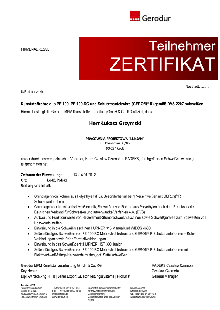 Teilnehmer FIRMENADRESSE ZERTIFIKAT Neustadt, …….. U/Referenz: kh Kunststoffrohre aus PE 100, PE 100-RC und Schutzmantelrohre (GEROfit® R) gemäß DVS 2207 schweißen Hiermit bestätigt die Gerodur MPM Kunststoffverarbeitung GmbH & Co. KG offiziell, dass Herr Łukasz Grzymski PRACOWNIA PROJEKTOWA "LUKSAN" ul. Pomorska 83/85 90-224 Łódź an der durch unseren polnischen Vertreter, Herrn Czeslaw Czarnota – RADEKS, durchgeführten Schweißeinweisung teilgenommen hat. Zeitraum der Einweisung: Ort: Łodź, Polska Umfang und Inhalt: • • • • • • • 13.-14.01.2012 Grundlagen von Rohren aus Polyethylen (PE), Besonderheiten beim Verschweißen mit GEROfit® R Schutzmantelrohren Grundlagen der Kunststoffschweißtechnik, Schweißen von Rohren aus Polyethylen nach dem Regelwerk des Deutschen Verband für Schweißen und artverwandte Verfahren e.V. (DVS) Aufbau und Funktionsweise von Heizelement-Stumpfschweißmaschinen sowie Schweißgeräten zum Schweißen von Heizwendelmuffen Einweisung in die Schweißmaschinen HÜRNER 315 Manual und WIDOS 4600 Selbstständiges Schweißen von PE 100-RC Mehrschichtrohren und GEROfit® R Schutzmantelrohren – RohrVerbindungen sowie Rohr-Formteilverbindungen Einweisung in das Schweißgerät HÜRNER HST 300 Junior Selbstständiges Schweißen von PE 100-RC Mehrschichtrohren und GEROfit® R Schutzmantelrohren mit Elektroschweißfittings/Heizwendelmuffen, ggf. Sattelschweißen Gerodur MPM Kunststoffverarbeitung GmbH & Co. KG Kay Henke Dipl.-Wirtsch.-Ing. (FH) | Leiter Export GB Rohrleitungssysteme | Prokurist Gerodur MPM Kunststoffverarbeitung GmbH & Co. KG Andreas-Schubert-Straße 6 01844 Neustadt in Sachsen Telefon:+49 (0)35 96/58 33-0 Fax: +49 (0)35 96/60 24 04 [email protected] www.gerodur.de Geschäftsführender Gesellschafter: MPM Kunststoffverarbeitung Gesellschaft mbH Geschäftsführer: Dipl.-Ing. Jochen Henke RADEKS Czeslaw Czarnota Czeslaw Czarnota General Manager Registergericht: Dresden HRA 907 USt-Id-Nr.: DE 14 0641615 Steuer-Nr.: 210/154/04008 RADEKS Czesław Czarnota Ul. Chabrowa 1 44-200 Rybnik Tel. 32 426 10 01 Neustadt, dnia 10.04.2012. Rury z tworzywa sztucznego polietylenu PE 100, PE 100-RC oraz rury z płaszczem ochronnym (GEROfit®R) zgrzewane zgodnie z normą Niemieckiego Stowarzyszenia Spawalnictwa DVS 2207 Firma GERODUR MPM Kunststoffverarbeitung GmbH & Co. KG potwierdza oficjalnie, że Pan Łukasz Grzymski PRACOWNIA PROJEKTOWA "LUKSAN" ul. Pomorska 83/85 90-224 Łódź uczestniczył w szkoleniu dot. zgrzewania przeprowadzonym przez naszego polskiego przedstawiciela Pana Czesława Czarnotę – firma RADEKS. Termin szkolenia: 11.-13.04.2012 Miejsce: Łódź, Polska Zakres szkolenia: • Podstawy dot. rur z polietylenu (PE), właściwości dot. zgrzewania rur z płaszczem ochronnym GEROfit®R • Podstawy dot. techniki zgrzewania tworzyw sztucznych, zgrzewania rur z polietylenu wg zasad i norm Niemieckiego Stowarzyszenia Spawalnictwa i Procesów Pokrewnych - DVS (=Deutscher Verband für Schweißen und artverwandte Verfahren e.V.) • Montaż oraz sposób działania zgrzewarki doczołowej oraz urządzeń do zgrzewania elektrooporowego • Instruktaż zgrzewarki HÜRNER 315 Manual oraz WIDOS 4600 • Samodzielne zgrzewanie rur wielowarstwowych z PE 100-RC oraz rur z płaszczem ochronnym GEROfit®R – łączenie samych rur oraz łączenie rur przy użyciu kształtek • Instrukcja obsługi zgrzewarki HÜRNER HST 300 Junior • Samodzielne zgrzewanie rur wielowarstwowych z PE 100-RC oraz rur z płaszczem ochronnym GEROfit®R przy zastosowaniu kształtek elektrooporowych ewent. obejmy siodłowej. Gerodur MPM Kunststoffverarbeitung GmbH & Co. KG RADEKS Czeslaw Czarnota Kay Henke Dipl.-Wirtsch.-Ing. (FH) | Leiter Export GB Rohrleitungssysteme | Prokurist Czeslaw Czarnota General Manager