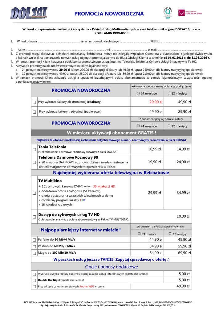 PROMOCJA NOWOROCZNA Wniosek o zapewnienie możliwości korzystania z Pakietu Usług Multimedialnych w sieci telekomunikacyjnej DOLSAT Sp. z o.o. REGULAMIN PROMOCJI 1. 2. 3. 4. 5. 6. Wnioskodawca ..................................................................seria i nr dowodu osobistego .............................................. PESEL:………………………………………………………. Adres……………………………………………………………………………………………….. tel.: ……………………………......………. e-mail: ……………………………………..……………... Z promocji mogą skorzystać pełnoletni mieszkańcy Bełchatowa, którzy nie zalegają względem Operatora z płatnościami z jakiegokolwiek tytułu, a których wnioski na dostarczenie nowych usług objętych promocją wpłyną do Biura Obsługi Klienta w terminie od 01.01.2016 r. do 31.03.2016 r. W ramach promocji Klient korzysta z podłączenia promocyjnego usług: Internet, Telewizja, Telefonia, Cyfrowe Usługi Interaktywne TV HD. Aktywacja promocyjna dla umów zawieranych na okres lojalnościowy: a. 24 pełnych miesięcy wynosi 29,90 zł (upust 270,00 zł) dla opcji eFaktury lub 49,90 zł (upust 250,00 zł) dla faktury tradycyjnej (papierowej) b. 12 pełnych miesięcy wynosi 49,90 zł (upust 250,00 zł) dla opcji eFaktury lub 89,90 zł (upust 210,00 zł) dla faktury tradycyjnej (papierowej) W ramach promocji Klient zakupuje usługi z upustami kształtującymi opłaty abonamentowe w okresie lojalnościowym w wysokości zgodnej z poniższym zestawieniem: Aktywacja - jednorazowa opłata za podłączenie PROMOCJA NOWOROCZNA □ 24 miesiące □ 12 miesięcy □ Przy wyborze faktury elektronicznej (eFaktury) 29,90 zł 49,90 zł □ 49,90 zł 89,90 zł Przy wyborze faktury tradycyjnej (papierowej) Abonament przy wyborze eFaktury PROMOCJA NOWOROCZNA □ 24 miesiące □ 12 miesięcy W miesiącu aktywacji abonament GRATIS ! Najtańsza telefonia z możliwością zachowania dotychczasowego numeru i darmowymi rozmowami w sieci DOLSAT □ □ Tania Telefonia Nielimitowane darmowe rozmowy wewnątrz sieci DOLSAT 10,99 zł 14,99 zł 19,90 zł 24,90 zł Telefonia Darmowe Rozmowy 90 + 90 minut na DARMOWE rozmowy lokalne i międzymiastowe na kierunki stacjonarne do wszystkich operatorów w Polsce. Najchętniej wybierana oferta telewizyjna w Bełchatowie TV Multikino + 101 cyfrowych kanałów DVB-T, w tym 30 w jakości HD □ + + + + □ Dostęp do cyfrowych usług TV HD dodatkowa oferta analogowa (51 kanałów) oferta dostępna na wszystkich telewizorach w domu codzienny program lokalny TKB 16 kanałów radiowych 29,99 zł 34,99 zł 10,00 zł Opłata pobierana wraz z opłatą abonamentową za Pakiet TV MULTIKINO. Najpopularniejszy Internet w mieście ! Abonament z eFakturą przy umowie na □ 24 miesiące □ Perfetto do 30 Mb/4 Mb/s □ Passion do 60 Mb/5 Mb/s □ Magic do 100 Mb/10 Mb/s □ 12 miesięcy 44,90 zł 49,90 zł 54,90 zł 59,90 zł 64,90 zł 69,90 zł W paczkach usług jeszcze TANIEJ! Zapytaj sprzedawcę o ofertę :) Opcje i bonusy dodatkowe □ Wydruk i wysyłka faktury papierow ej przy zakupie usług internetow ych (opłata miesięczna) □ Double The Night (opłata miesięczna) □ Przy zakupie usług internetowych Router WIFI w cenie 5,00 zł 5,00 zł 49,90 zł PROMOCJA NOWOROCZNA Cyfrowe Usługi Interaktywne TV HD □ □ Abonament przy umowie na 12 miesięcy PAKIET DOLSAT HD PLUS > 55 kanałów cyfrowych, w tym 35 jakości HD PAKIET CANAL+ PRESTIGE HD > 8 kanałów cyfrowych w jakości HD 49,90 zł 49,90 zł 10,00 zł Dostęp do Cyfrowych Usług Interaktywnych TV HD za pomocą Terminala HD Aktywacja i opcje dodatkowe dla Cyfrowych Usług □ □ Aktywacja TERMINALA HD (opłata jednorazowa): 49,90 zł Aktywacja dodatkowego TERMINALA HD (opłata jednorazowa): 49,90 zł Dostęp do pakietu MULTIKINO w jakości cyfrowej □ □ □ 7. 8. 9. 10. 11. 12. 13. 14. 15. 16. 17. 18. 19. 20. 21. 22. Abonament dla Abonentów nie posiadających usługi MULTIKINO DVB-T 39,90 zł dla Abonentów posiadających pakiet MULTIKINO DVB-T GRATIS MULTIROOM CYFROWY HD 12,00 zł W przypadku wyboru faktury tradycyjnej (papierowej) opłaty abonamentowe za usługi internetowe wyższe od zaprezentowanych w ww. tabeli o 5,00 zł. W miesiącu aktywacji abonament GRATIS. Jeśli Abonent nie wypowie Umowy lub nie podejmie renegocjacji na nowych warunkach promocji, po okresie lojalnościowym, określonym w załączniku do umowy, opłata abonamentowa zgodna z Cennikiem Usług Multimedialnych. W przypadku pierwszej Umowy z Abonentem zawieranej na maksymalny okres 24 miesięcy, Umowa wygasa z upływem początkowego okresu obowiązywania, a sygnał usług zostaje wstrzymany chyba, że Abonent podejmie renegocjację na warunkach nowego Regulaminu promocji na kolejne okresy lojalnościowe przed upływem tego okresu. W przypadku, gdy umowa zawierana jest poza lokalem Operatora, Abonent może od niej odstąpić bez podania przyczyny w terminie 14 dni od jej zawarcia składając stosowne oświadczenie w formie pisemnej. W razie odstąpienia od Umowy, jest ona uznana za niezawartą, a Abonent jest zwolniony z wszelkich zobowiązań. Operator zastrzega, iż z Promocji wyłączone są posesje, na których Operator nie posiada infrastruktury telekomunikacyjnej, a ponadto nie spełniające warunków technicznych niezbędnych do świadczenia usług multimedialnych. Przystępując do niniejszej promocji z opcją eFaktura Abonent oświadcza, iż, zgodnie z Rozporządzeniem Ministra Finansów z dnia 17 .12.2010 (Dz. U. nr 249 poz. 1661) akceptuje przesyłanie w formie elektronicznej, w tym udostępnianie w Panelu Abonenta na www.dolsat.pl, faktur z tytułu usług świadczonych przez Operatora ze wszystkimi prawnymi skutkami doręczenia. Abonent również oświadcza, że przyjmuje do wiadomości, iż Operator, będzie przesyłać wystawione faktury na wskazany adres e-mail oraz, że zapoznał się 