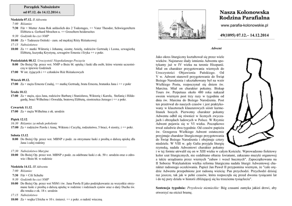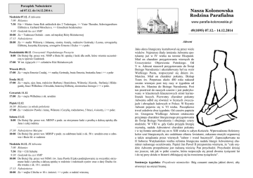 Porządek Nabożeństw od 07.12. do 14.12.2014 r. Niedziela 07.12. II Adwentu 7:00 Różaniec 7:30 Für + Mutter Anna Rok anlässlich des 2 Todestages, ++ Vater Theodor, Schwiegereltern Elżbieta u. Gerhard Mrochen u. ++ Groseltern beiderseites 9:30 Godzinki ku czci NMP 10:00 Za + Tadeusza Osiński - zam. od męskiej Róży Różańcowej 17:15 Nabożeństwo 18:00 Za ++ matki Wiktorię i Johannę, siostrę Anielę, rodziców Gertrudę i Leona, szwagierkę Elżbietę, kuzynkę Krystynę, szwagrów Ernesta i Eryka ++ z pokr. Poniedziałek 08.12. Uroczystość Niepokalanego Poczęcia 8:00 Do Bożej Op. przez wst. NMP o Boże bł. opiekę i łaski dla osób, które wiernie uczestniczą w śpiewie Godzinek 17:00 W int. żyjących i ++ członków Róż Różańcowych Wtorek 09.12. 17:00 Za + męża Ernesta Czudaj, ++ matkę Gertrudę, brata Ernesta, bratanka Jana i ++ z pokr Środa 10.12. 17:00 Za + męża, ojca Jana, rodziców Barbarę i Stanisława, Wiktorię i Karola, Stefanię i Hildegardę, braci Wilhelma i Oswalda, bratową Elżbietę, siostrzeńca Jerzego i ++ z pokr. Czwartek 11.12. 17:00 Za + męża Wilhelma z ok. urodzin Piątek 12.12. 16:30 Różaniec za młode pokolenie 17:00 Za + rodziców Pawła i Annę, Wiktora i Cecylię, rodzeństwo, 5 braci, 4 siostry, i ++ pokr. Sobota 13.12. 8:00 Do Bożej Op. przez wst. MBNP z podz. za otrzymane łaski z prośbą o dalszą opiekę dla Jana i całej rodziny ————————–—–———————————————————————— 17:30 Nabożeństwo Maryjne 18:00 Do Bożej Op. przez wst. MBNP z podz. za odebrane łaski z ok. 50 r. urodzin oraz o zdrowie i Boże bł. w rodzinie Niedziela 14.12. III Adwentu 7:00 Różaniec 7:30 Für + Cili Schulte 9:30 Godzinki ku czci NMP 10:00 Do Bożej Op. przez wst NSM i św. Jana Pawła II jako podziękowanie za wszystkie otrzymane łaski z prośbą o dalszą opiekę w rodzinie i rodzinach synów oraz o dary Ducha św. dla wnuka z ok. 18 r. urodzin 17:15 Nabożeństwo 18:00 Za + wujka Ulricha w 10 r. śmierci. ++ z pokr. o radość wieczną Nasza Kolonowska Rodzina Parafialna www.parafia-kolonowskie.pl 49(1095) 07.12.– 14.12.2014 Adwent Jako okres liturgiczny kształtował się przez wiele wieków. Najstarsze ślady istnienia Adwentu spotykamy już w IV wieku na terenie Hiszpanii. Miał on charakter przygotowania wiernych do Uroczystości Objawienia Pańskiego. Od V w. Adwent stanowił przygotowanie do Świąt Bożego Narodzenia i ukształtowany był na wzór Wielkiego Postu, rozpoczynał się dniem św. Marcina. Miał on charakter pokutny. Biskup Tours św. Perpetuus około 480 roku nakazał swoim wiernym post trzy razy w tygodniu od dnia św. Marcina do Bożego Narodzenia. Post ten przetrwał do naszych czasów i jest praktykowany w klasztorach klauzurowych sióstr karmelitanek bosych. Pierwotny charakter pokutny Adwentu odbił się również w licznych zwyczajach i obrzędach ludowych w Polsce. W Rzymie Adwent pojawia się w VI wieku. Początkowo trwał zaledwie dwa tygodnie. Od czasów papieża św. Grzegorza Wielkiego Adwent ostatecznie przyjmuje charakter liturgicznego przygotowania do Świąt Bożego Narodzenia i obejmuje cztery niedziele. W VIII w. gdy Galia przyjęła liturgię rzymską, nadała Adwentowi charakter pokutny i w tej formie utrwalił się on w XIII wieku w całym Kościele. Wprowadzono fioletowy kolor szat liturgicznych, nie ozdabiano ołtarza kwiatami, zakazano muzyki organowej a także urządzania przez wiernych "zabaw i wesel hucznych". Zapoczątkowana na II Soborze Watykańskim wielka reforma liturgiczna nadała liturgii Adwentowej charakter radosnego oczekiwania. Papież Jan Paweł II przypomina wiernym, że "całe orędzie Adwentu przepełnione jest radosną wieścią: Pan przychodzi. Przychodzi dzisiaj raz jeszcze, tak jak w pełni czasów, która rozpoczęła się przed dwoma tysiącami lat i do tej pory działa w historii zbliżającej się ku trzeciemu tysiącleciu". Sentencja tygodnia: Przysłowie niemieckie: Bóg czasami zamyka jakieś drzwi, aby otworzyć na oścież bramę. 49/2014 Ocieplenie i malowanie naszej świątyni: stan ofiar składanych na ten cel, za które składamy gorące podziękowania: ofiara 156 rodzin = 32.479 zł. 2 razy zebrany złom = 4.037 zł. 2 kolekty w kościele = 15.874 zł. wpłata firmy Mercur = 5.000 zł. Razem = 57.300 zł. Zakup wełny = 21.000 zł. Pozostaje więc - 36.300 zł. Od poniedziałku rozpoczną się prace nad ocieplenia naszej świątyni. Potrwają do świąt Bożego Narodzenia. Polecam te nie łatwe prace pamięci w modlitwie. Kolekta w świątyni, na ten cel, będzie zbierana w świątyni 28.12.2014 roku. Zachęcam też do dalszych wpłat na konto bankowe i przypominam, że tę darowiznę można odliczyć od podatku. Malowanie świątyni planowane jest na miesiąc wrzesień 2015 roku. ————————–——–—–———————————— Ilość parafian zaangażowanych w grupach: Rodzina Różańcowa – 244; PRD – 10; Caritas – 26; Biblioteka – 4; Bractwo św. Józefa – 3; Serduszka – 8; Margaretka – 11; Szafarze – 10; Organiści – 4; Orkiestra - 16; Chór - 32; Lektorzy – 11; Kierowcy busa – 8; Marianki -28; Ministranci – 28 Ostatnio powstała też grupa Szkaplerza NMP. Jest to grupa ponad stu osobowa. Prośba, aby donieść kartki, które otrzymaliśmy przy wręczeniu Szkaplerza. Prośba również do tych, którzy otrzymali Szkaplerz w przeszłości, aby zgłaszali się do siostry przełożonej w zakrystii, aby zapisać się do parafialnej księgi Szkaplerza. ————————–——–—–———————————— Dziękujemy za nabywanie każdego tygodnia gazetki parafialnej, a Tym, którzy ją czytają, tym bardziej. Każdego tygodnia drukowanych jest 450 egzemplarzy. Dziękujemy za odwiedzanie naszej strony www. W miesiącu listopadzie odwiedzin na stronie było 2.800. ————————–——–—–—