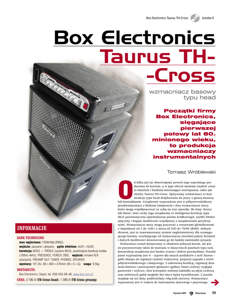 Box Electronics Taurus TH-Cross ścieżka 6 Box Electronics Taurus TH-Cross wzmacniacz basowy typu head Początki firmy Box Electronics, sięgające pierwszej połowy lat 80. minionego wieku, to produkcja wzmacniaczy instrumentalnych Tomasz Wróblewski O INFORMACJE DANE TECHNICZNE moc wyjściowa: 750W/4Ω (RMS); wejścia: pasywne i aktywne; pętle efektów: AUX1 i AUX2; korekcja: BASS + TREBLE (system MLO), przestrajana korekcja środka (100Hz-4kHz), PRESENCE, PUNCH, DBS; wyjścia: liniowe XLR (pre/post), PREAMP OUT, TUNER, PHONES, SPEAKER; wymiary: 19”/2U, 88×483×370mm (W×S×G); waga: 9,5kg DOSTARCZYŁ Box Electronics, Sopot, tel. 058-550-66-46, www.box.com.pl CENA 3 190 zł (TH-Cross head), 1 390 zł (TH-Cross preamp) d kilku już lat obserwujemy powrót tego sopockiego producenta do korzeni, a w jego ofercie możemy znaleźć coraz to śmielsze i bardziej interesujące rozwiązania, takie jak choćby Taurus TH-Cross. Opisywany wzmacniacz to konstrukcja typu head dedykowana do pracy z gitarą basową lub kontrabasem. Urządzenie wyposażone jest w półprzewodnikowy przedwzmacniacz z blokiem lampowym i dwa wzmacniacze mocy, które mogą współpracować ze sobą na trzy sposoby: Bi-Amp, Stereo lub Mono. Inne cechy tego urządzenia to inteligenta korekcja typu MLO (automatyczna optymalizacja pasma środkowego), szybki limiter optyczny i bogate możliwości współpracy z urządzeniami peryferyjnymi. Wzmacniacze mocy mogą pracować z zestawami głośnikowymi o impedancji od 2 do 16Ω i z mocą od 200 do 750W (RMS). Jednym słowem, jest to zaawansowany system nagłośnieniowy dla wymagającego basisty, oczekującego od wzmacniacza szerokiej palety brzmień i dużych możliwości dostosowania go do każdej zaistniałej sytuacji. Wzmacniacz został dostarczony w obudowie pokrytej kocem, ale jest on przystosowany także do montażu w klasycznych panelach typu rack. Konstrukcja urządzenia jest bardzo zwarta i dobrze przemyślana. Przedni panel wyposażony jest w – typowe dla innych produktów z serii Taurus – gałki służące do regulacji czułości wejściowej, proporcji sygnału z torów półprzewodnikowego i lampowego, 3-zakresową korekcję, regulację działania limitera i potencjometr głośności ogólnej. Panel czołowy wygląda gustownie i stylowo, choć krawędzie srebrnej nakładki na płytę czołową oraz niektórych gałek mogłyby być nieco lepiej wyszlifowane. Z przodu znajduje się też duży, podświetlany włącznik sieciowy. Wzmacniacz wyposażony jest w wejścia do instrumentu aktywnego i pasywnego. Styczeń 2007 Gitarzysta 59 Box Electronics Taurus TH-Cross ścieżka 6 Z pomocą korekcji jesteśmy w stanie uzyskać prak- tycznie każdy rodzaj brzmienia basu – od tubalnego, poprzez mięsisty z wyraźnym i czytelnym środkiem, aż po kąśliwy, idealny do grania techniką slap Tuż obok wejść umieszczono otwory wentylacyjne, przez które możemy podziwiać podświetloną na czerwono lampę przedwzmacniacza. Otwory wentylacyjne biegną też wzdłuż górnej części panelu czołowego. Przez nie zasysane jest powietrze do chłodzenia stopnia mocy, dlatego też są one od środka zabezpieczone warstwą gąbki powstrzymującej kurz i drobiny pyłu przed dostaniem się do wnętrza. PRZEDWZMACNIACZ Sygnał z instrumentu (pasywnego lub aktywnego) kierowany jest na półprzewodnikowy blok wzmocnienia napięciowego, wyposażony w regulator czułości wejściowej. Sygnał za tym blokiem trafia do układu lampowego o wzmocnieniu bliskim jedności (czyli mówiąc prościej, nie wzmacniającego sygnału, a jedynie wzbogacającego go o specyficzne zniekształcenia i lekką, typową dla lampy kompresję). Regulatorem MIX ustawia się proporcję między sygnałem z wyjścia półprzewodnikowego bloku wzmocnienia wstępnego a sygnałem z wyjścia układu lampowego. Linią przerywaną na skali potencjometru GAIN zaznaczono zakres ustawień, przy których ma miejsce zjawisko nasycenia układu lampowego. Umieszczony poniżej Użyte w czasie testów zestawy głośnikowe BS-210 (2×10” – 1 990 zł) oraz BS-115 (1×15” – 2 490 zł) zbudowano na głośnikach neodymowych marki SICA (co nie pozostało bez wpływu na ich niewielką wagę i wysoką sprawność) oraz pojedynczym driverze wysokotonowym, współpracującym z symetryczną tubą. Driver można wyłączyć albo włączyć z dwiema głośnościami jego pracy: CONCERT (głośniej) lub STUDIO (ciszej). Zestaw na głośniku 15-calowym oferuje głęboki, czytelny i mięsisty bas, i powinien zdobyć uznanie użytkowników ceniących tego typu powłóczyste i klejące się do podłoża brzmienie basu. Zestaw na dwóch dziesiątkach charakteryzuje się jasną, ale mocną i bardzo sprężystą barwą, o zdecydowanie bardziej uniwersalnym charakterze. Nie odkryję jednak Ameryki jeśli stwierdzę, że zdecydowanie najlepiej oba zestawy sprawdzają się, pracując razem. W połączeniu ze wzmacniaczami TH-Cross w trybie Bi-Amp (każdy zestaw zasilany z oddzielnego wzmacniacza z możliwością regulacji proporcji) jesteśmy w stanie uzyskać praktycznie każdy rodzaj brzmienia basu. 60 Gitarzysta Styczeń 2007 gałki MIX przycisk PUNCH to klasyczny filtr podbijający pasmo niskiego środka sprawiającego, że brzmienie basu staje się bardziej okrągłe, cieplejsze i w niektórych przypadkach lepiej współbrzmi z pozostałymi instrumentami. Korekcja Taurus TH-Cross to układ trzypasmowy z przestrajaną częstotliwością środkową (można zresztą ten zakres całkowicie wyłączyć przyciskiem ON) i trzema dodatkowymi filtrami. Owe filtry załącza się przyciskami DBS (Dynamic Bass System – dynamiczne podbicie częstotliwości basowych, własne rozwiązanie Box Electronics często stosowane w produktach tej firmy), BOOST (dodatkowe podbicie basów przez układ DBS) oraz PRESENCE (rozjaśnienie brzmienia instrumentu przez podkreślenie wysokiego środka). Na uwagę zasługuje zastosowany we wzmacniaczu system korekcji MLO