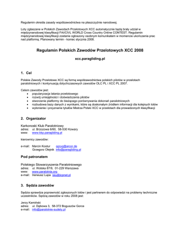 Regulamin określa zasady współzawodnictwa na płaszczyźnie narodowej. Loty zgłaszane w Polskich Zawodach Przelotowych XCC automatycznie będą brały udział w międzynarodowej klasyfikacji FAI/CIVL WORLD Cross Country Online CONTEST. Regulamin międzynarodowej klasyfikacji zostanie ogłoszony osobnym komunikatem w momencie ukończenia prac nad platformą. Planowany termin - koniec stycznia 2008. Regulamin Polskich Zawodów Przelotowych XCC 2008 xcc.paragliding.pl 1. Cel Polskie Zawody Przelotowe XCC są formą współzawodnictwa polskich pilotów w przelotach paralotniowych i kontynuacją dotychczasowych zawodów OLC PL i XCC PL 2007. Celem zawodów jest: • popularyzacja latania przelotowego • rozwój umiejętności i doświadczenia pilotów • stworzenie platformy do bieżącego porównywania dokonań paralotniowych • rozbudowa bazy danych z wynikami, które są doskonałym źródłem informacji dla kolejnych lotów • wyłonienie i przyznanie tytułów Mistrza Polski XCC w przelotach dla prowadzonych klasyfikacji 2. Organizator Karkonoski Klub Paralotniowy adres: www: ul. Brzozowa 6/60, 58-530 Kowary www.kkp.paragliding.pl kierownicy zawodów: e-mail: Marcin Kostur [email protected] Grzegorz Olejnik [email protected] Pod patronatem Polskiego Stowarzyszenia Paralotniowego adres: ul. Wolska 87/9, 01-229 Warszawa www: www.paralotnia.org e-mail: Ireneusz Lupa [email protected] 3. Sędzia zawodów Sędzia sprawdza poprawność zgłoszonych lotów i jest partnerem do odpowiedzi na problemy techniczne uczestników. Sędzią zawodów w roku 2008 jest: Jerzy Kamiński adres: ul. Dębowa 3, 58-372 Boguszów Gorce e-mail: [email protected] 4. Rada pilotów Rada pilotów jest ciałem doradczym Organizatora i Sędziego. Jej zadaniem jest pomoc w opracowaniu szczegółowych zasad dotyczących regulaminu, przestrzeni powietrznej i innych kwestii obowiązujących w danym sezonie. Uczestnicy zawodów mogą się odwoływać od decyzji sędziego w sprawie protestów do Rady pilotów. Jej decyzja jest ostateczna. W przypadku rozpatrywania odwołania złożonego przez któregoś z członków rady – zostanie on wyłączony w tej sprawie z prawa głosu. Skład rady w sezonie 2008: Paweł Faron Krzysztof Ziółkowski Robert Zbela Tomek Machałowski Robert Wójcicki Sławomir Kędziak [email protected] [email protected] [email protected] [email protected] [email protected] [email protected] 5. Uczestnictwo W zawodach mogą brać udział wszyscy piloci deklarujący narodowość polską w zgłoszeniu do zawodów oraz posiadający stosowne, wymagane prawem uprawnienia do wykonywania lotu i ubezpieczenia. Rejestracja w zawodach odbywa się przy użyciu formularza zgłoszeniowego znajdującego się na stronie http://xcc.paragliding.pl . Rejestracja oznacza zgodę uczestnika na stosowanie postanowień niniejszego regulaminu. Uczestnictwo w Polskich Zawodach Przelotowych XCC w sezonie 2008 jest darmowe. XCC 2008 jest finansowane ze środków Karkonoskiego Klubu Paralotniowego oraz przy udziale sponsorów. Warunki korzystania z powierzchni reklamowej dla sponsorów i uruchomienia firmowego logo producenta zostaną ogłoszone osobnym komunikatem ma stronie KKP. 6. Sprzęt Uczestnicy odpowiadają osobiście za sprawność techniczną i zdolność do lotu używanego sprzętu. Sprzęt podzielony jest na klasy w zależności od posiadanego atestu bezpieczeństwa i związanej z nim klasy osiągów. W roku 2008 będzie prowadzona klasyfikacja w następujących klasach: • „klasa Otwarta” (Paraglider Overall) - wszystkie paralotnie (FAI-3) • „klasa Sportowa” (Paraglider Sport) - przeloty dokonane na paralotniach z atestem DHV 2, AFNOR standard, CEN C lub niższym • „klasa Rekreacyjna” (Paraglider Fun and Safety) - przeloty dokonane na paralotniach z atestem DHV 1-2, CEN B lub niższym • „klasa Tandem” (Paraglider Tandem) - przeloty na paralotniach posiadających dopuszczenia DHV, AFNOR, CEN dla dwóch osób. Przy zgłaszaniu takiego przelotu należy w uwagach podać imię i nazwisko pasażera. W przypadku, jeżeli paralotnia posiada różne dopuszczenia decydującym jest w kolejności: 1. atest DHV 2. atest CEN 3. atest AFNOR W wyjątkowych przypadkach, gdy model paralotni w jednym rozmiarze posiada atest kwalifikujący do niższej klasy, organizator po konsultacji z radą pilotów może zdecydować o zaliczeniu go do wyższej klasy. Za prawidłowe zakwalifikowanie swoich lotów do odpowiedniej klasy odpowiedzialny jest uczestnik. Zmiana sprzętu i start w różnych klasach podczas trwania sezonu jest dozwolona. 7. Czas trwania zawodów Regulamin obowiązuje od 1.01.2008. Sezon rozpoczyna się rokrocznie 1 października i kończy 30 września. Aby zachować kontynuację wyników organizator dopuszcza do udziału w rywalizacji loty zgłoszone w okresie od 1.10.2007 do 31.12.2007. 8. Dokumentacja Oceniane są jedynie przeloty wykonane na paralotniach w locie swobodnym (bez napędu). Start do lotu może odbywać się w górach bądź z użyciem urządzenia holującego. Dokumentowanie przelotów odbywa się za pomocą urządzenia GPS z funkcją zapisu śladu w postaci pozycji i wysokości. Pilot powinien dopilnować, aby zapis lotu odbywał się w sposób ciągły. Najmniejsza częstotliwość zapisu wynosi 60 sekund. Zaleca się częstotliwość zapisu 5 do 15 s. Maksymalnie dwa błędy GPS polegające na braku zapisu śladu w locie przez maksymalnie 15 minut mogą być zaakceptowane przez sędziego narodowego. Przerwa w zapisie śladu o długości powyżej 15 minut powoduje dyskwalifikacje lotu. 9. Zgłaszanie lotów Zgłaszanie lotów odbywa się za pomocą strony www pod adresem http://xcc.paragliding.pl . Aplikacja obecna na stronie automatycznie dokonuje weryfikacji lotu i oblicza maksymalną ilość punktów za lot. Loty należy zgłaszać w postaci pliku w formacie IGC z zapisem śladu. Plik IGC musi posiadać poprawną sumę kontrolna tzw. G-record, utworzony przez jeden z programó