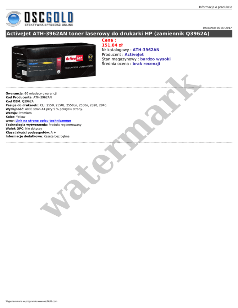 Informacje o produkcie Utworzono 07-03-2017 ActiveJet ATH-3962AN toner laserowy do drukarki HP (zamiennik Q3962A) Cena : 151,84 zł er m ar k Nr katalogowy : ATH-3962AN Producent : ActiveJet Stan magazynowy : bardzo wysoki Średnia ocena : brak recenzji w at Gwarancja: 60 miesięcy gwarancji Kod Producenta: ATH-3962AN Kod OEM: Q3962A Pasuje do drukarek:: CLJ: 2550, 2550L, 2550Ln, 2550n, 2820, 2840. Wydajność: 4000 stron A4 przy 5 % pokryciu strony. Wersja: Premium Kolor: Yellow www: Link na stronę opisu technicznego Technologia wytworzenia: Produkt regenerowany Wałek OPC: Nie dotyczy Klasa jakości podzespołów: A + Informacje dodatkowe: Kaseta bez bębna Wygenerowano w programie www.oscGold.com
